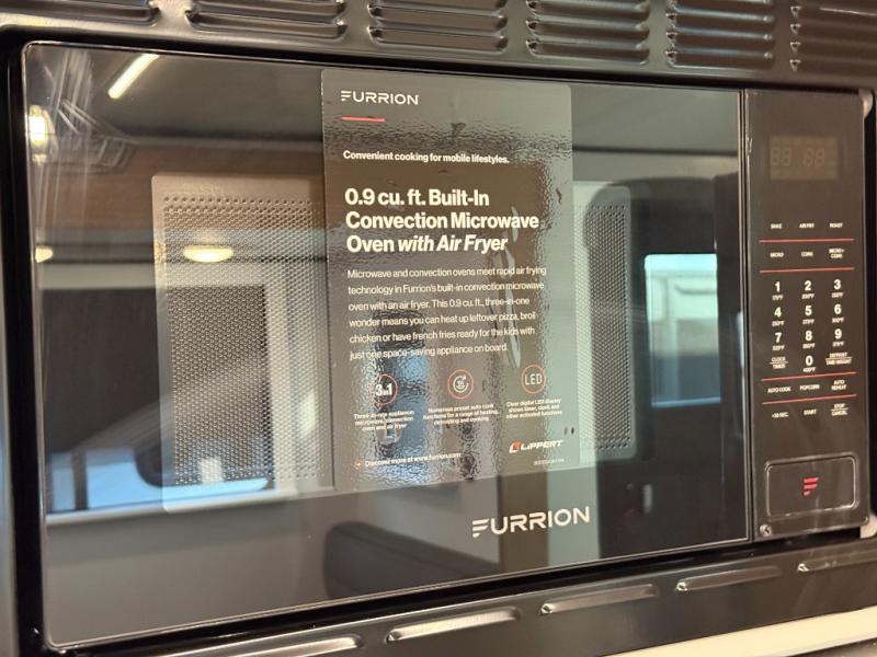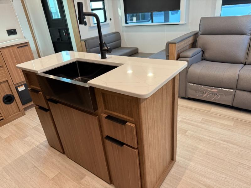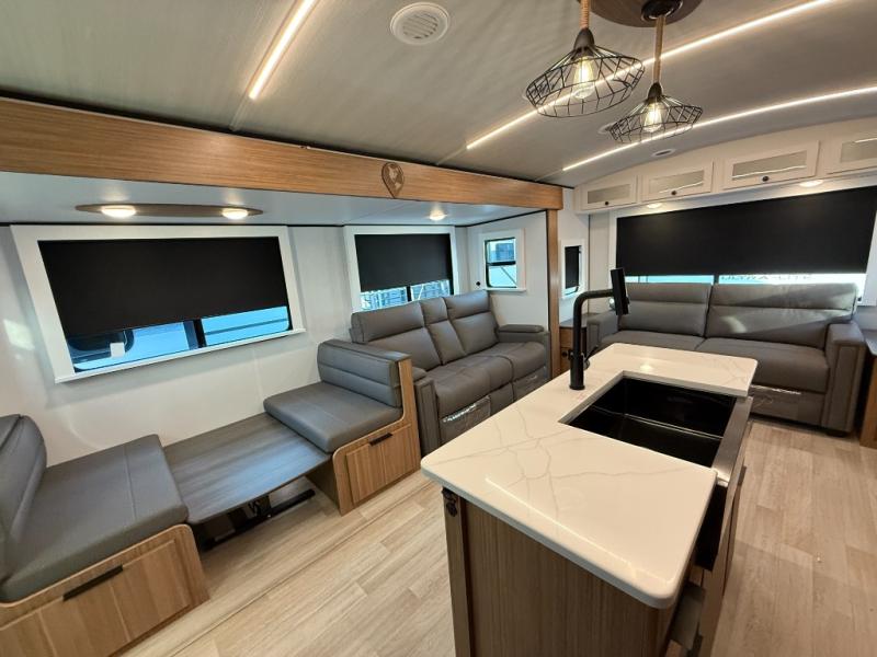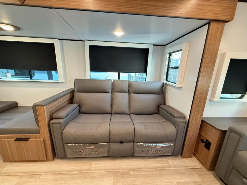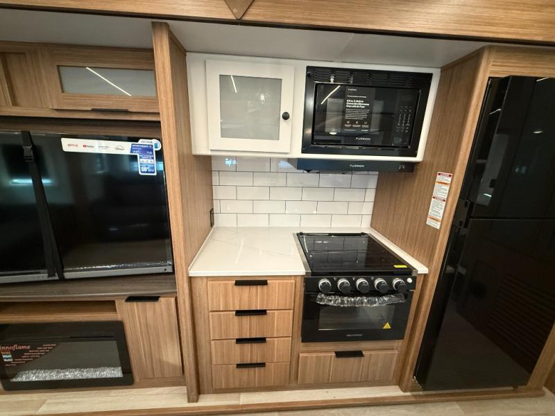 You will feel right at home in this travel trailer! The front private bedroom has a king bed slide to lay your head on at night, a front closet with washer and dryer prep, plus a dresser with a flip-up top and TV prep. Just outside the bedroom is the full bathroom with a shower with a skylight for added natural lighting as you get ready. Now that you're ready for the day, you can head to the fully equipped kitchen complete with a kitchen island to whip up some delicious cinnamon rolls that can be enjoyed at the Do-More Dinette table. The rear living area not only has luxury cinema recliners, but also a tri-fold sofa by an entertainment center with a fireplace!