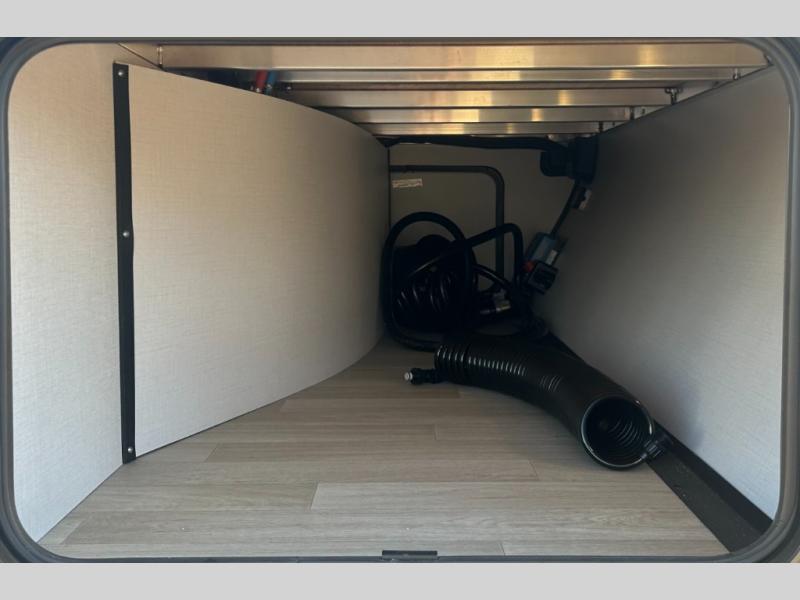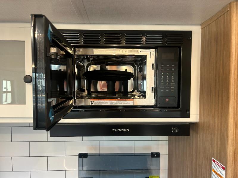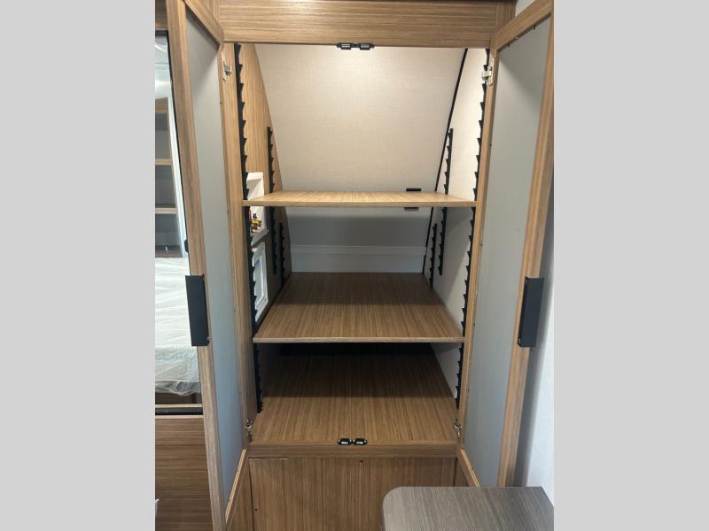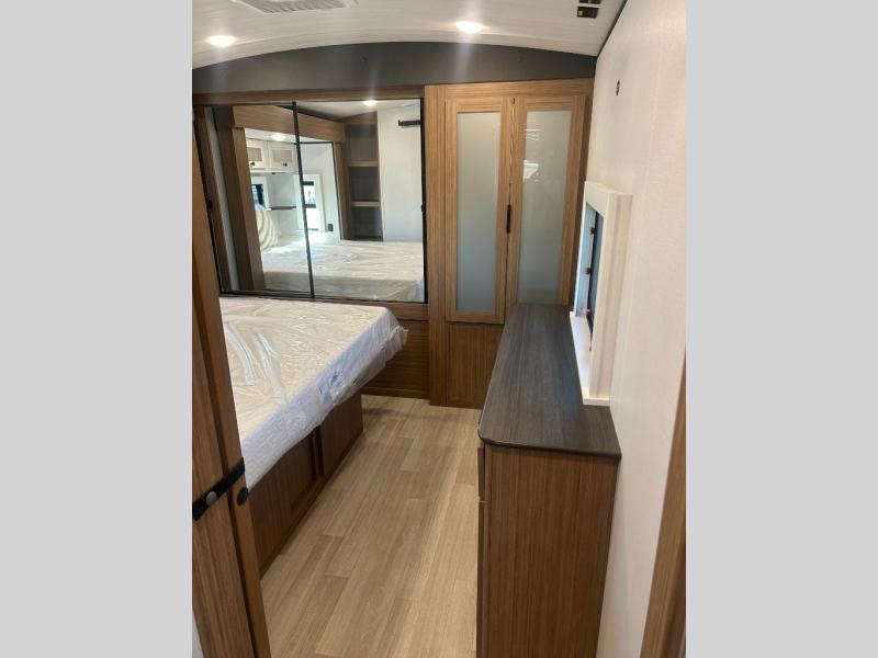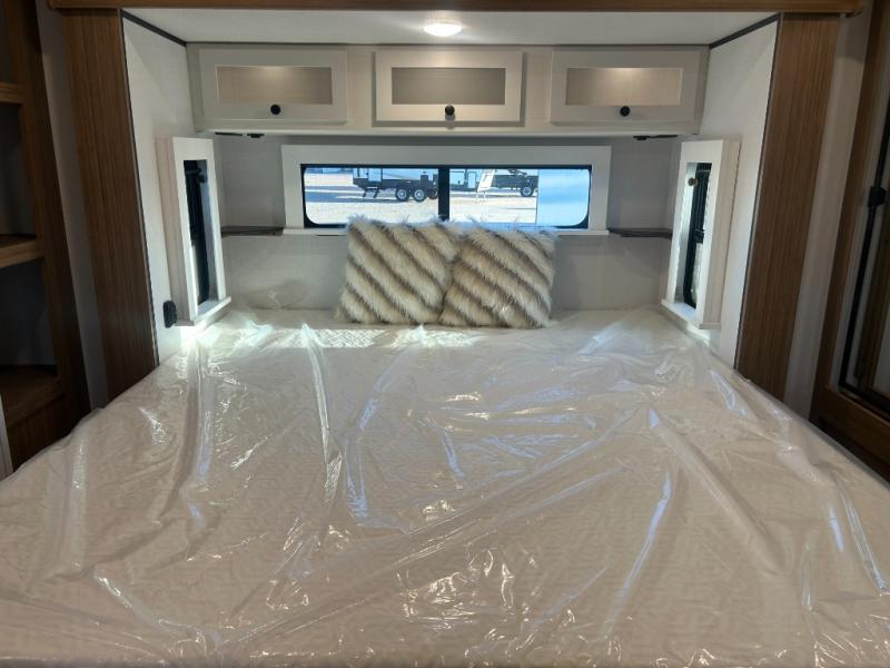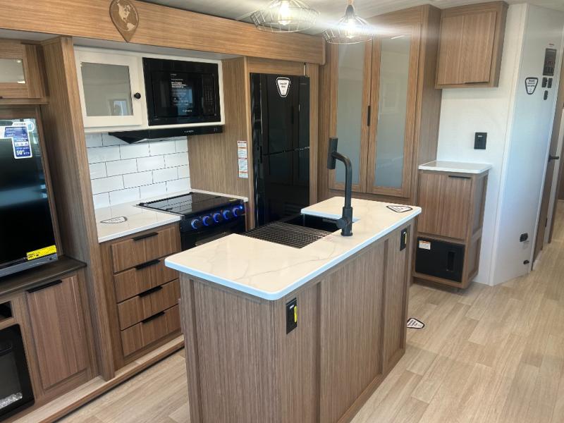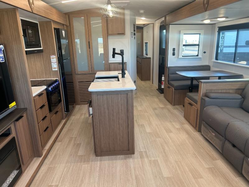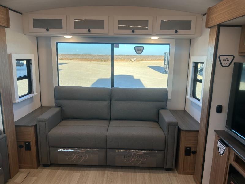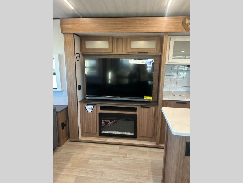 You will feel right at home in this travel trailer! The front private bedroom has a king bed slide to lay your head on at night, a front closet with washer and dryer prep, plus a dresser with a flip-up top and TV prep. Just outside the bedroom is the full bathroom with a shower with a skylight for added natural lighting as you get ready. Now that you're ready for the day, you can head to the fully equipped kitchen complete with a kitchen island to whip up some delicious cinnamon rolls that can be enjoyed at the Do-More Dinette table. The rear living area not only has luxury cinema recliners, but also a tri-fold sofa by an entertainment center with a fireplace!
