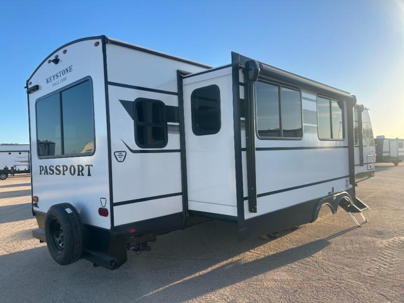 Each one of these Keystone RV Passport travel trailers offer grand style and multi-functional features! They have best-in-class storage for big things like paddle boards and small things like sleeping bags. There's no need for cordless drills and bending over to put the jacks down, simply push a button and the power stabilizer jacks do the rest. The one piece polypropylene underbelly and extended season camping package helps protect your unit's vitals in different weather conditions. Exclusive to Keystone is the Tru-fit slide construction and the Hyper Deck flooring which is more resilient, stronger and lighter than the traditional laminated wood construction, plus it resists water and water damage. Inside, you'll find residential durable Beauflor vinyl flooring, deluxe night shades, bedside outlets/USB ports, and a bath skylight for more natural light and additional head room.