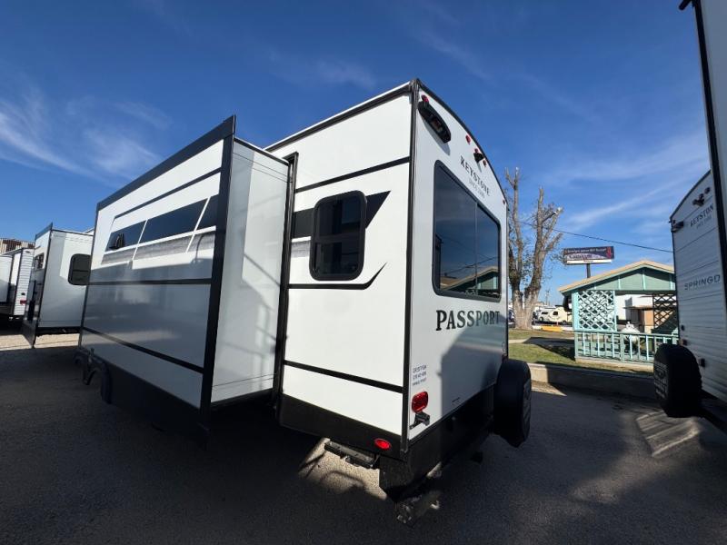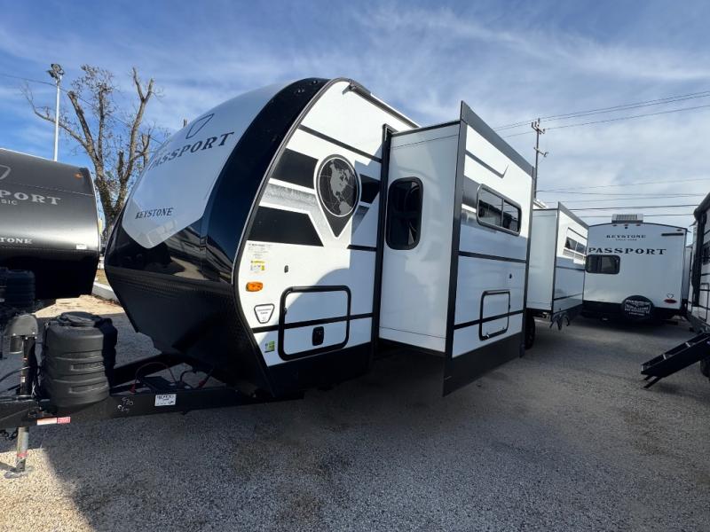 Each one of these Keystone RV Passport travel trailers offer grand style and multi-functional features! They have best-in-class storage for big things like paddle boards and small things like sleeping bags. There's no need for cordless drills and bending over to put the jacks down, simply push a button and the power stabilizer jacks do the rest. The one piece polypropylene underbelly and extended season camping package helps protect your unit's vitals in different weather conditions. Exclusive to Keystone is the Tru-fit slide construction and the Hyper Deck flooring which is more resilient, stronger and lighter than the traditional laminated wood construction, plus it resists water and water damage. Inside, you'll find residential durable Beauflor vinyl flooring, deluxe night shades, bedside outlets/USB ports, and a bath skylight for more natural light and additional head room.