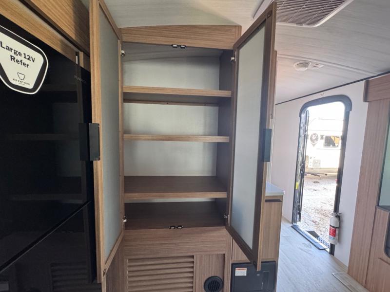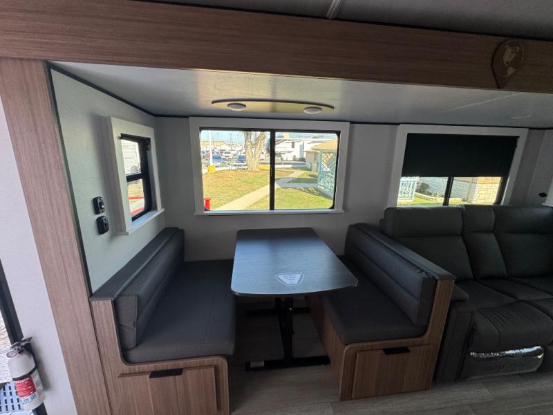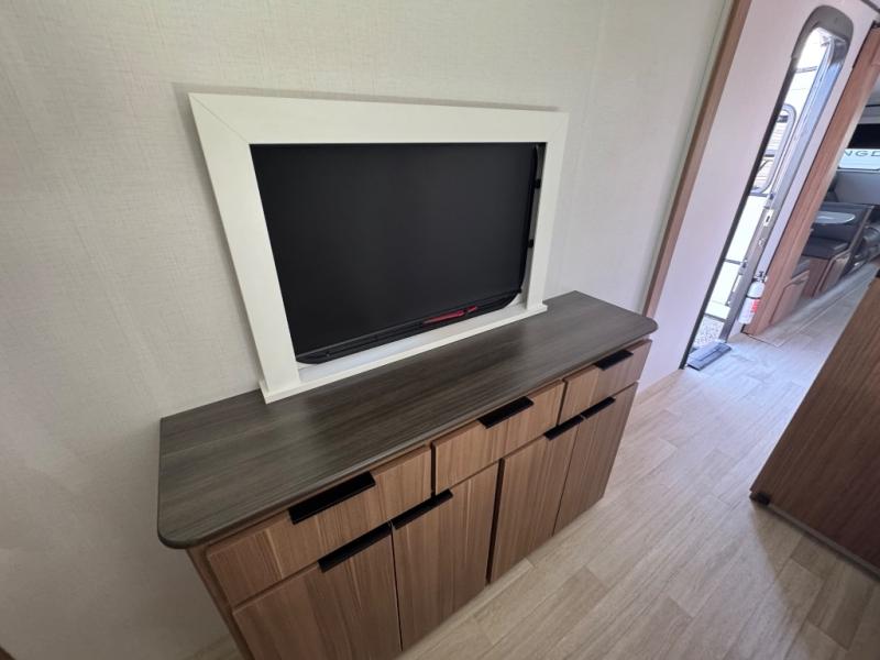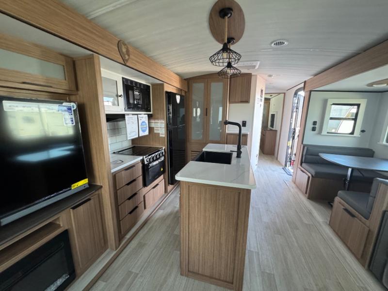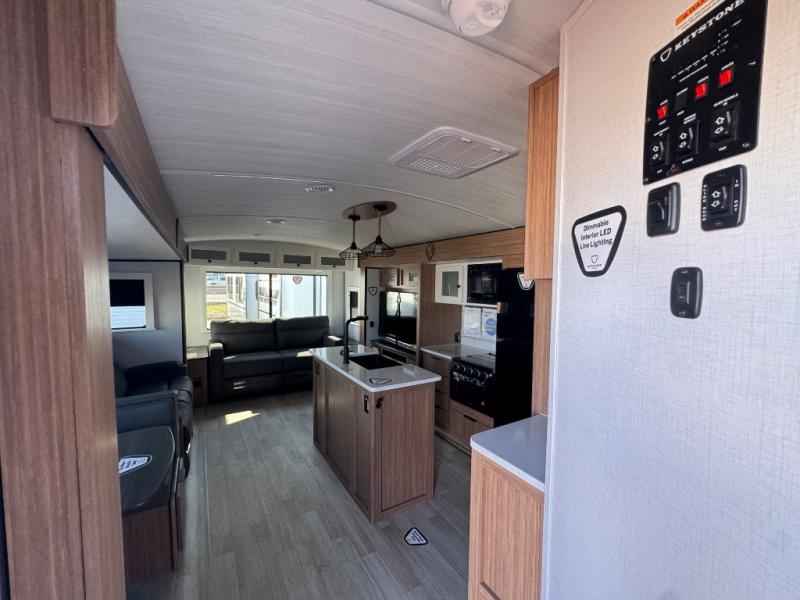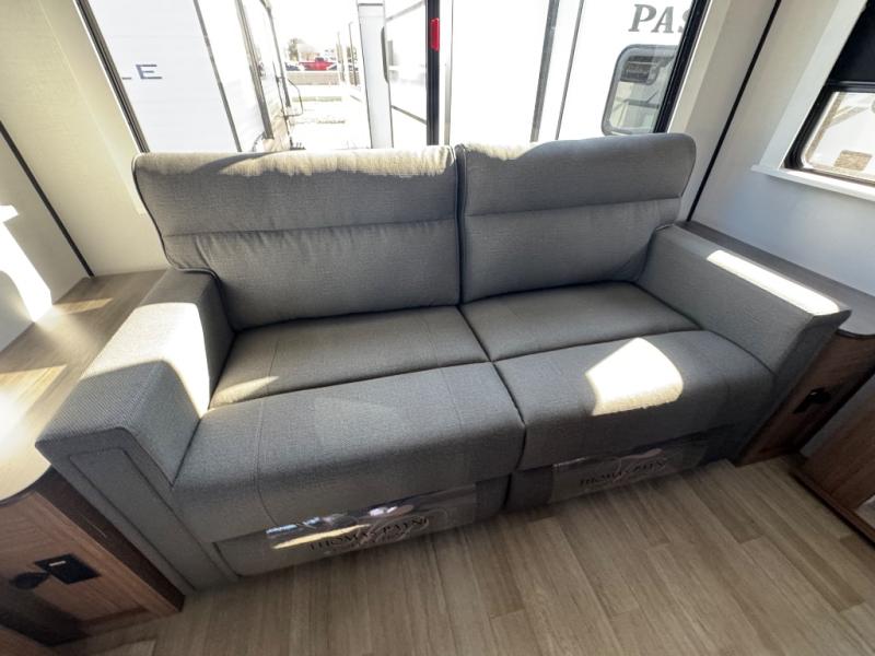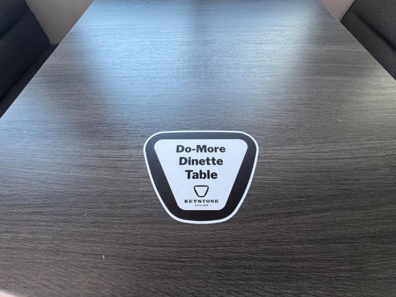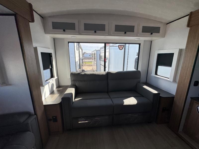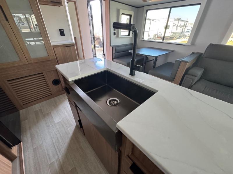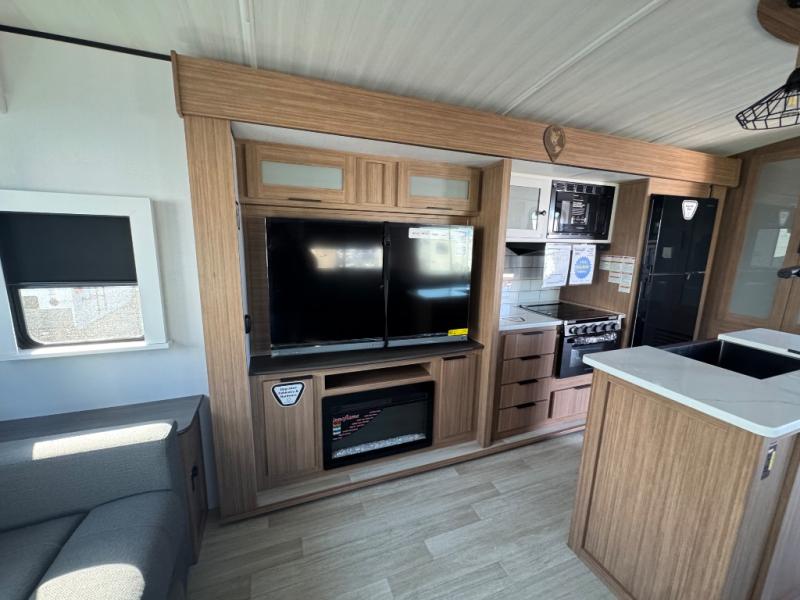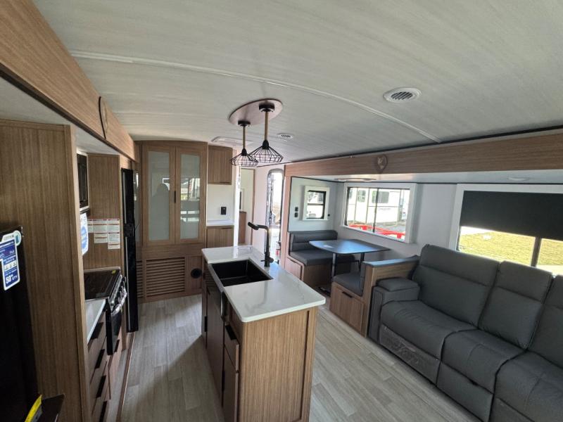 You will feel right at home in this travel trailer! The front private bedroom has a king bed slide to lay your head on at night, a front closet with washer and dryer prep, plus a dresser with a flip-up top and TV prep. Just outside the bedroom is the full bathroom with a shower with a skylight for added natural lighting as you get ready. Now that you're ready for the day, you can head to the fully equipped kitchen complete with a kitchen island to whip up some delicious cinnamon rolls that can be enjoyed at the Do-More Dinette table. The rear living area not only has luxury cinema recliners, but also a tri-fold sofa by an entertainment center with a fireplace!