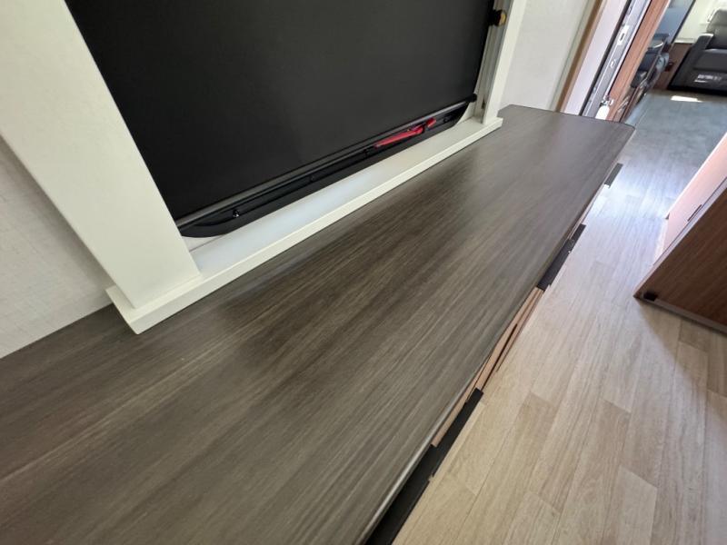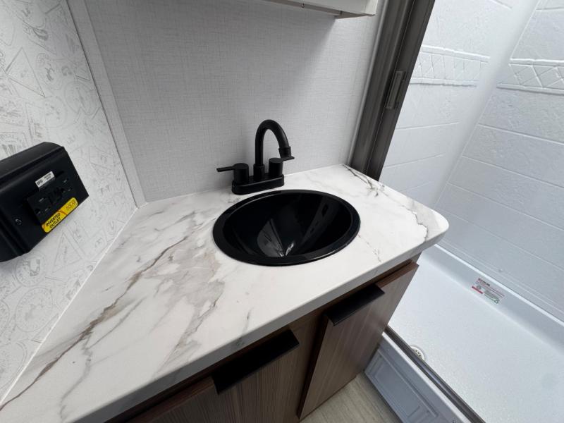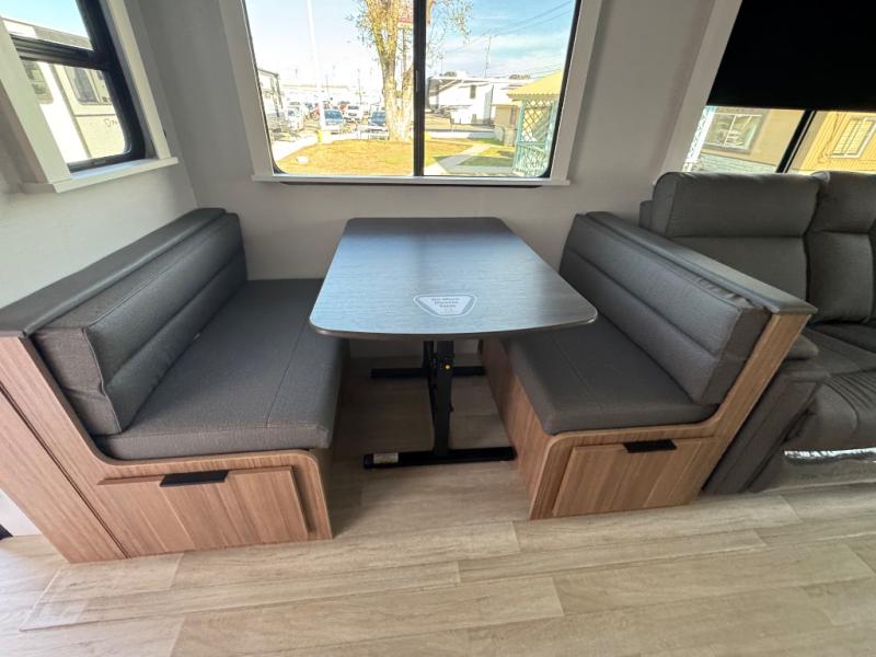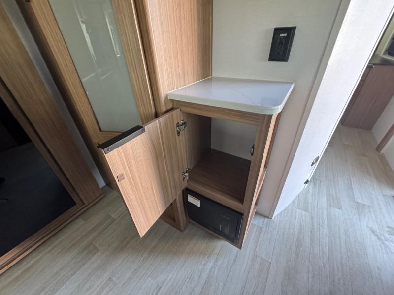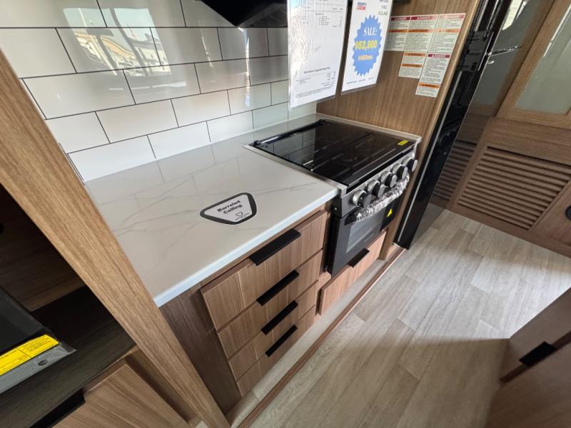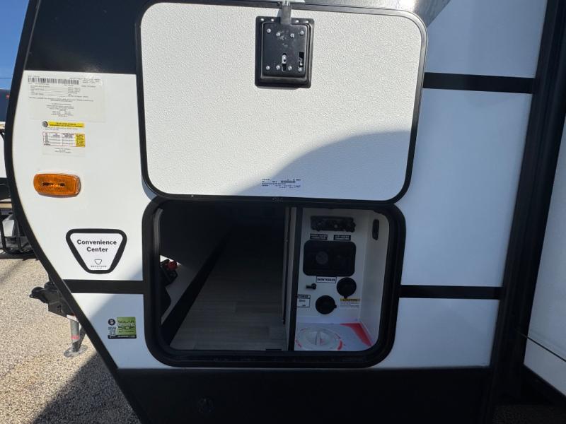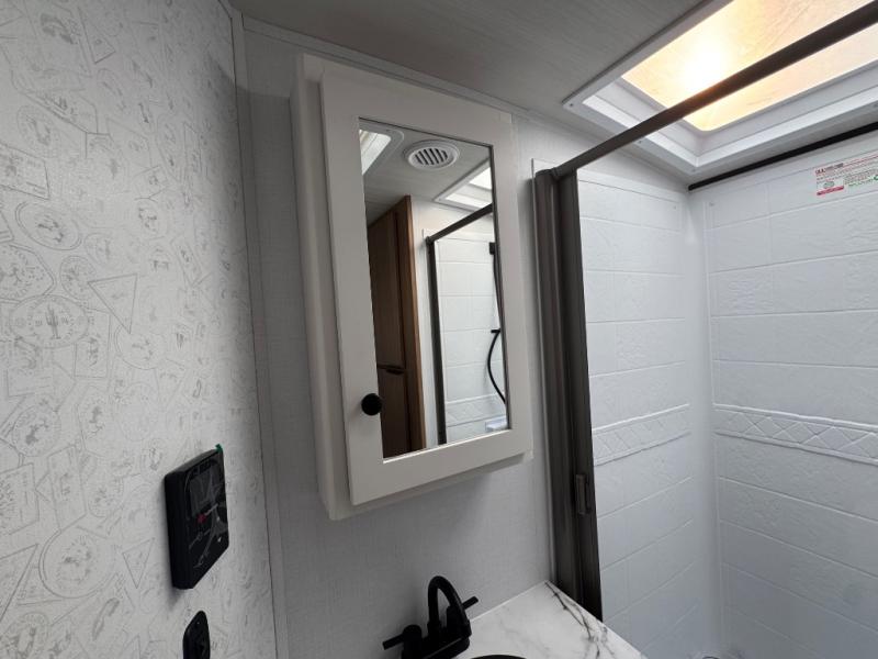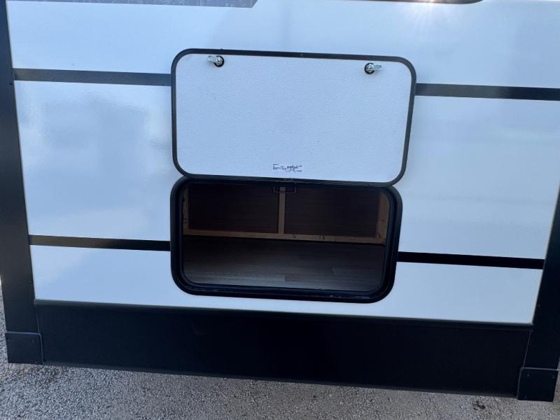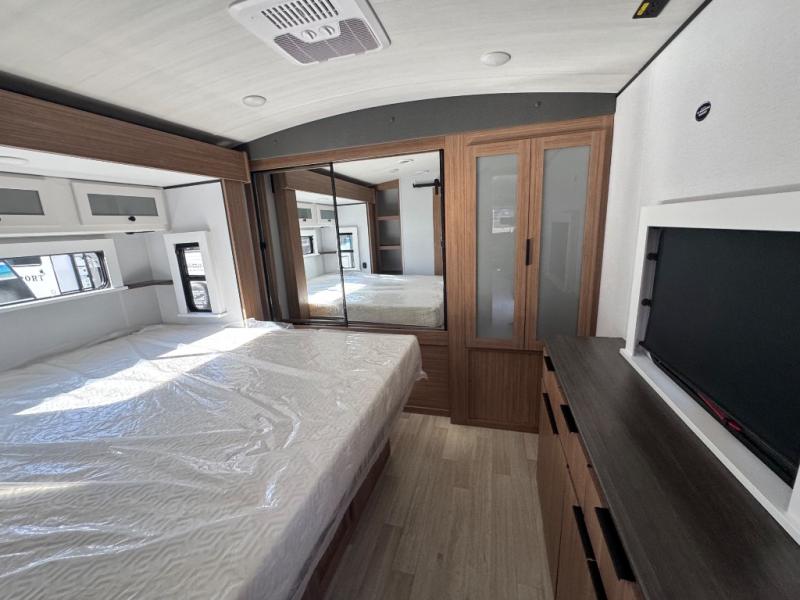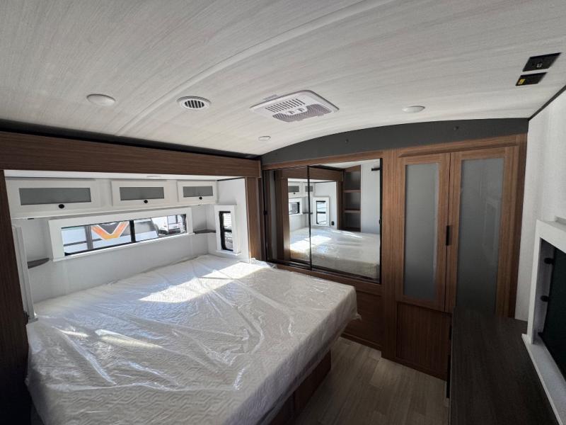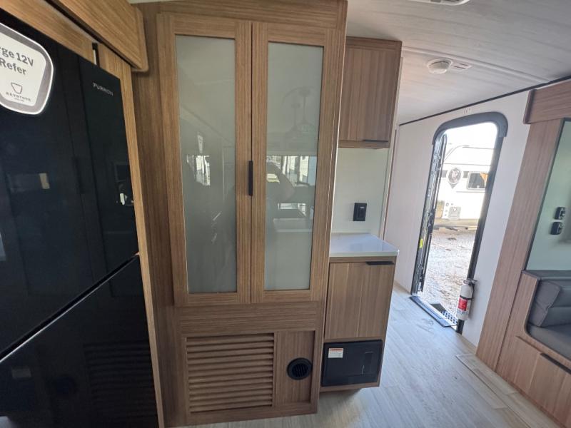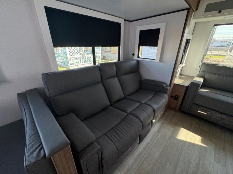 You will feel right at home in this travel trailer! The front private bedroom has a king bed slide to lay your head on at night, a front closet with washer and dryer prep, plus a dresser with a flip-up top and TV prep. Just outside the bedroom is the full bathroom with a shower with a skylight for added natural lighting as you get ready. Now that you're ready for the day, you can head to the fully equipped kitchen complete with a kitchen island to whip up some delicious cinnamon rolls that can be enjoyed at the Do-More Dinette table. The rear living area not only has luxury cinema recliners, but also a tri-fold sofa by an entertainment center with a fireplace!