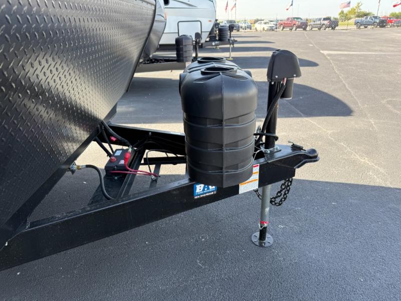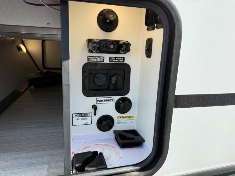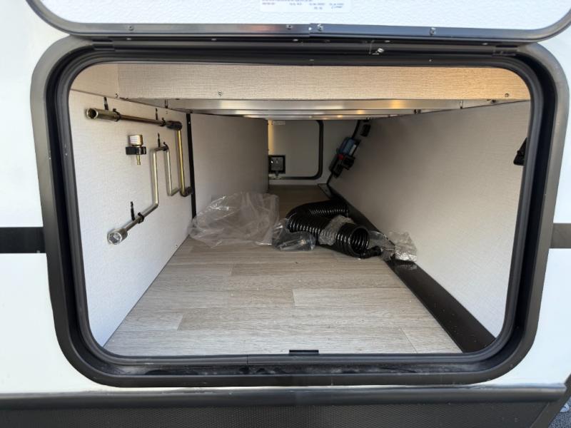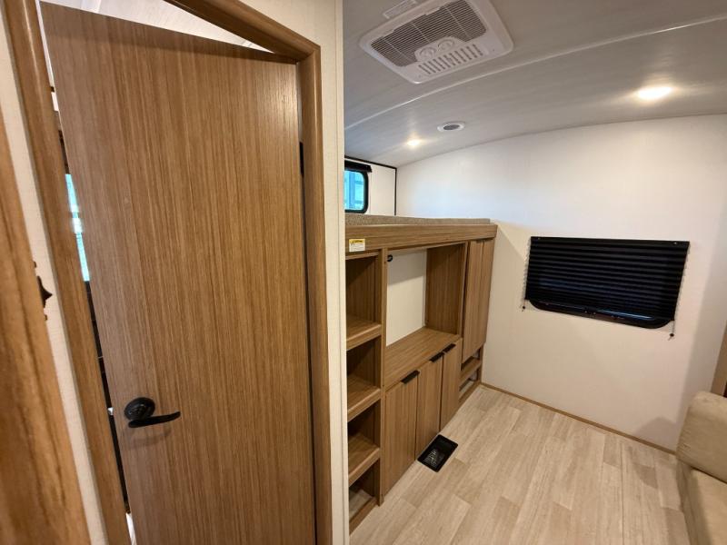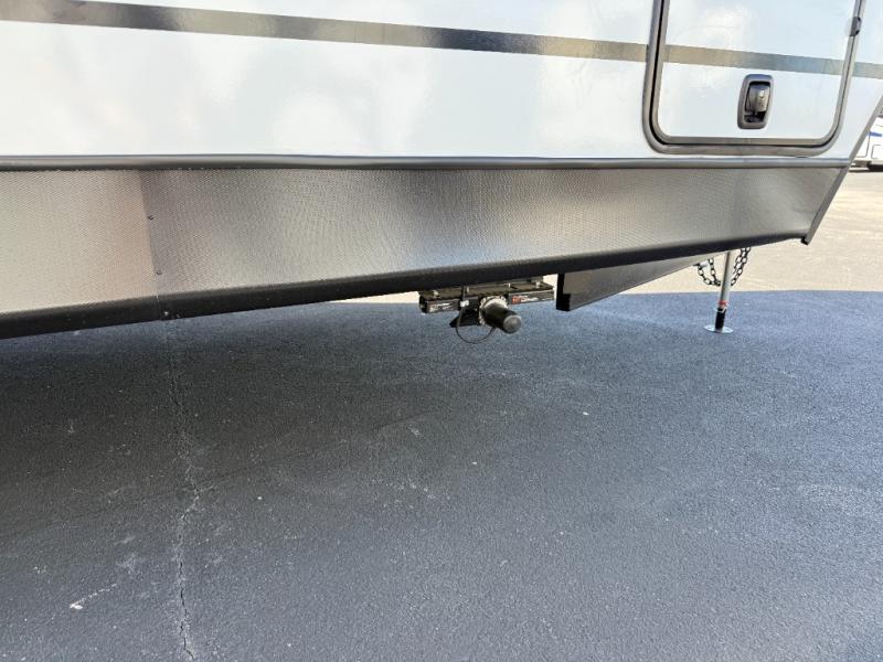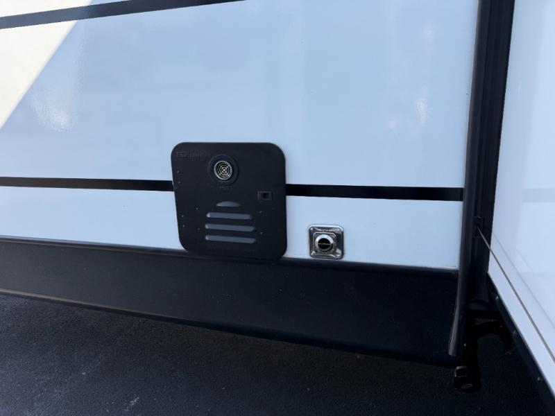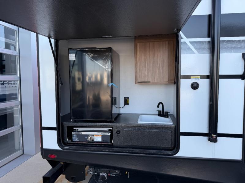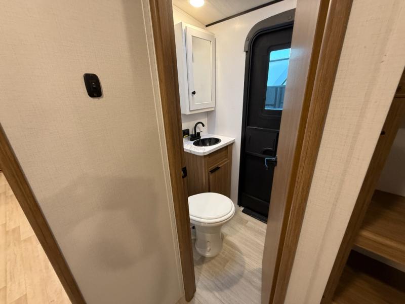You won't believe all that this travel trailer has to offer! Starting with the rear private bunkhouse which has a 28" x 74" flip-up bunk above a tri-fold sofa, a 51" x 74" bunk above an entertainment center, and even a half bathroom which has one of the dual entry doors to the unit. The front private bedroom has a queen bed to lay your head on at night with wardrobes on either side. As you exit the bedroom, you will enter the walk-through bathroom. Now that you're ready for the day, you can head to the fully equipped kitchen complete with a kitchen island to whip up some delicious cinnamon rolls that can be enjoyed at the Do-More dinette table. You even have an outside kitchen with a griddle, sink, and mini-fridge!