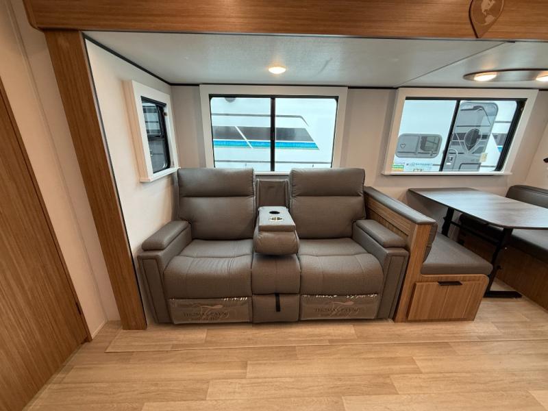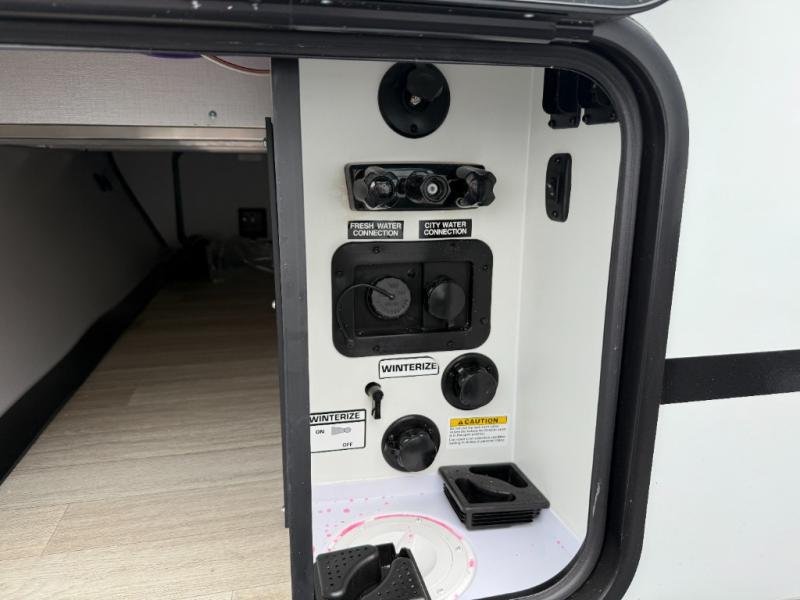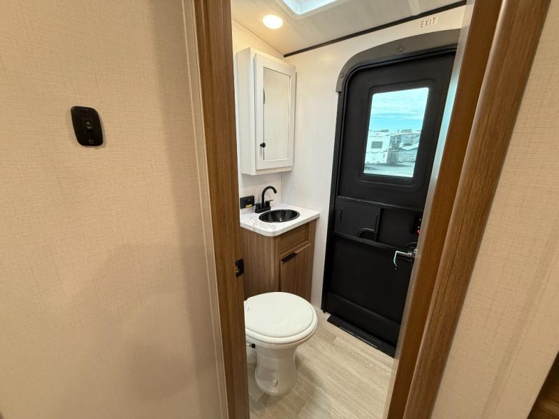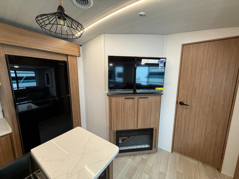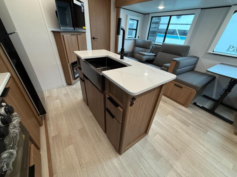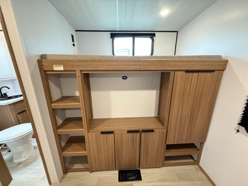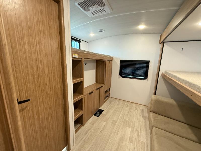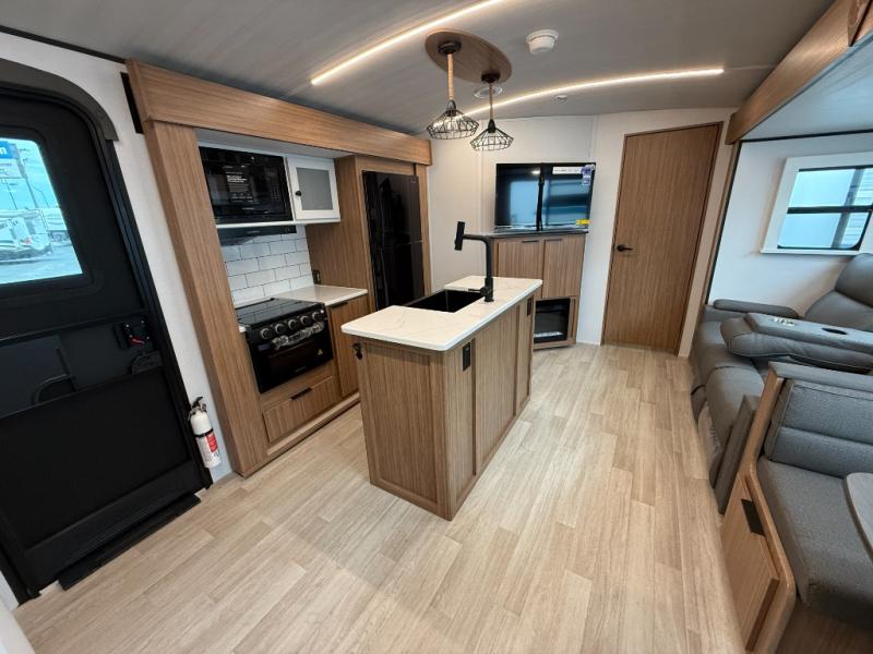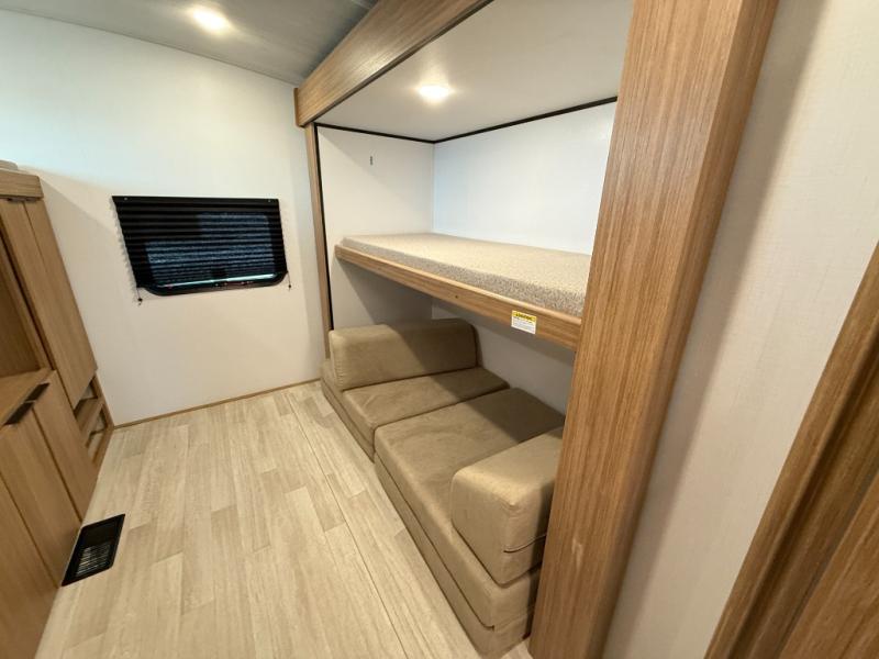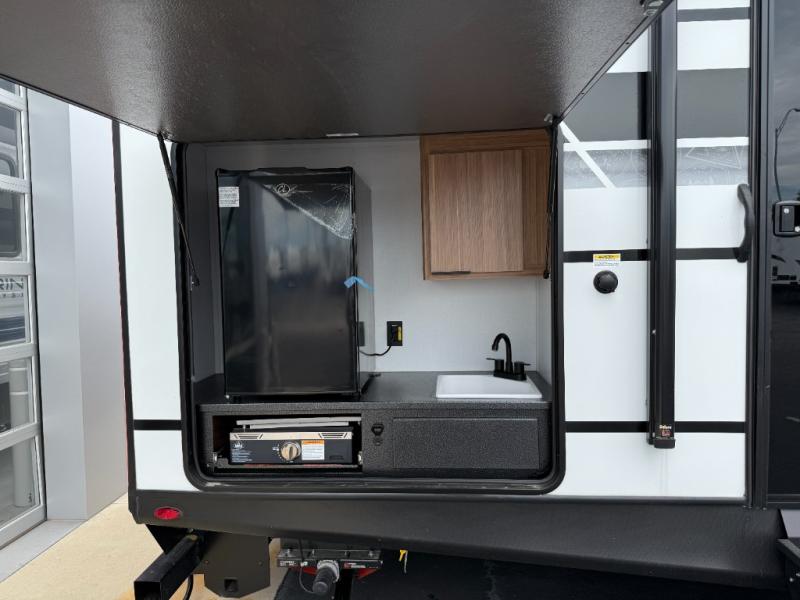 You won't believe all that this travel trailer has to offer! Starting with the rear private bunkhouse which has a 28" x 74" flip-up bunk above a tri-fold sofa, a 51" x 74" bunk above an entertainment center, and even a half bathroom which has one of the dual entry doors to the unit. The front private bedroom has a queen bed to lay your head on at night with wardrobes on either side. As you exit the bedroom, you will enter the walk-through bathroom. Now that you're ready for the day, you can head to the fully equipped kitchen complete with a kitchen island to whip up some delicious cinnamon rolls that can be enjoyed at the Do-More dinette table. You even have an outside kitchen with a griddle, sink, and mini-fridge!