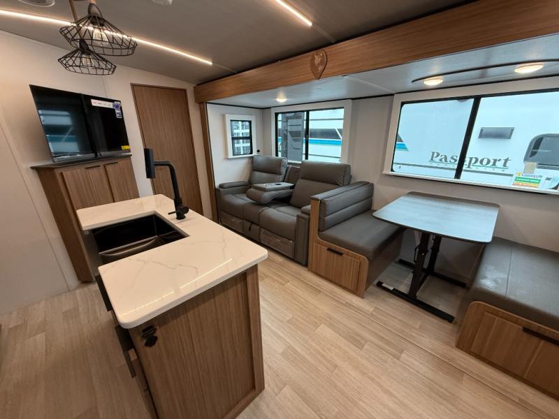 Each one of these Keystone RV Passport travel trailers offer grand style and multi-functional features! They have best-in-class storage for big things like paddle boards and small things like sleeping bags. There's no need for cordless drills and bending over to put the jacks down, simply push a button and the power stabilizer jacks do the rest. The one piece polypropylene underbelly and extended season camping package help protect your unit's vitals in different weather conditions. Exclusive to Keystone is the Tru-fit slide construction and the Hyper Deck flooring which is more resilient, stronger and lighter than the traditional laminated wood construction, plus it resists water and water damage. Inside, you'll find residential durable Beauflor vinyl flooring, deluxe night shades, bedside outlets/USB ports, and a bath skylight for more natural light and additional head room.