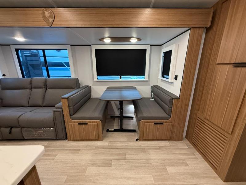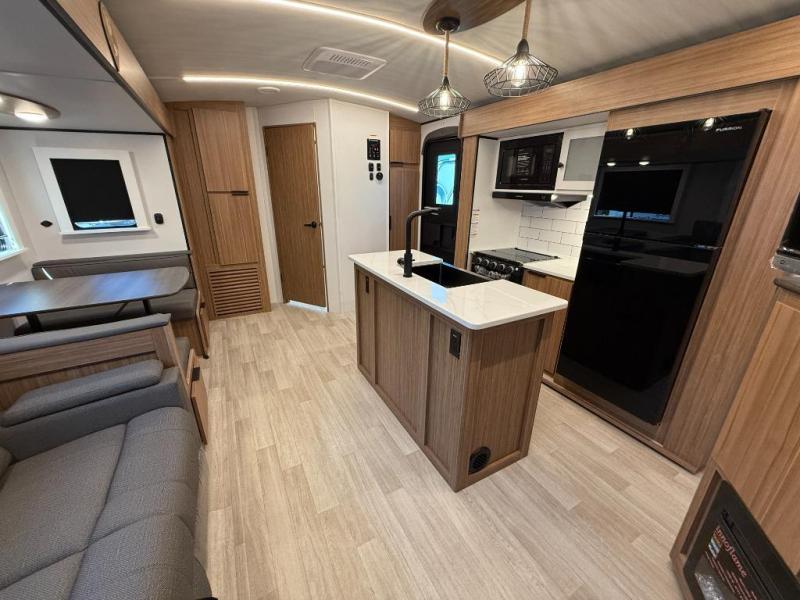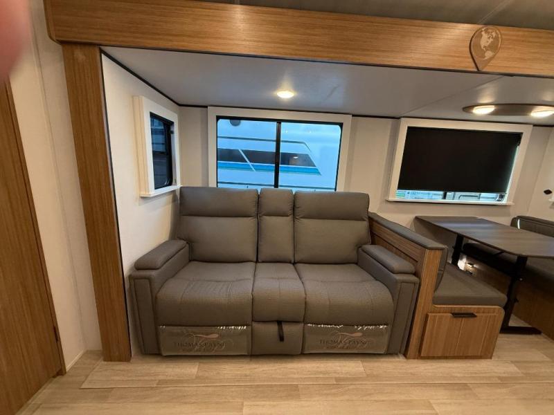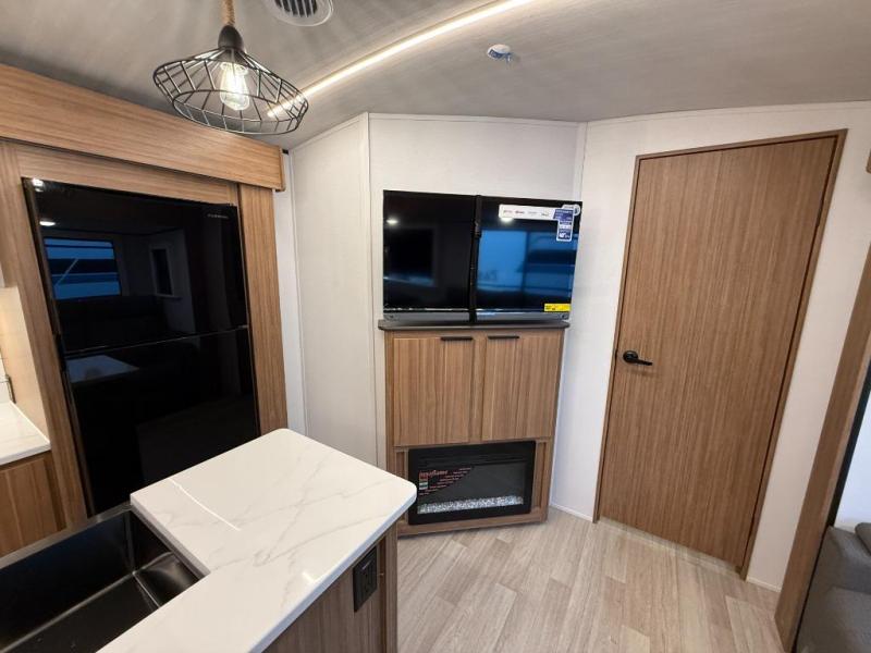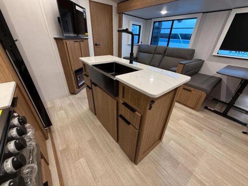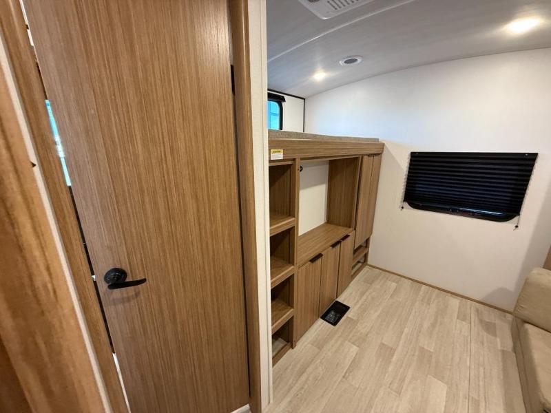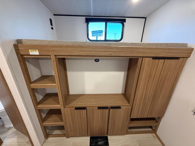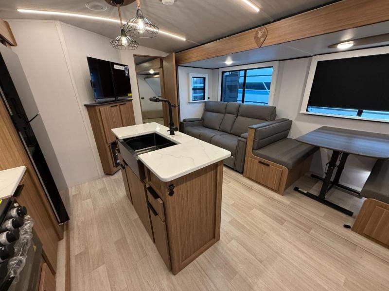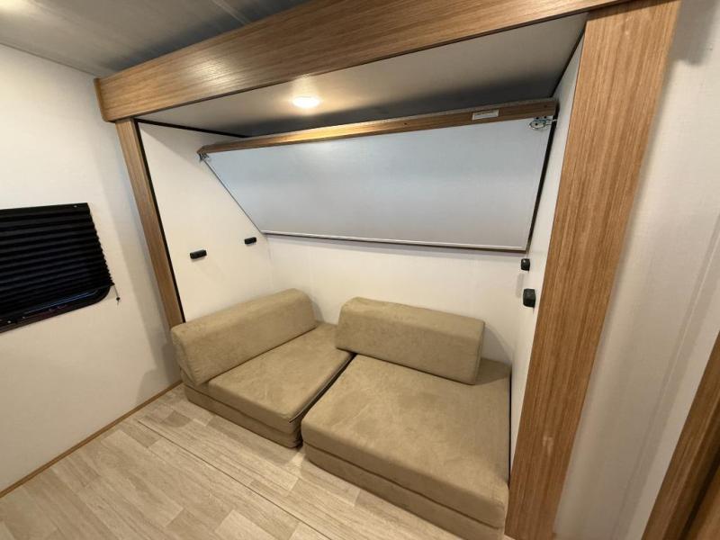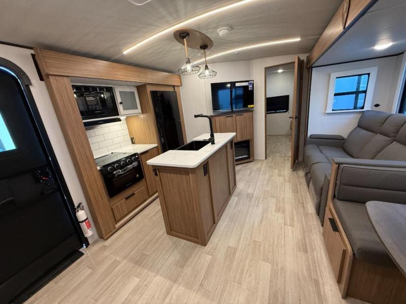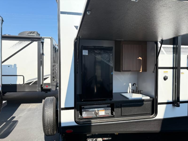 You won't believe all that this travel trailer has to offer! Starting with the rear private bunkhouse which has a 28" x 74" flip-up bunk above a tri-fold sofa, a 51" x 74" bunk above an entertainment center, and even a half bathroom which has one of the dual entry doors to the unit. The front private bedroom has a queen bed to lay your head on at night with wardrobes on either side. As you exit the bedroom, you will enter the walk-through bathroom. Now that you're ready for the day, you can head to the fully equipped kitchen complete with a kitchen island to whip up some delicious cinnamon rolls that can be enjoyed at the Do-More dinette table. You even have an outside kitchen with a griddle, sink, and mini-fridge!