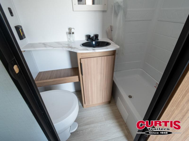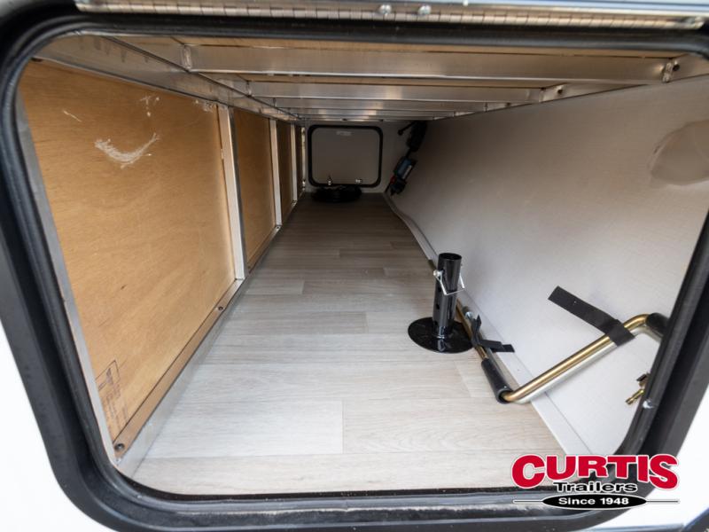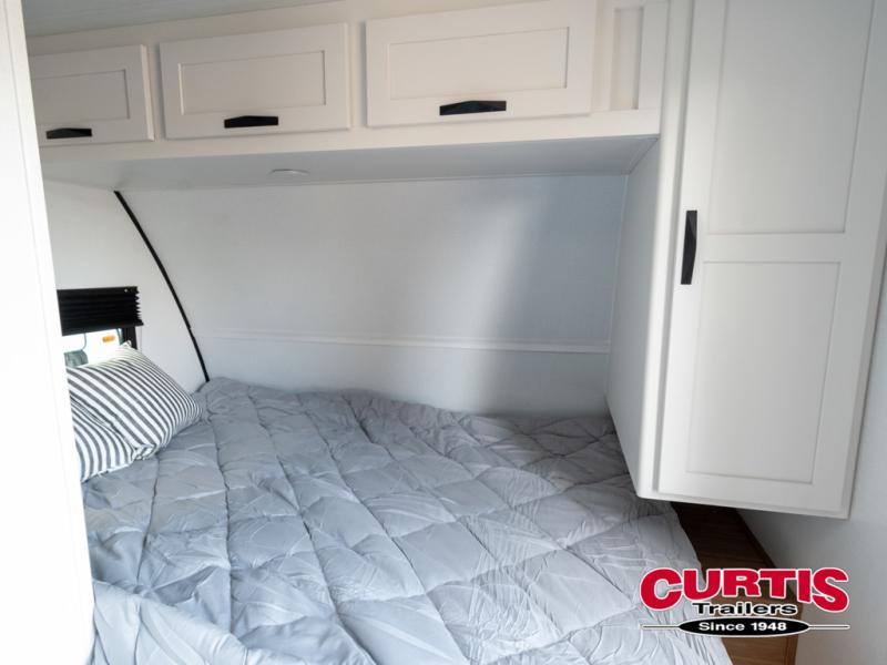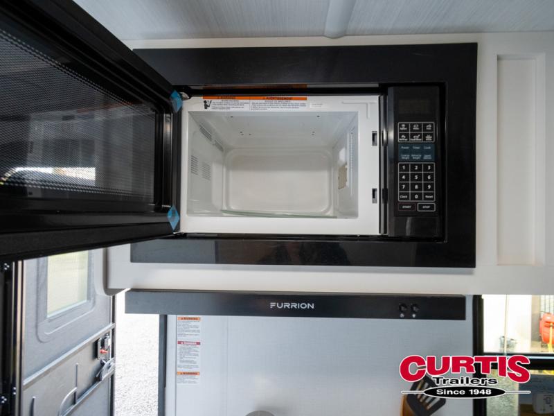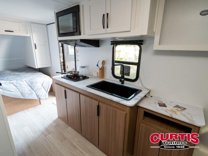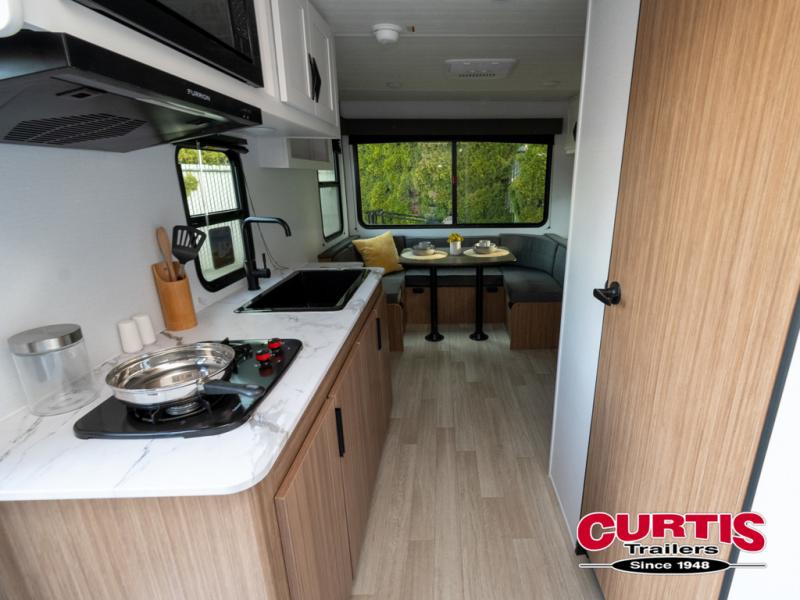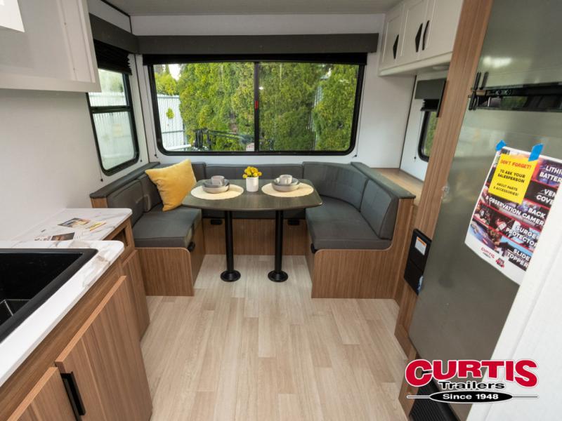 Pack your bags and hitch up this travel trailer for a fun weekend excursion! You can get a good night's sleep on the front queen bed with a wardrobe at the foot of the bed, and overhead cabinets above it for your items. You can also transform the U-shaped dinette with a counter next to it into an extra sleeping space. The chef of your group can make meals on the two burner range or in the microwave if you're on the go. There is also a large double door 12V refrigerator and pantry for food storage. Outside, you can relax underneath the patio awning and store all of your gear in the front exterior pass-through storage area!