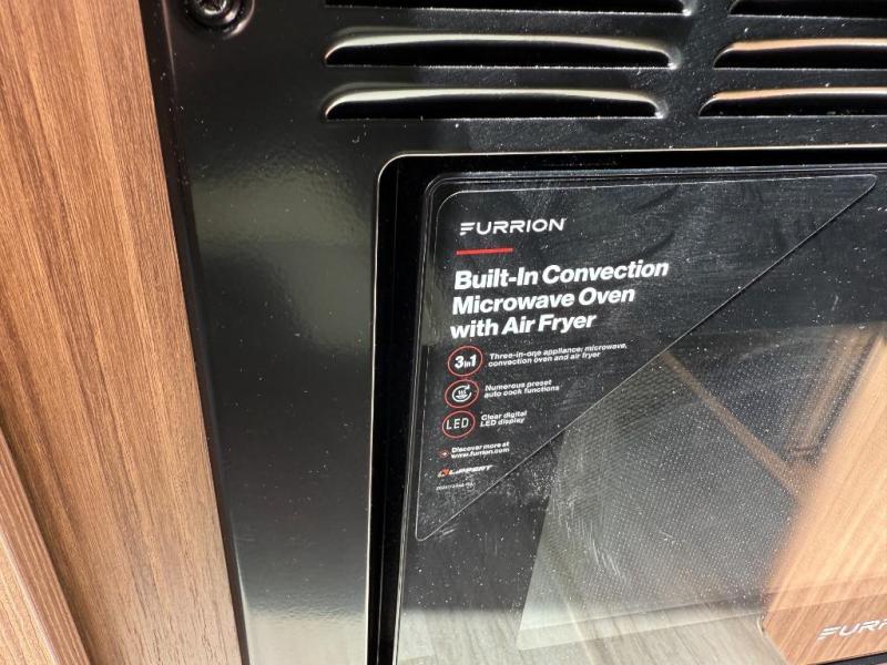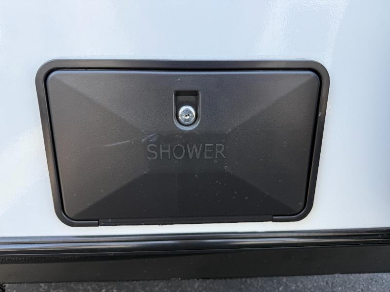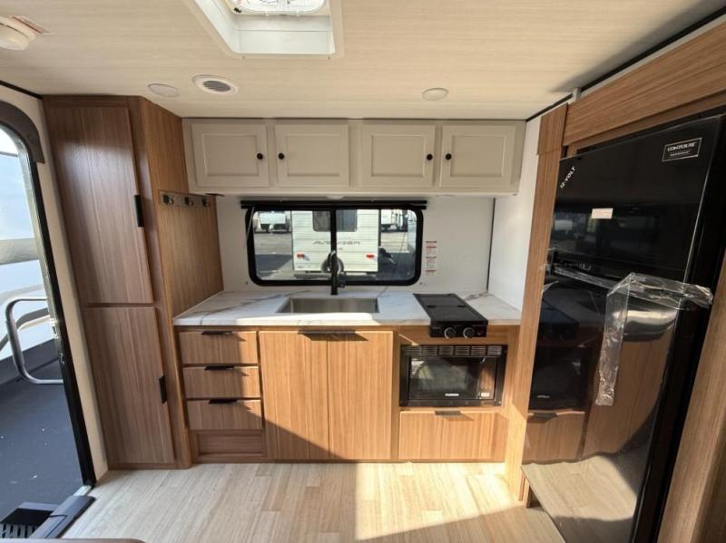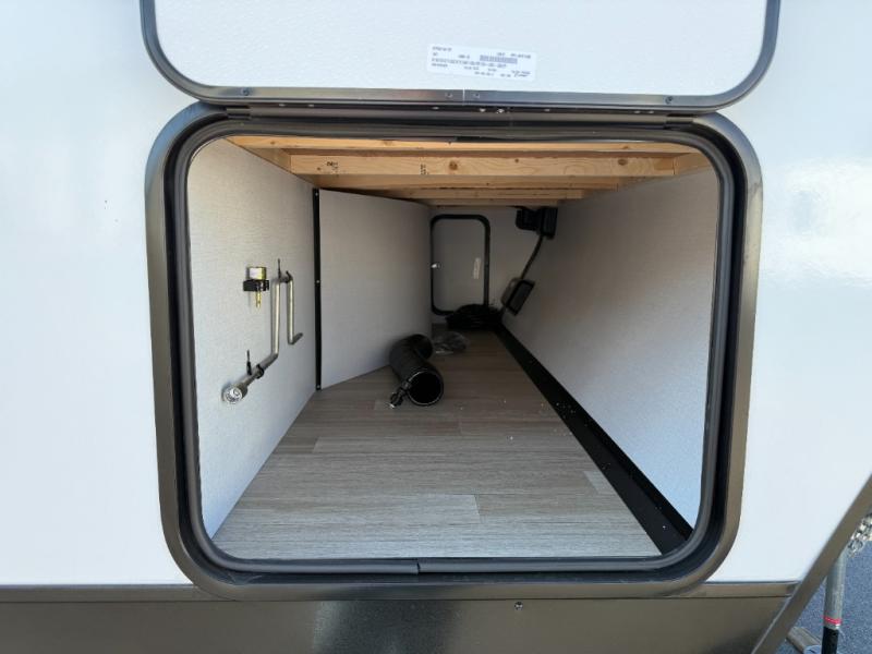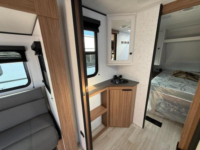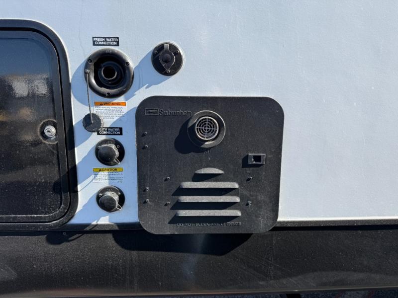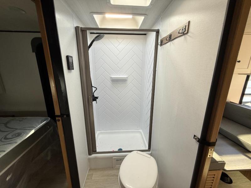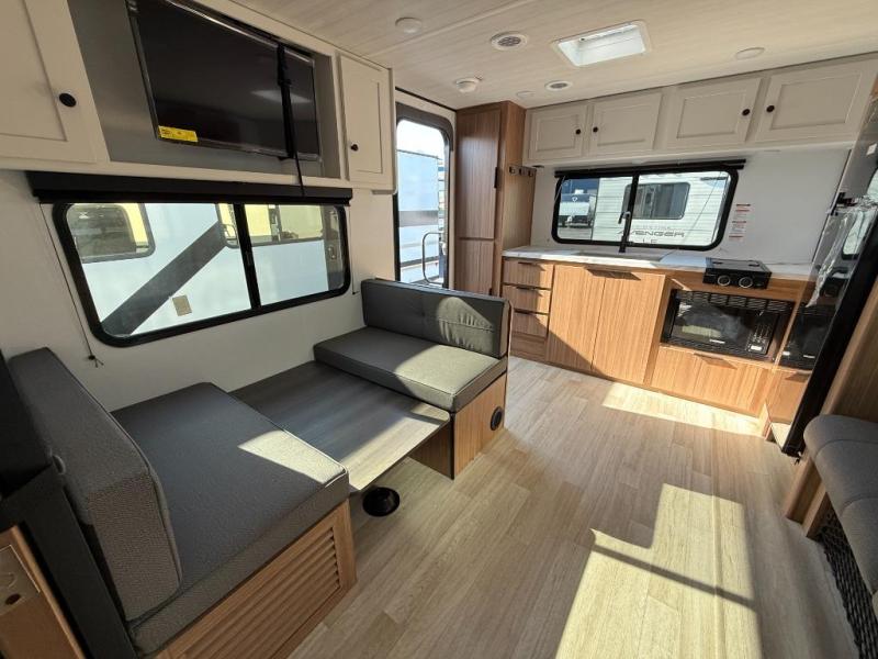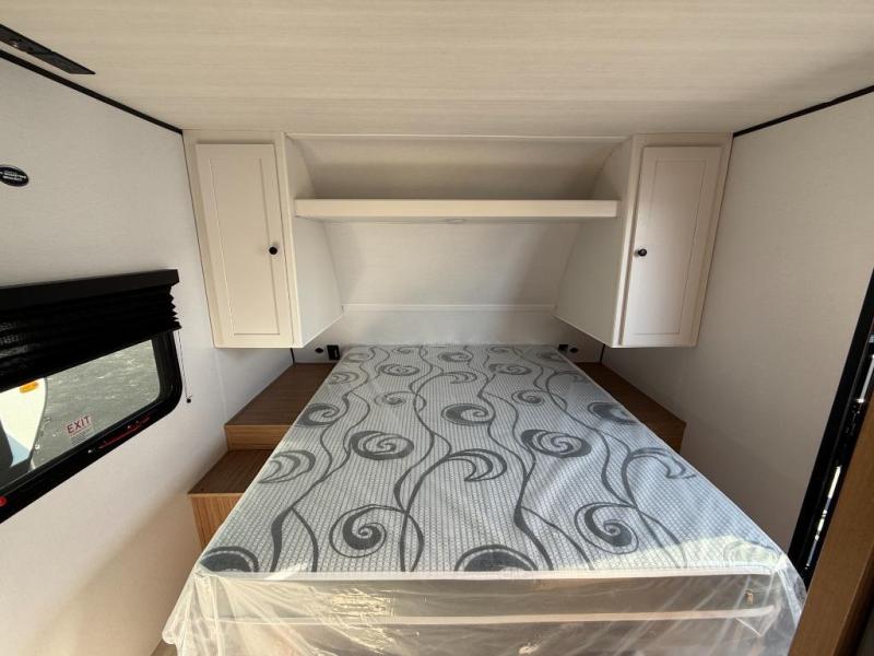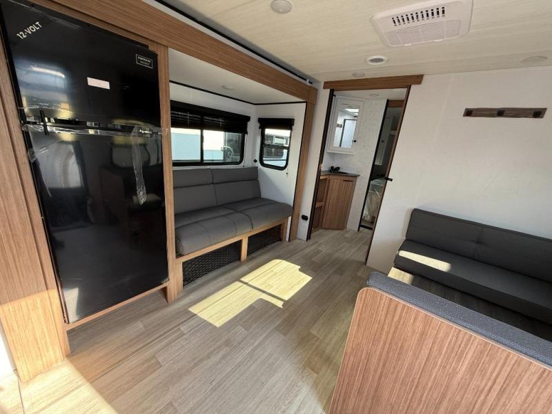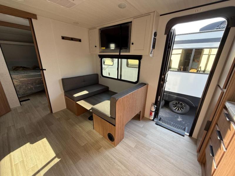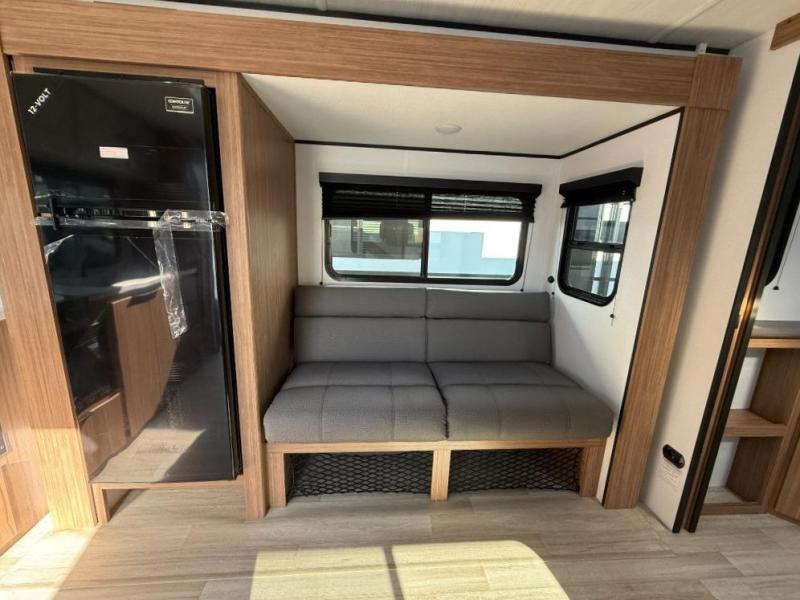 Camping trips in this spacious travel trailer will be trips well spent! With dual entry doors, you can enter in through the front private bedroom or the rear kitchen. Not only will find a walk-around queen bed in the bedroom, but you can also keep your things organized with the dual bedside wardrobes and nightstands. The walk-thru bath leads to the main living area that includes a jack knife sofa slide out and booth dinette. And the chef of your group will love cooking in the rear kitchen with a two burner cooktop, microwave oven, plus a pantry and 12V refrigerator for food storage!