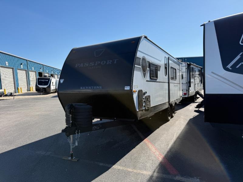 Comfort is found all throughout each one of these Keystone RV Passport Classic travel trailers! They are built with a one-piece polypropylene underbelly to protect your unit's vitals, and a seamless, laminated and gel-coated filon exterior that is sure to turn heads at the campsite. A fully walkable roof makes it easy to access when needed, and the leaf spring straight axles help provide smooth towing. The residential durable Beauflor vinyl flooring throughout and the seamless kitchen countertops will be easy to clean, and you can stay cool on a hot summer day with the A/C unit. Come find the Passport Classic that fits your needs best!