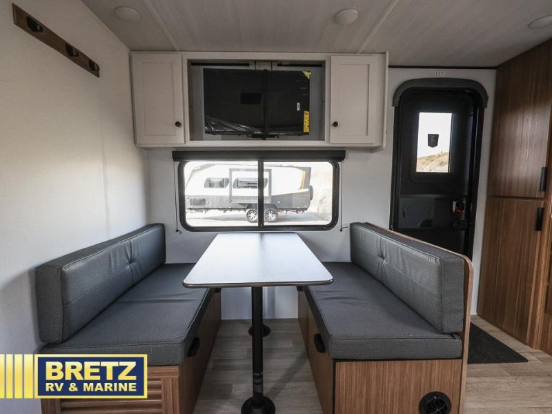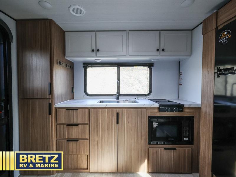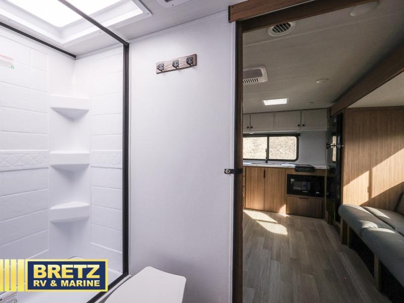 Camping trips in this spacious travel trailer will be trips well spent! With dual entry doors, you can enter in through the front private bedroom or the rear kitchen. Not only will find a walk-around queen bed in the bedroom, but you can also keep your things organized with the dual bedside wardrobes and nightstands. The walk-thru bath leads to the main living area that includes a jack knife sofa slide out and booth dinette. And the chef of your group will love cooking in the rear kitchen with a two burner cooktop, microwave oven, plus a pantry and 12V refrigerator for food storage!