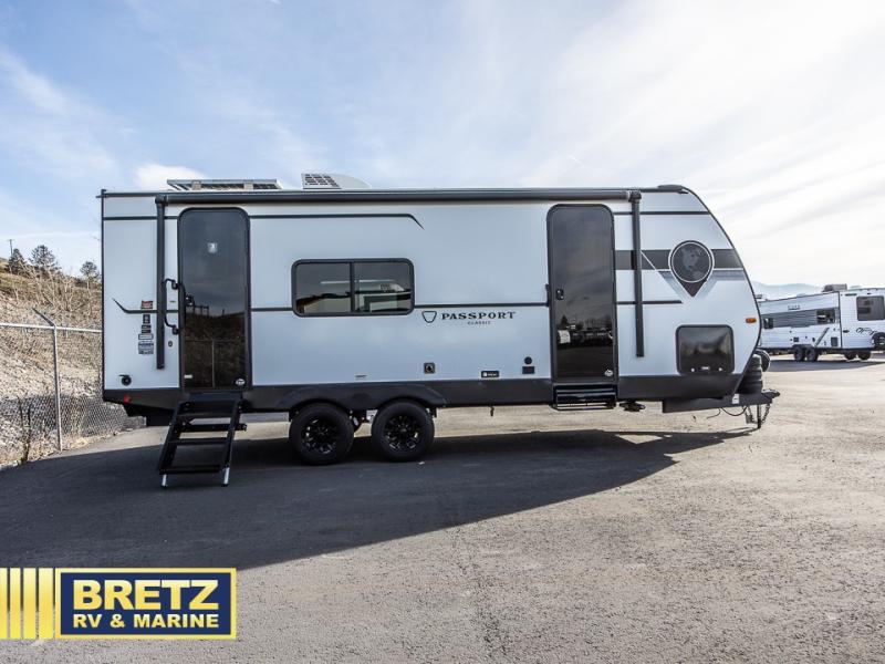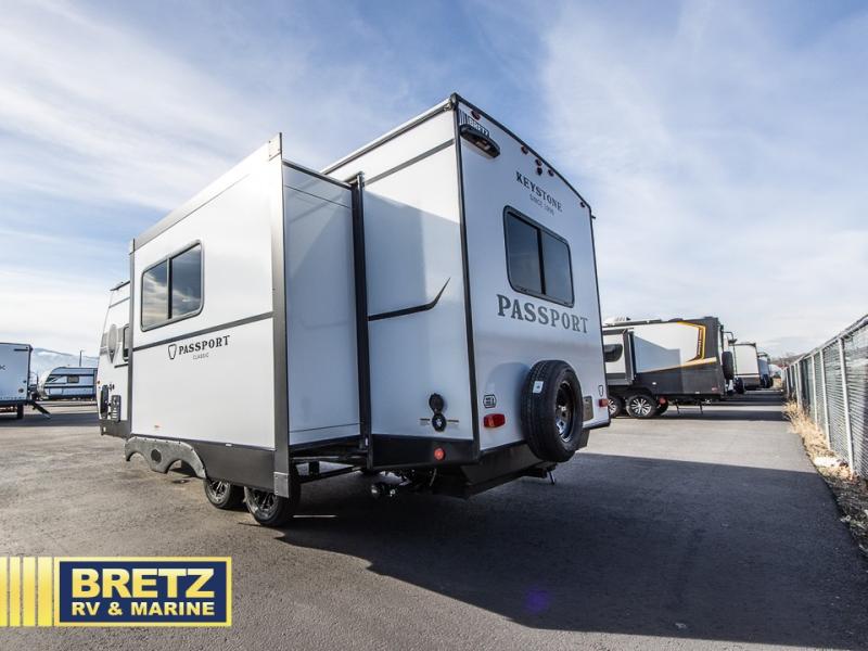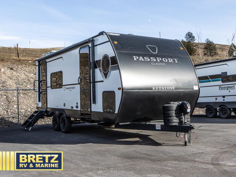 Comfort is found all throughout each one of these Keystone RV Passport Classic travel trailers! They are built with a one-piece polypropylene underbelly to protect your unit's vitals, and a seamless, laminated and gel-coated filon exterior that is sure to turn heads at the campsite. A fully walkable roof makes it easy to access when needed, and the leaf spring straight axles help provide smooth towing. The residential durable Beauflor vinyl flooring throughout and the seamless kitchen countertops will be easy to clean, and you can stay cool on a hot summer day with the A/C unit. Come find the Passport Classic that fits your needs best!