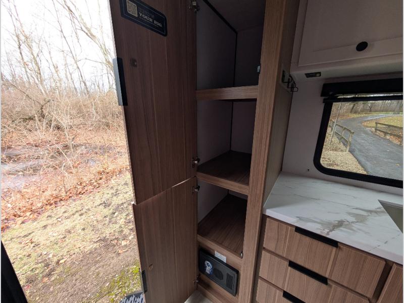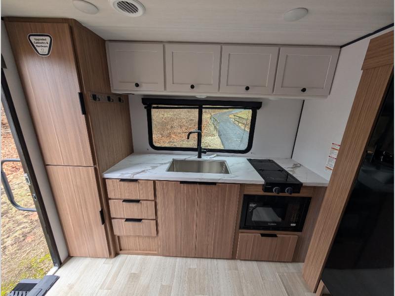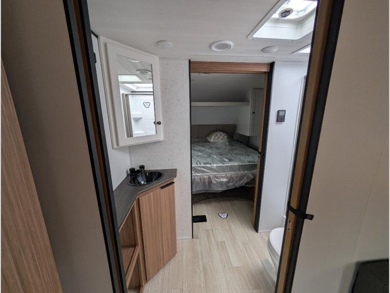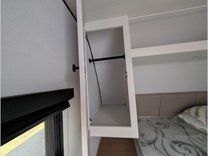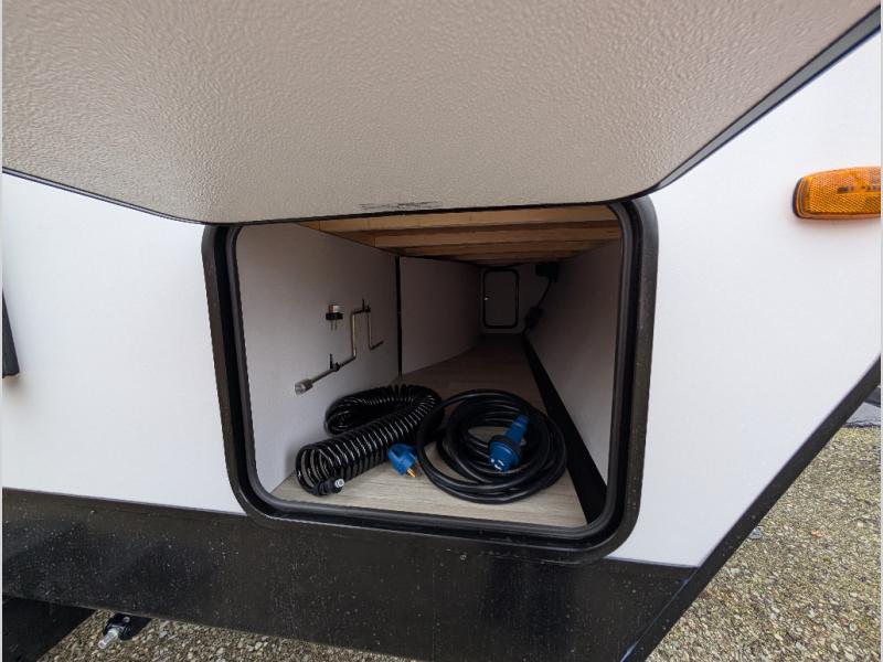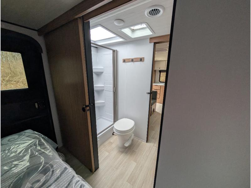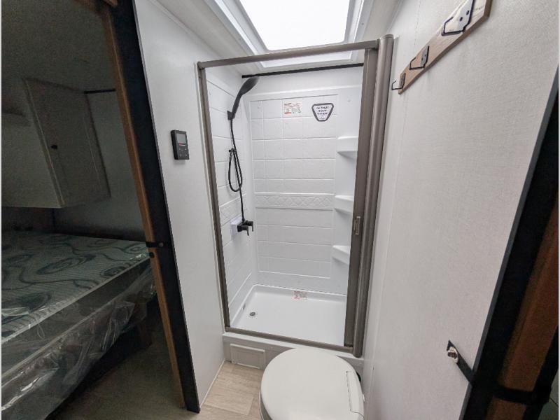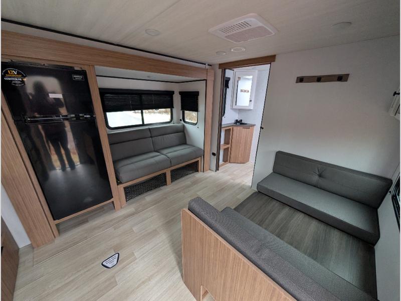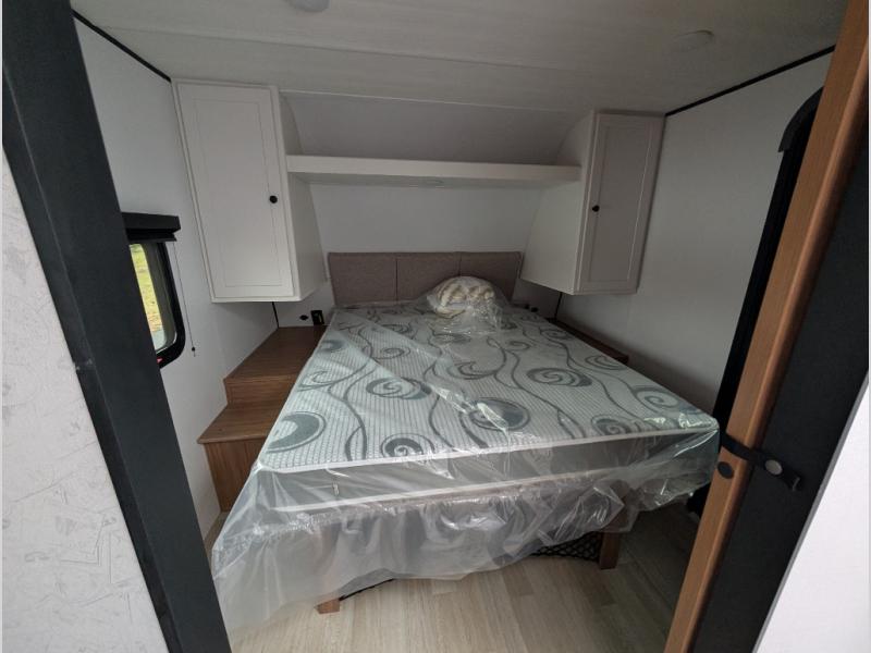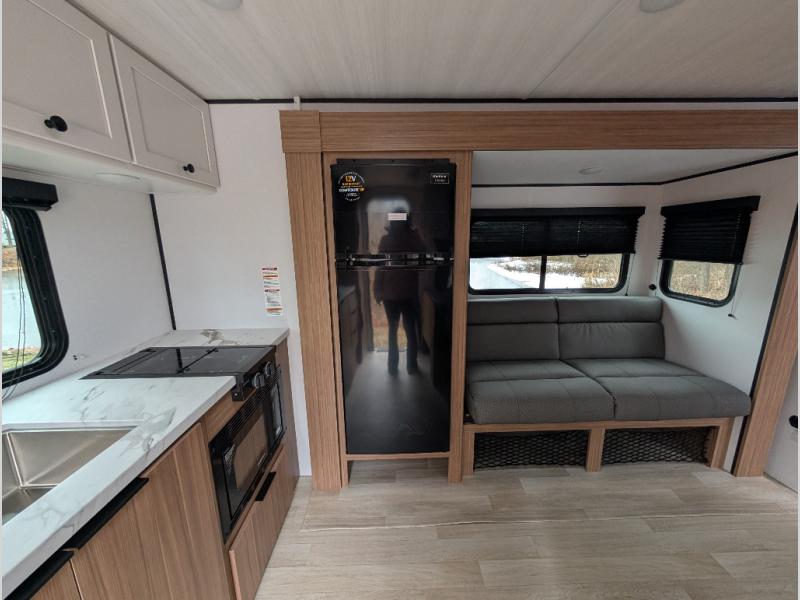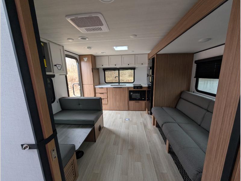 Camping trips in this spacious travel trailer will be trips well spent! With dual entry doors, you can enter in through the front private bedroom or the rear kitchen. Not only will find a walk-around queen bed in the bedroom, but you can also keep your things organized with the dual bedside wardrobes and nightstands. The walk-thru bath leads to the main living area that includes a jack knife sofa slide out and booth dinette. And the chef of your group will love cooking in the rear kitchen with a two burner cooktop, microwave oven, plus a pantry and 12V refrigerator for food storage!