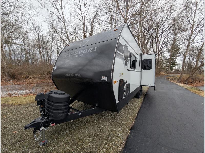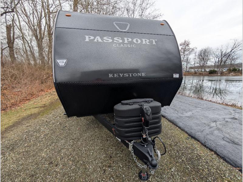 Comfort is found all throughout each one of these Keystone RV Passport Classic travel trailers! They are built with a one-piece polypropylene underbelly to protect your unit's vitals, and a seamless, laminated and gel-coated filon exterior that is sure to turn heads at the campsite. A fully walkable roof makes it easy to access when needed, and the leaf spring straight axles help provide smooth towing. The residential durable Beauflor vinyl flooring throughout and the seamless kitchen countertops will be easy to clean, and you can stay cool on a hot summer day with the A/C unit. Come find the Passport Classic that fits your needs best!