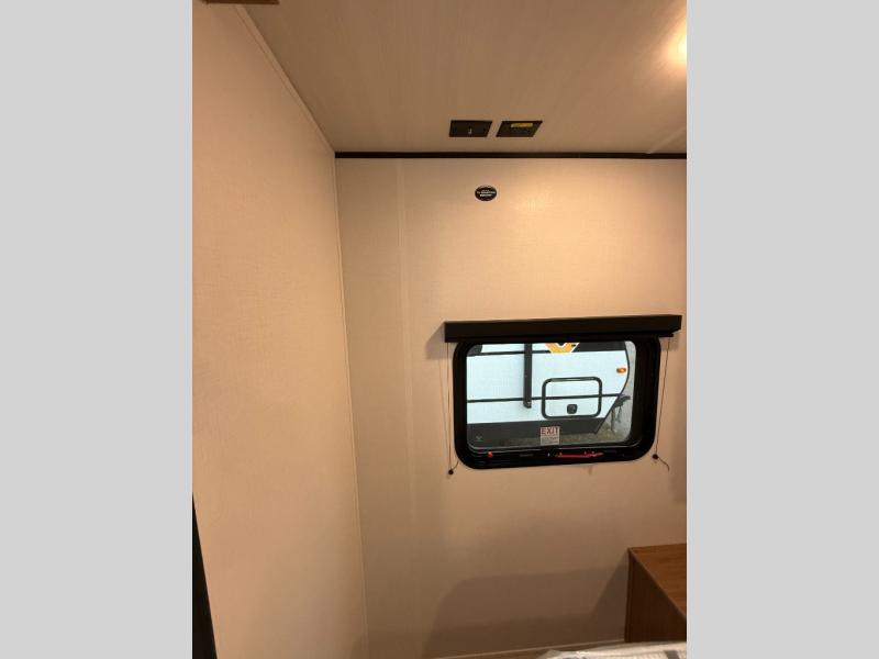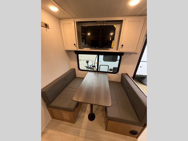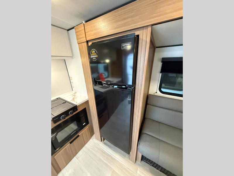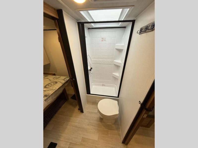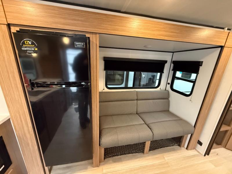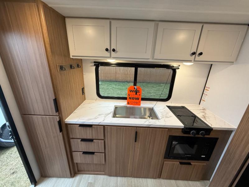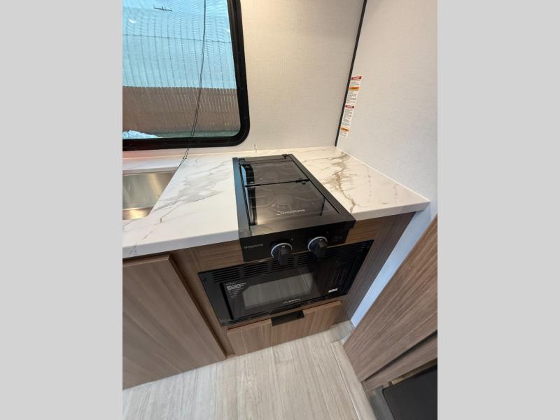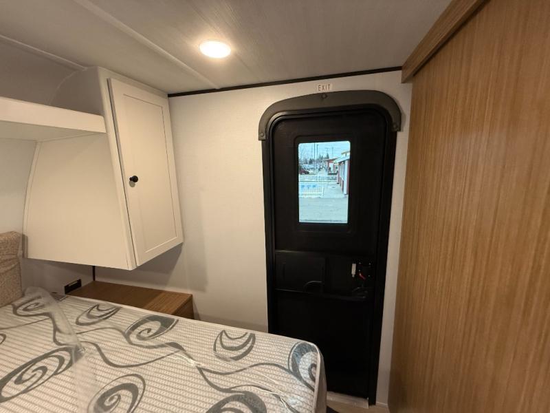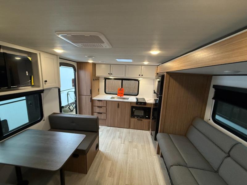 Camping trips in this spacious travel trailer will be trips well spent! With dual entry doors, you can enter in through the front private bedroom or the rear kitchen. Not only will find a walk-around queen bed in the bedroom, but you can also keep your things organized with the dual bedside wardrobes and nightstands. The walk-thru bath leads to the main living area that includes a jack knife sofa slide out and booth dinette. And the chef of your group will love cooking in the rear kitchen with a two-burner cooktop, microwave oven, plus a pantry and 12V refrigerator for food storage!