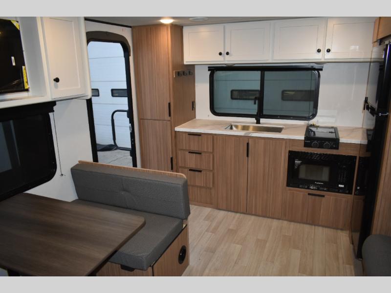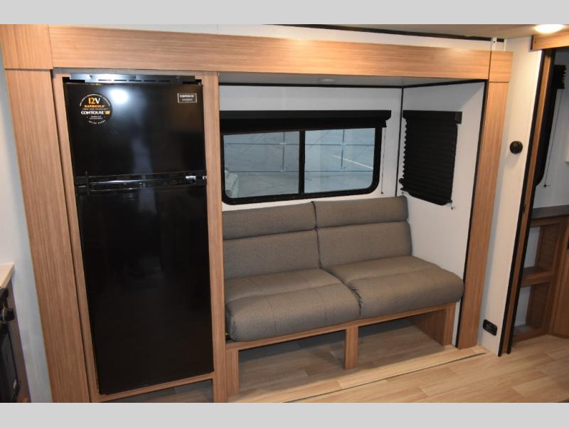 Camping trips in this spacious travel trailer will be trips well spent! With dual entry doors, you can enter in through the front private bedroom or the rear kitchen. Not only will find a walk-around queen bed in the bedroom, but you can also keep your things organized with the dual bedside wardrobes and nightstands. The walk-thru bath leads to the main living area that includes a jack knife sofa slide out and booth dinette. And the chef of your group will love cooking in the rear kitchen with a two-burner cooktop, microwave oven, plus a pantry and 12V refrigerator for food storage!
