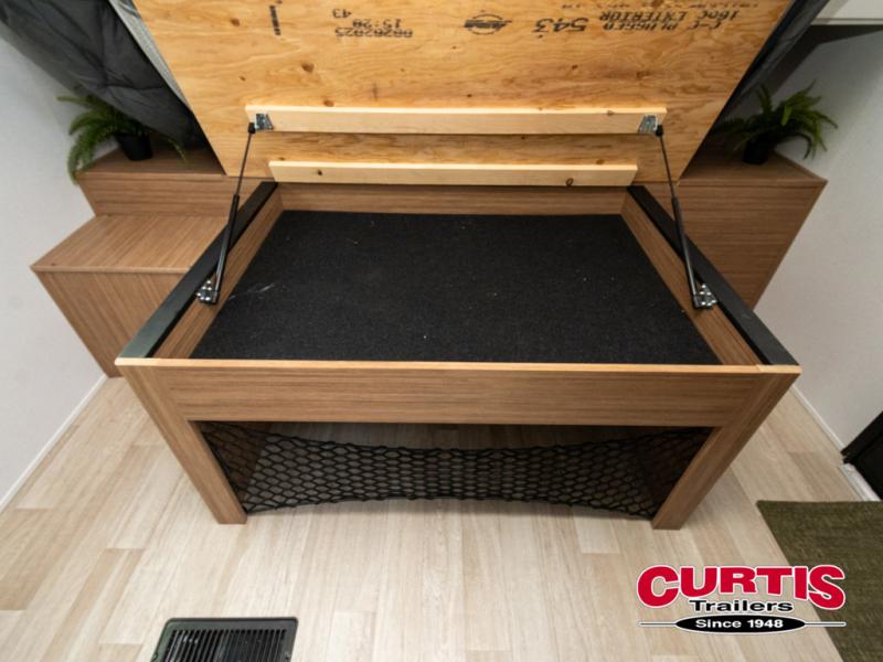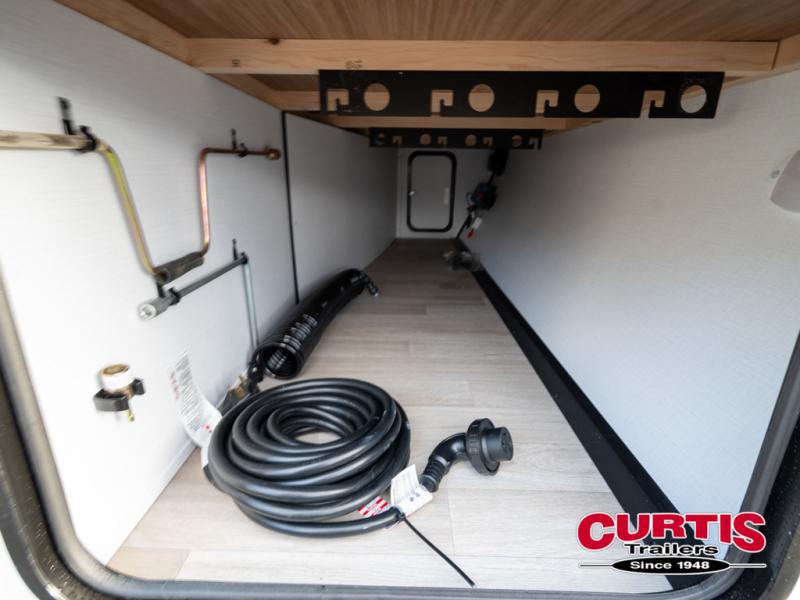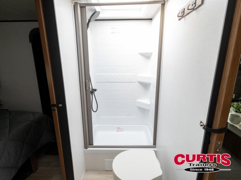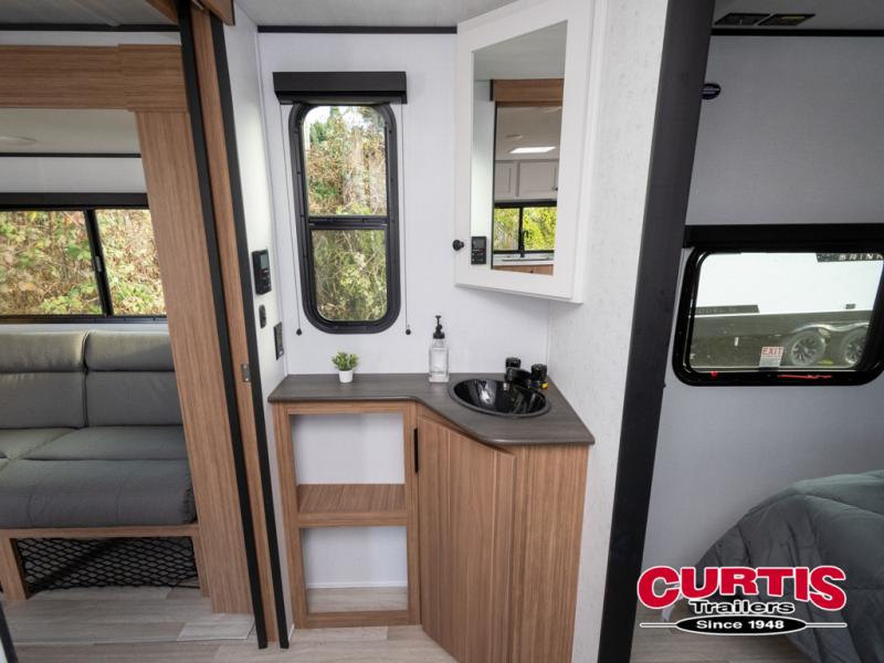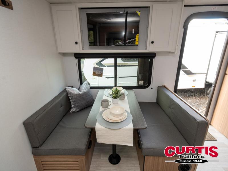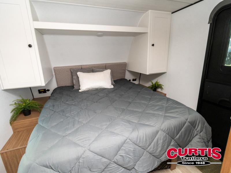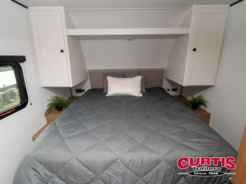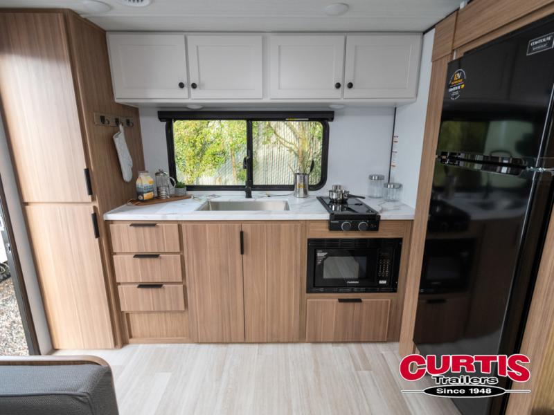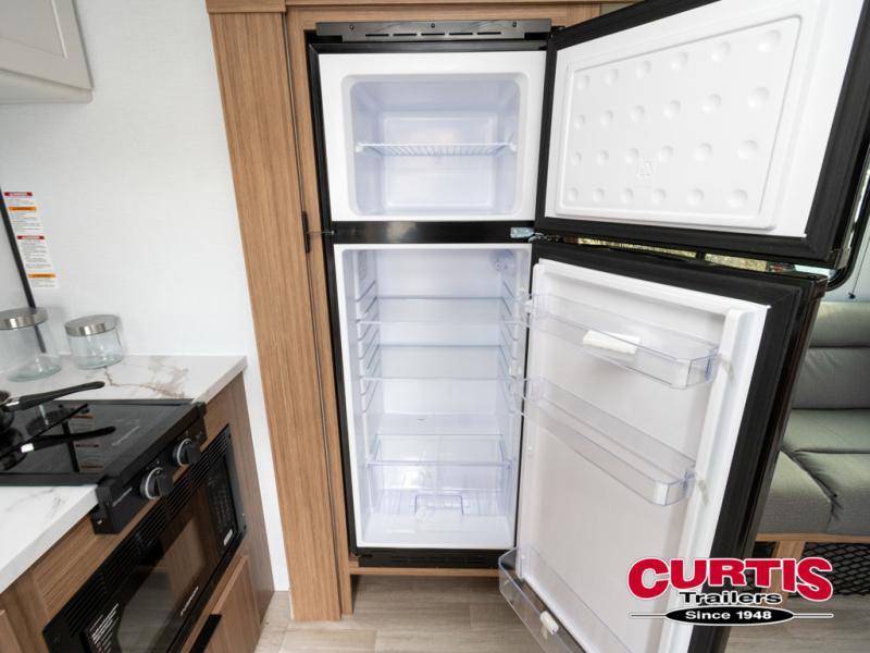 Camping trips in this spacious travel trailer will be trips well spent! With dual entry doors, you can enter in through the front private bedroom or the rear kitchen. Not only will find a walk-around queen bed in the bedroom, but you can also keep your things organized with the dual bedside wardrobes and nightstands. The walk-thru bath leads to the main living area that includes a jack knife sofa slide out and booth dinette. And the chef of your group will love cooking in the rear kitchen with a two-burner cooktop, microwave oven, plus a pantry and 12V refrigerator for food storage!