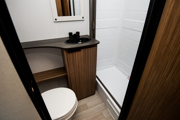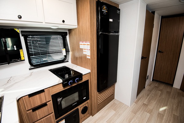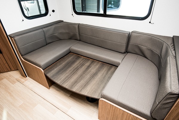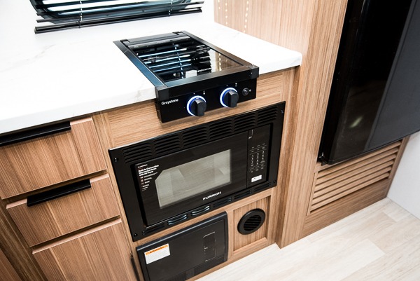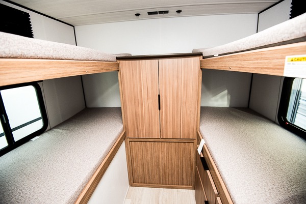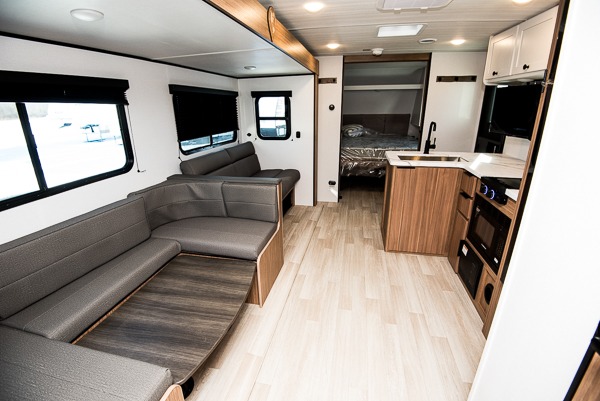 This spacious travel trailer is perfect for a large group or family since it can sleep eight to ten people each night. The bunkhouse will be a favorite spot for the little ones to enjoy, especially with four bunk beds and a wardrobe with storage. You'll have a queen bed up front in the private bedroom, and if you have any other guests, they can sleep on the jack knife sofa and U-shaped dinette! The two-burner range and microwave oven allow you to make meals each day, and the large double door 12V refrigerator will keep leftovers fresh.
