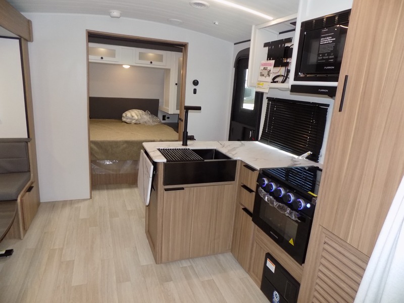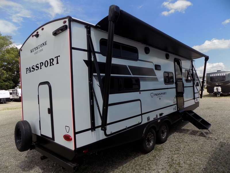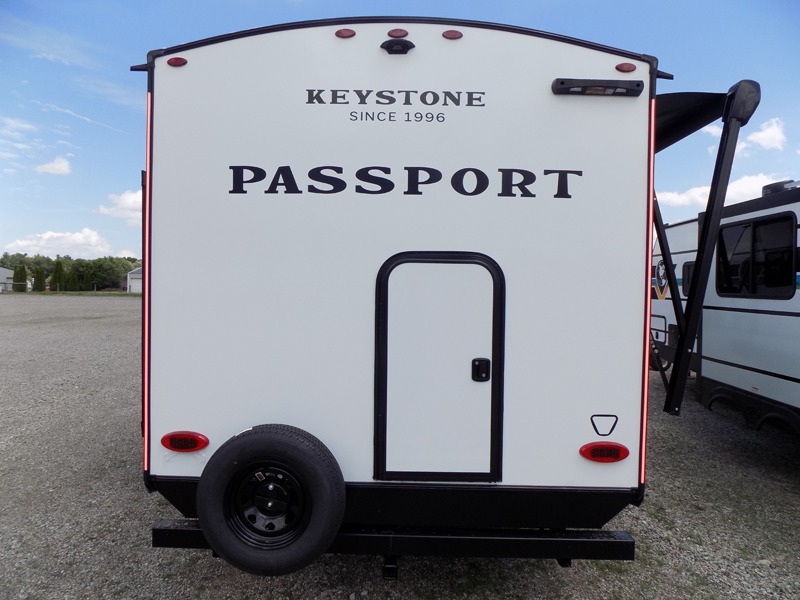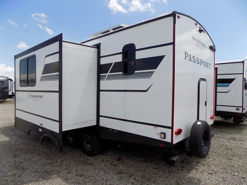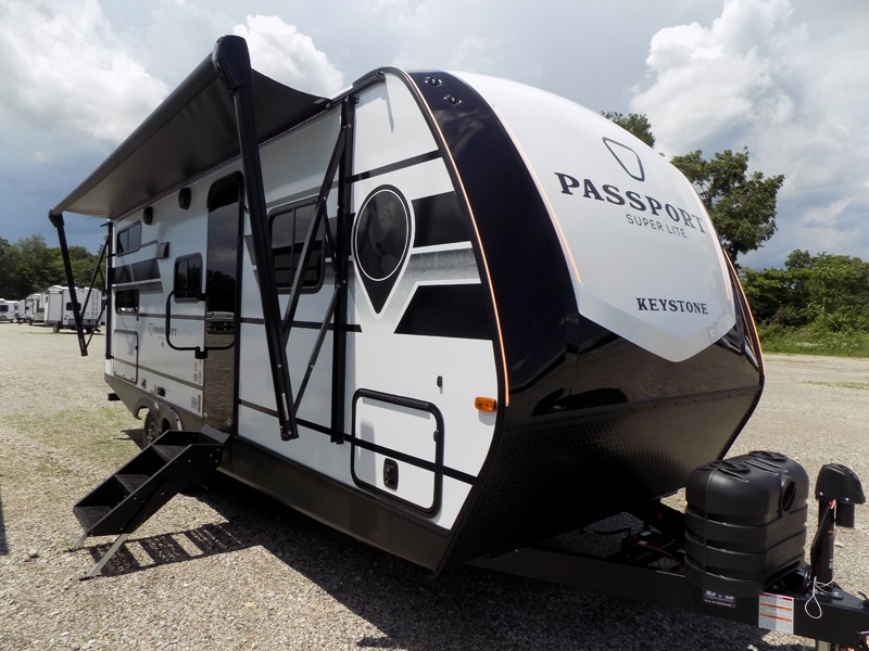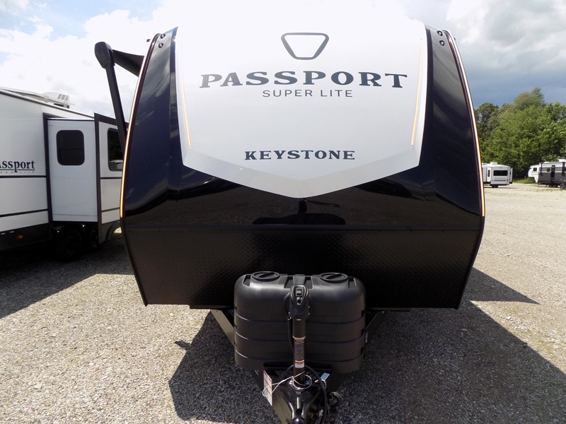 With any Keystone Passport Super Lite travel trailer you will enjoy lightweight towing and lots of interior comforts! The power tongue jack lets you hitch up at the drop of a hat, and the Dexter torsion axle rubber ride suspension will make towing easier than ever. You will appreciate having 4-point power stabilizer jacks for quick setup and an exterior convenience center to monitor tank levels. These trailers feature 5-sided aluminum construction, new premium aluminum wheels, a heated and enclosed underbelly, plus new composite solid entry steps. Inside, you'll enjoy seamless kitchen countertops, interior lights with a dimmer, a rainfall showerhead, and premium pull-down roller shades for added privacy.