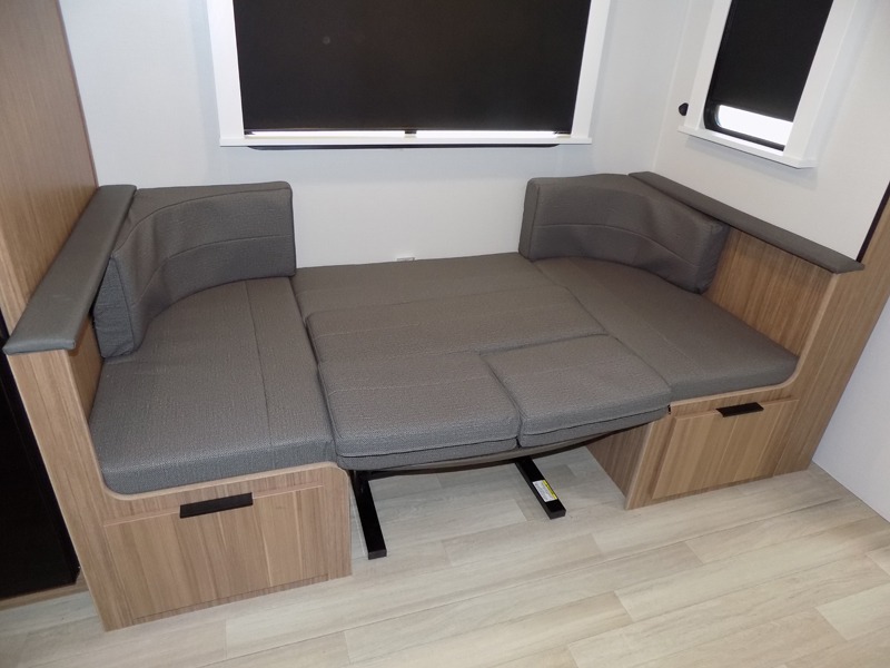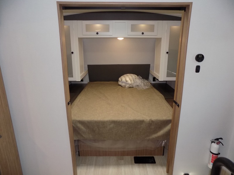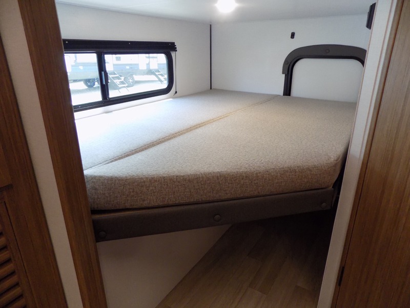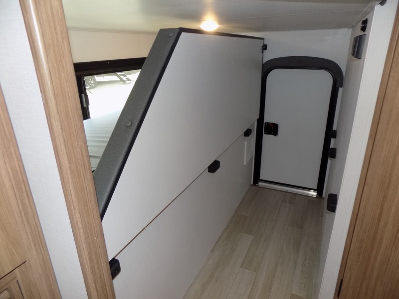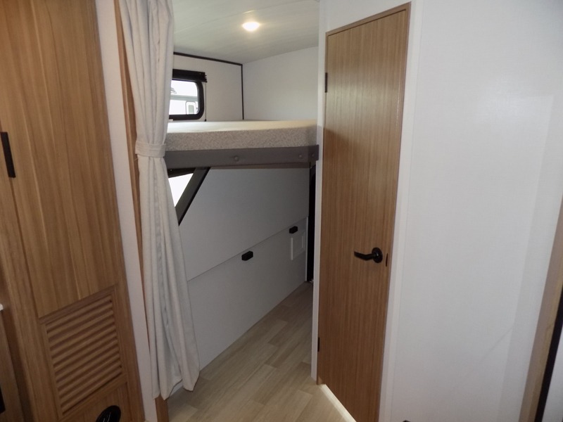 Trips to the lake with a larger group are made easy in this spacious travel trailer! The double-size bunks include a flip-up bunk for added storage, and there is a rear cargo door here so you can easily load gear from outside. The full bath is conveniently located right by the bunks for easy nighttime use, and the pantry is also close by if anyone needs a midnight snack! You will sleep like a baby in the front bedroom that includes a queen bed and dual wardrobes to keep your clothes tidy. In the morning, everyone can meet in the combined living area and kitchen while the chef makes breakfast on the three-burner cooktop, and there is a U-shaped do-more dinette table to dine at. If the weather is nice, the chef just may want to cook on the outside kitchen with a griddle, and everyone can sit at the picnic table under the 15' awning!