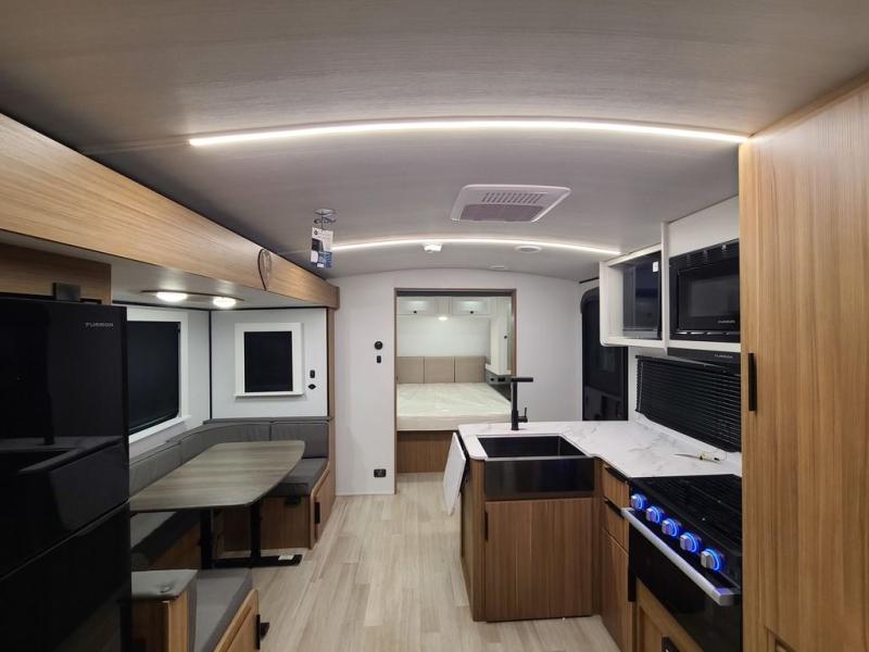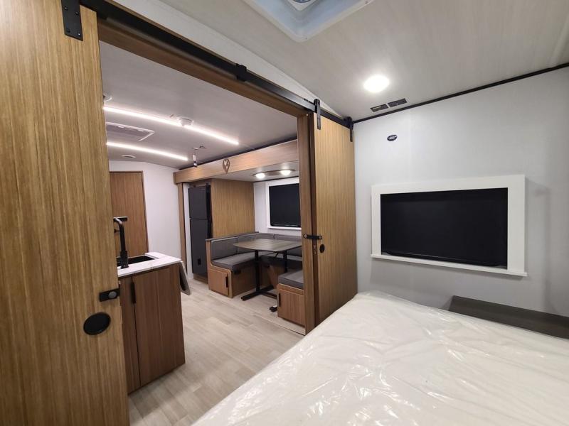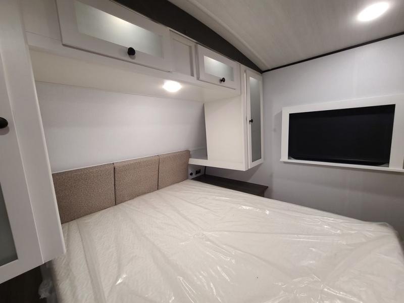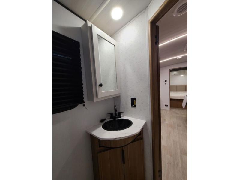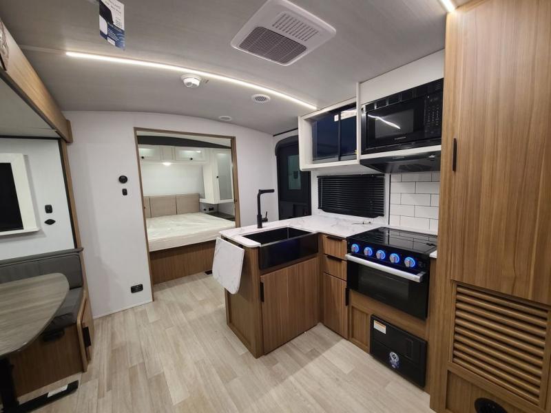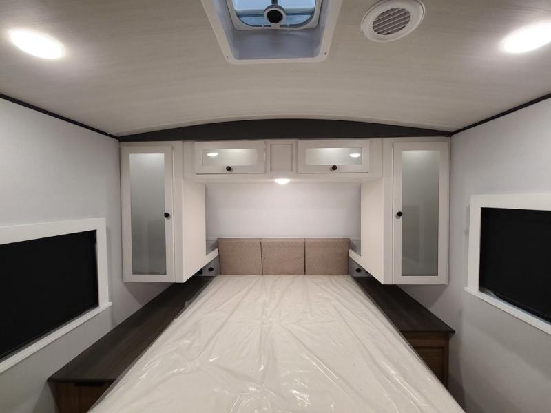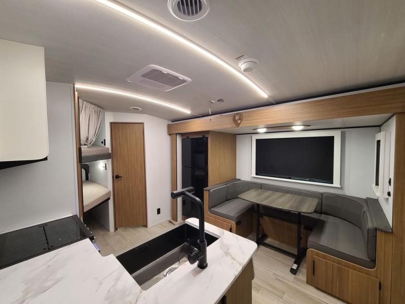 Trips to the lake with a larger group are made easy in this spacious travel trailer! The double-size bunks include a flip-up bunk for added storage, and there is a rear cargo door here so you can easily load gear from outside. The full bath is conveniently located right by the bunks for easy nighttime use, and the pantry is also close by if anyone needs a midnight snack! You will sleep like a baby in the front bedroom that includes a queen bed and dual wardrobes to keep your clothes tidy. In the morning, everyone can meet in the combined living area and kitchen while the chef makes breakfast on the three burner cooktop, and there is a U-shaped do-more dinette table to dine at. If the weather is nice, the chef just may want to cook on the outside kitchen with a griddle, and everyone can sit at the picnic table under the 15' awning!