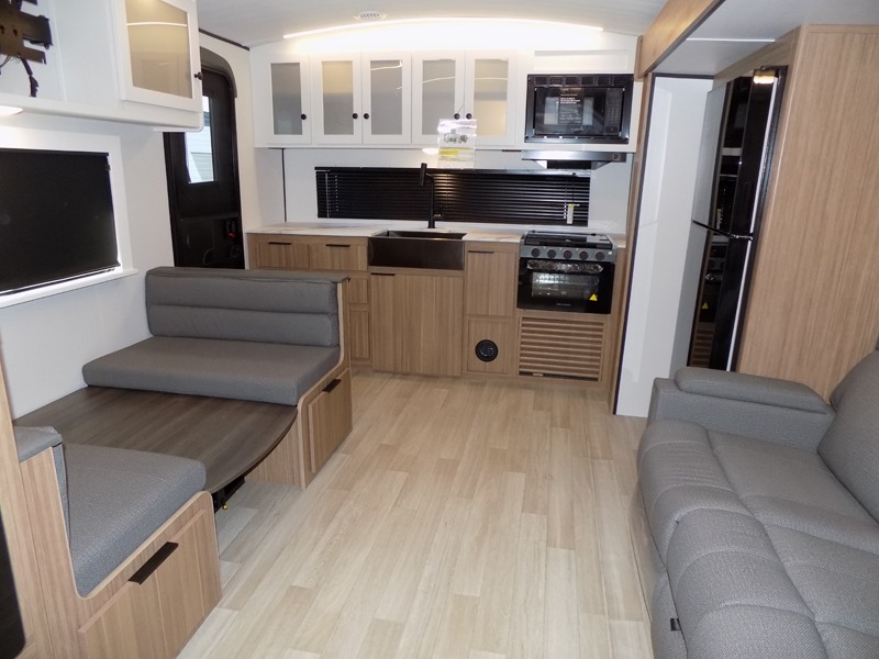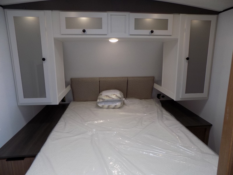 Are you looking to upgrade from a tent to a travel trailer? This dual axle unit may be the one! Since there are dual entry doors, you can enter in through the front master bedroom with a queen bed or the rear kitchen with ample counter space. Your crew can relax on the tri-fold sofa, play a game at the do-more dinette, or visit outdoors under the 19' awning. There is also an outdoor kitchen here for a sunrise breakfast! The walk-thru bath is easily accessible for everyone to use, and you'll find plenty of storage space throughout, including a large pantry, overhead compartments, and dual bedroom wardrobes and nightstands.