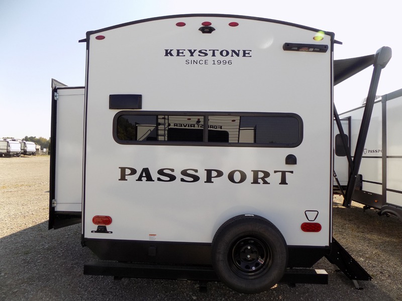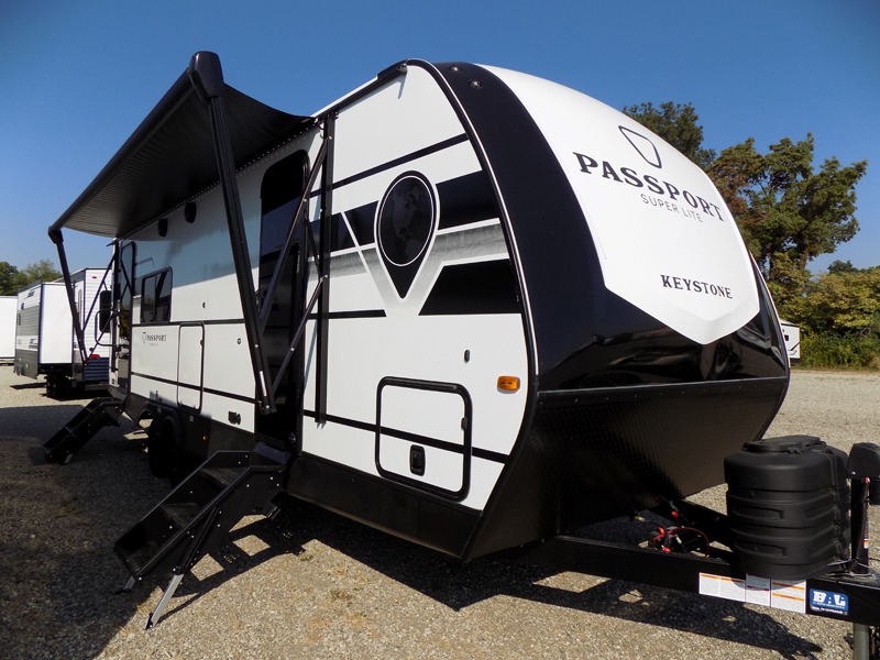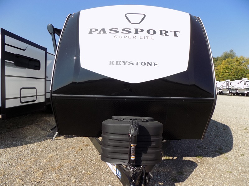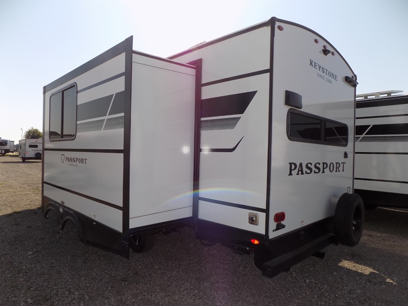 With any Keystone Passport Super Lite travel trailer you will enjoy lightweight towing and lots of interior comforts! The power tongue jack lets you hitch up at the drop of a hat, and the Dexter torsion axle rubber ride suspension will make towing easier than ever. You will appreciate having 4-point power stabilizer jacks for quick setup and an exterior convenience center to monitor tank levels. These trailers feature 5-sided aluminum construction, new premium aluminum wheels, a heated and enclosed underbelly, plus new composite solid entry steps. Inside, you'll enjoy seamless kitchen countertops, interior lights with a dimmer, a rainfall showerhead, and premium pull-down roller shades for added privacy.