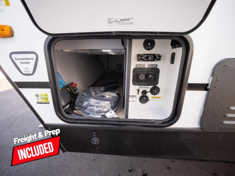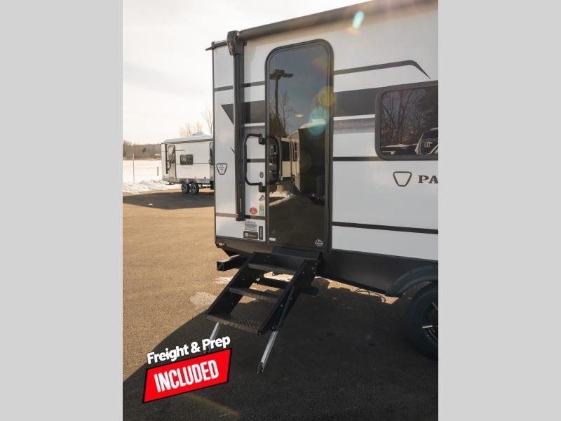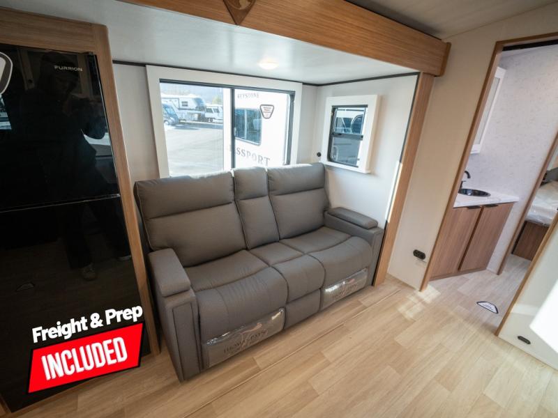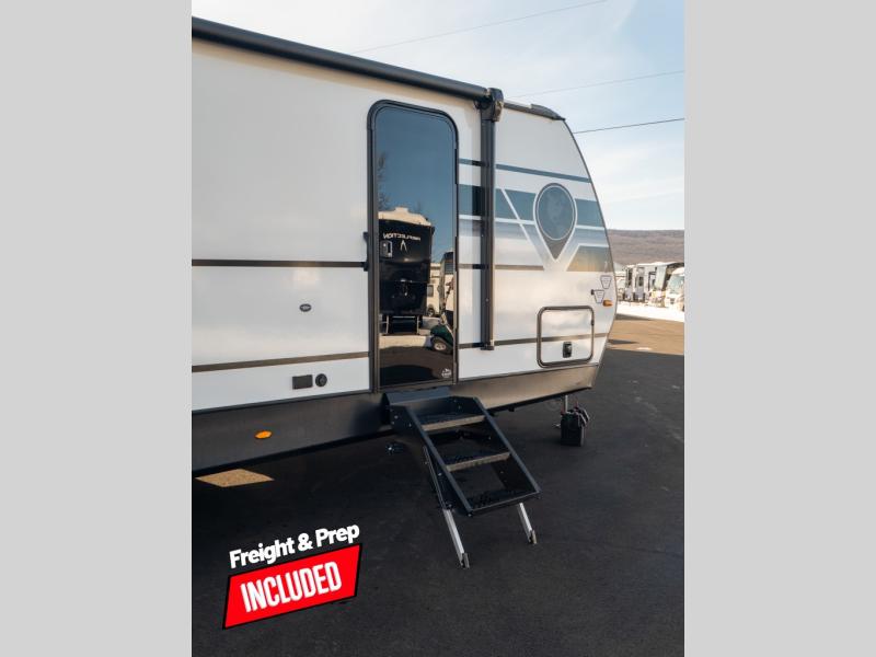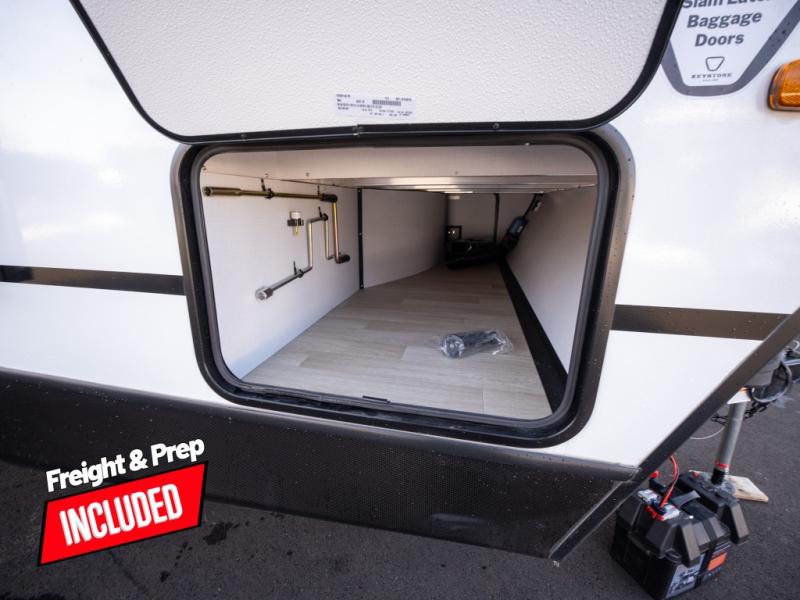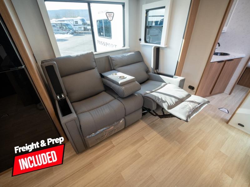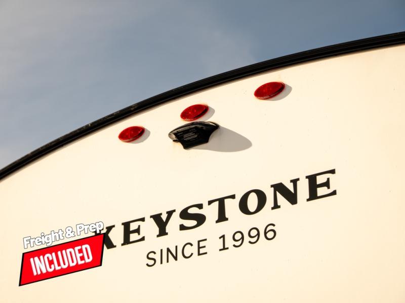 With any Keystone Passport Super Lite travel trailer you will enjoy lightweight towing and lots of interior comforts! The power tongue jack lets you hitch up at the drop of a hat, and the Dexter torsion axle rubber ride suspension will make towing easier than ever. You will appreciate having 4-point power stabilizer jacks for quick setup and an exterior convenience center to monitor tank levels. These trailers feature 5-sided aluminum construction, new premium aluminum wheels, a heated and enclosed underbelly, plus new composite solid entry steps. Inside, you'll enjoy seamless kitchen countertops, interior lights with a dimmer, a rainfall showerhead, and premium pull-down roller shades for added privacy.