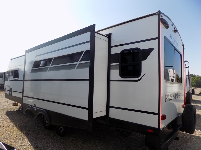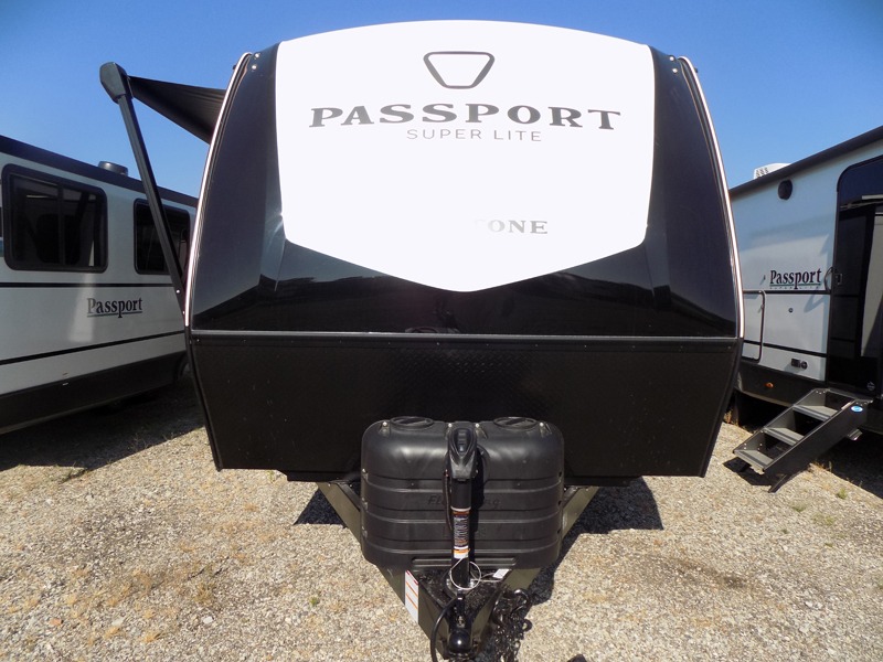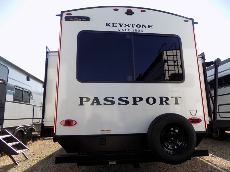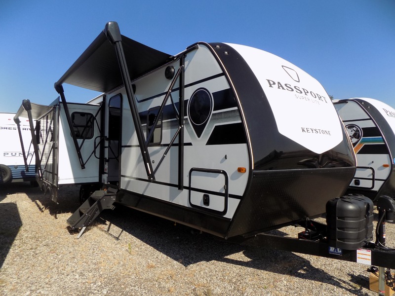 With any Keystone Passport Super Lite travel trailer you will enjoy lightweight towing and lots of interior comforts! The power tongue jack lets you hitch up at the drop of a hat, and the Dexter torsion axle rubber ride suspension will make towing easier than ever. You will appreciate having 4-point power stabilizer jacks for quick setup and an exterior convenience center to monitor tank levels. These trailers feature 5-sided aluminum construction, new premium aluminum wheels, a heated and enclosed underbelly, plus new composite solid entry steps. Inside, you'll enjoy seamless kitchen countertops, interior lights with a dimmer, a rainfall showerhead, and premium pull-down roller shades for added privacy.