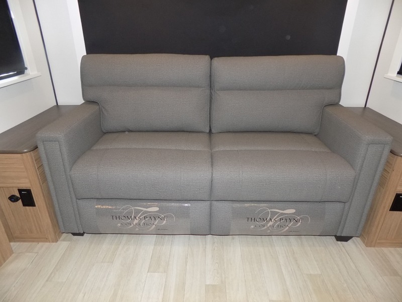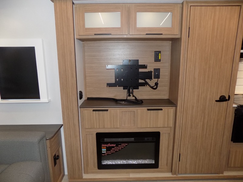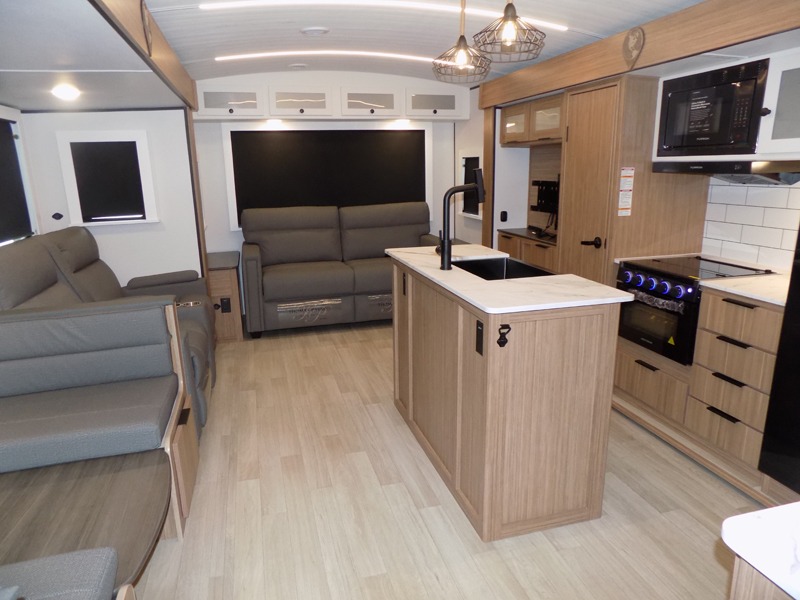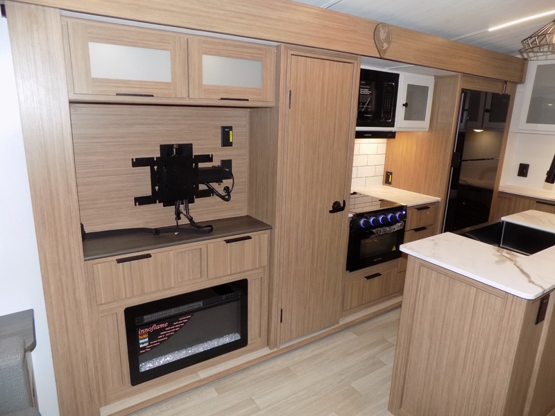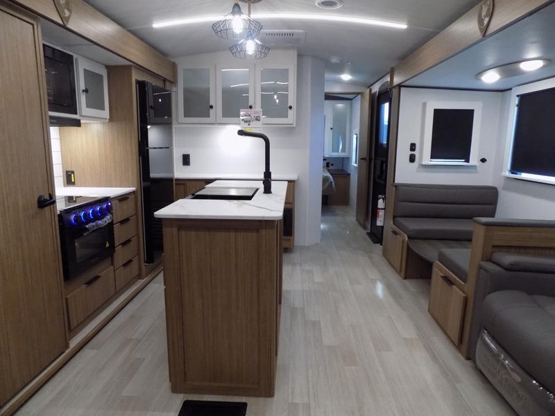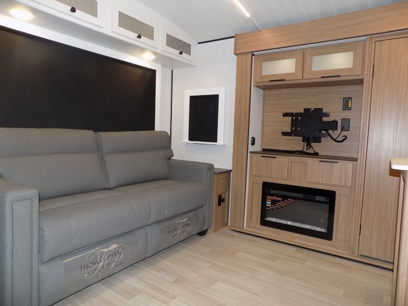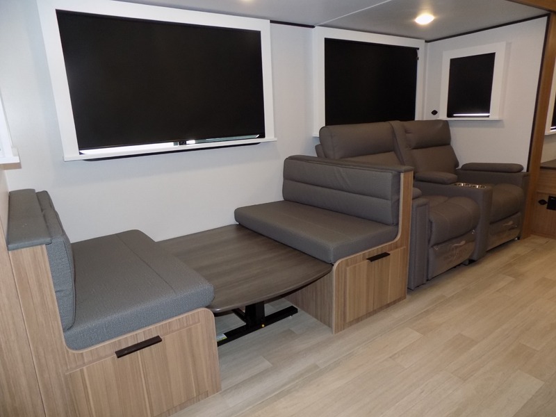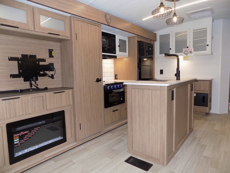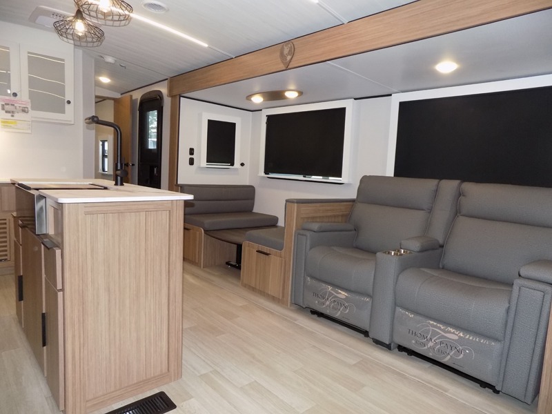 This is the travel trailer you've been searching for with a spacious interior, a front private bedroom, and a kitchen island for more counter space! Your crew can relax on the tri-fold sofa sleeper and luxury cinema theater seating, or play a game at the do-more dinette table. There is also an entertainment center and a fireplace to make this space feel more like home. A full kitchen, complete with a large pantry and 12V refrigerator will keep the chef of your group happy, and the full bath will let everyone clean up before bed. When it's time to call it a night, the front bedroom with a queen bed will be waiting for you, while your guests sleep on the sofa and dinette.