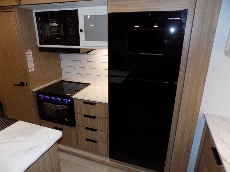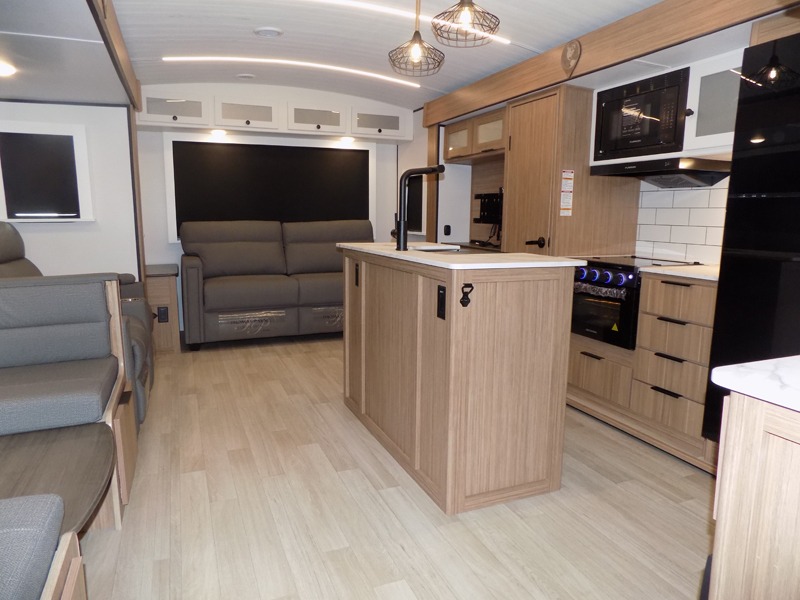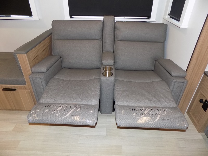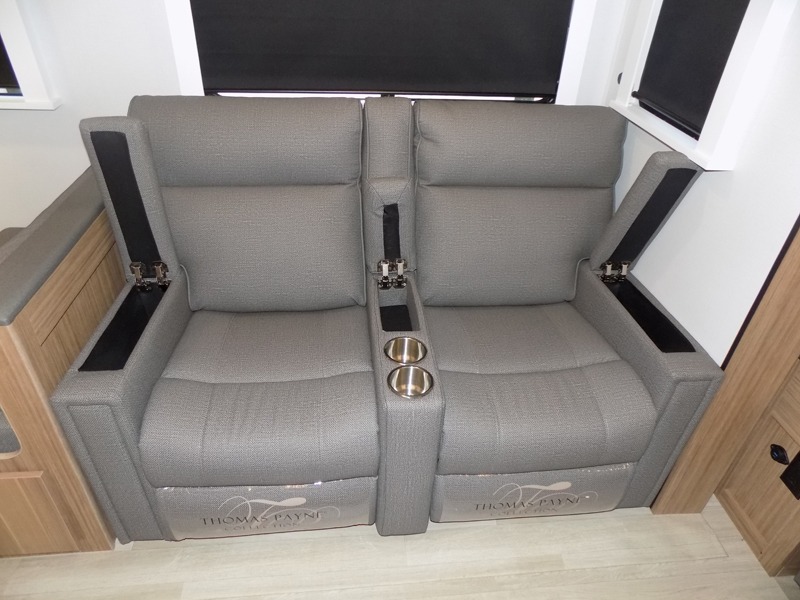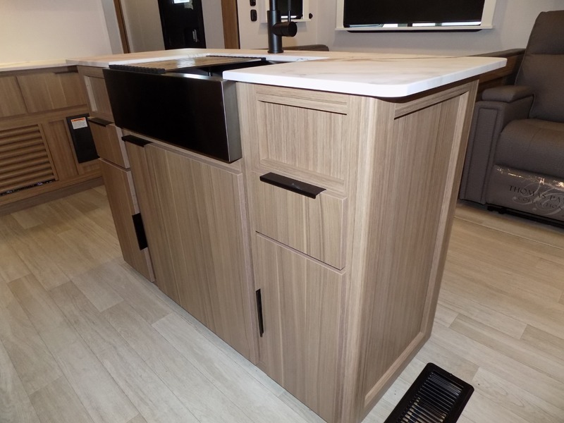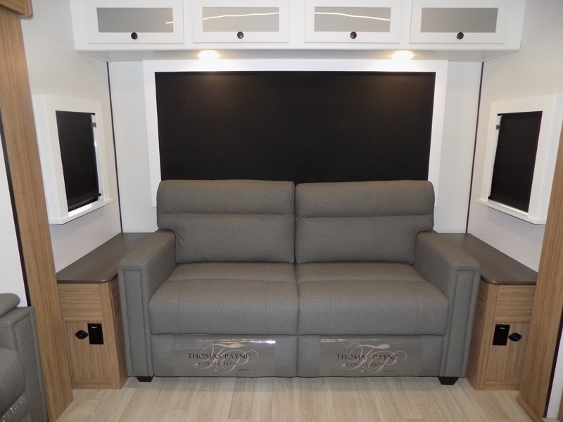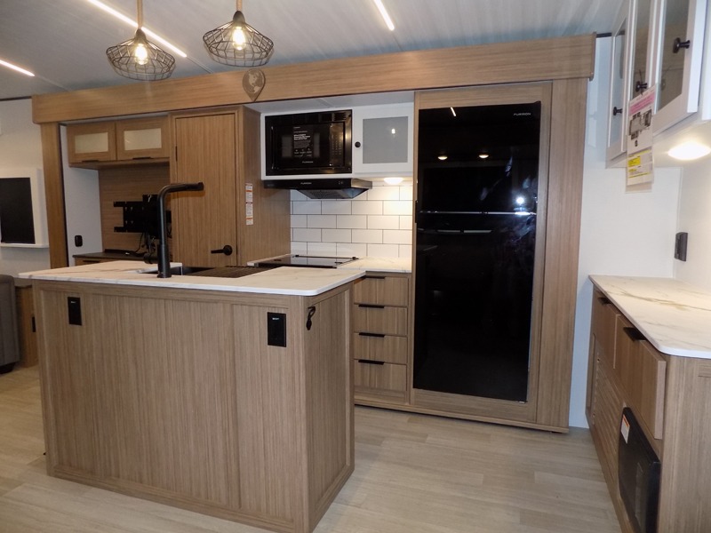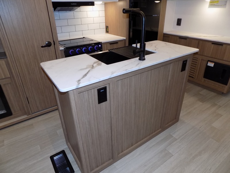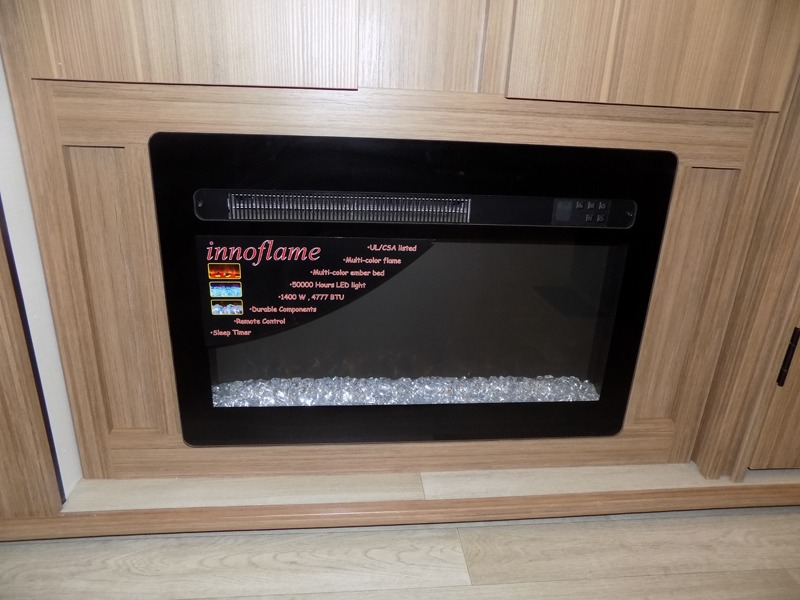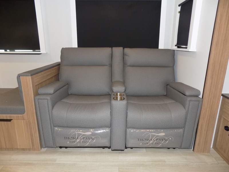 This is the travel trailer you've been searching for with a spacious interior, a front private bedroom, and a kitchen island for more counter space! Your crew can relax on the tri-fold sofa sleeper and luxury cinema theater seating, or play a game at the do-more dinette table. There is also an entertainment center and a fireplace to make this space feel more like home. A full kitchen, complete with a large pantry and 12V refrigerator will keep the chef of your group happy, and the full bath will let everyone clean up before bed. When it's time to call it a night, the front bedroom with a queen bed will be waiting for you, while your guests sleep on the sofa and dinette.