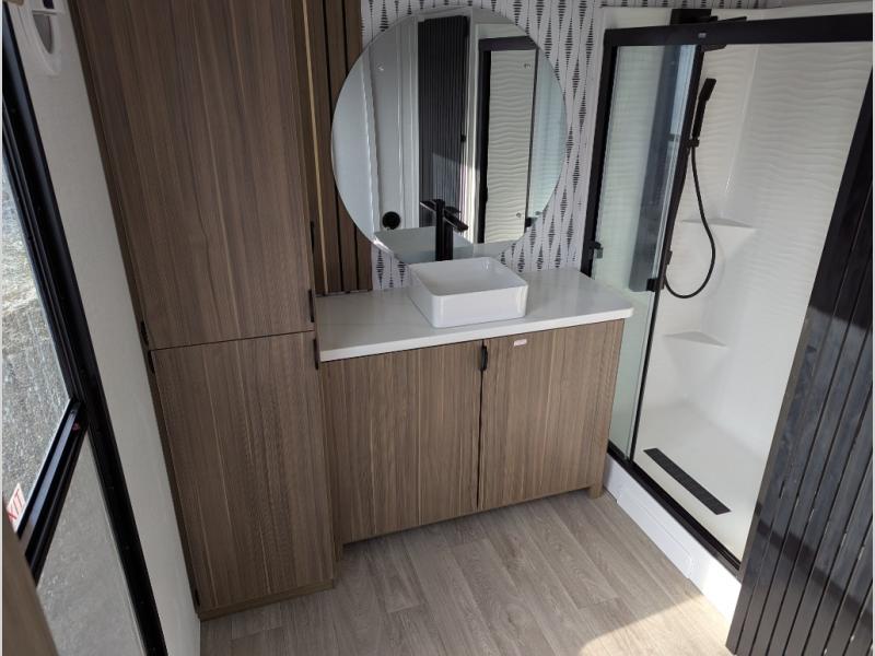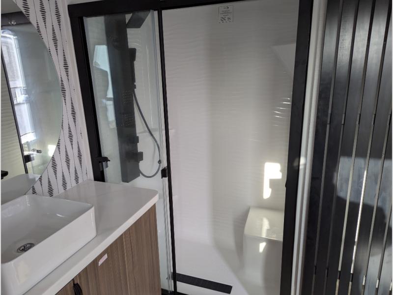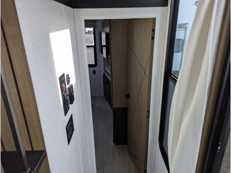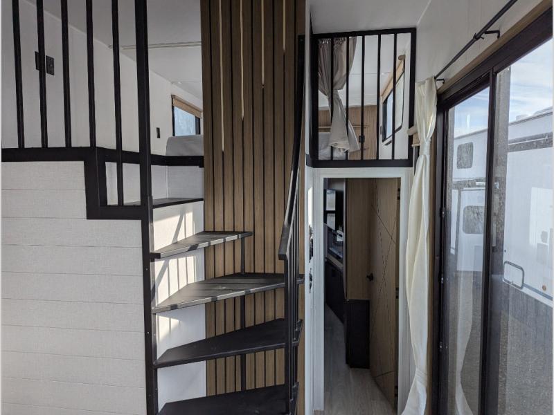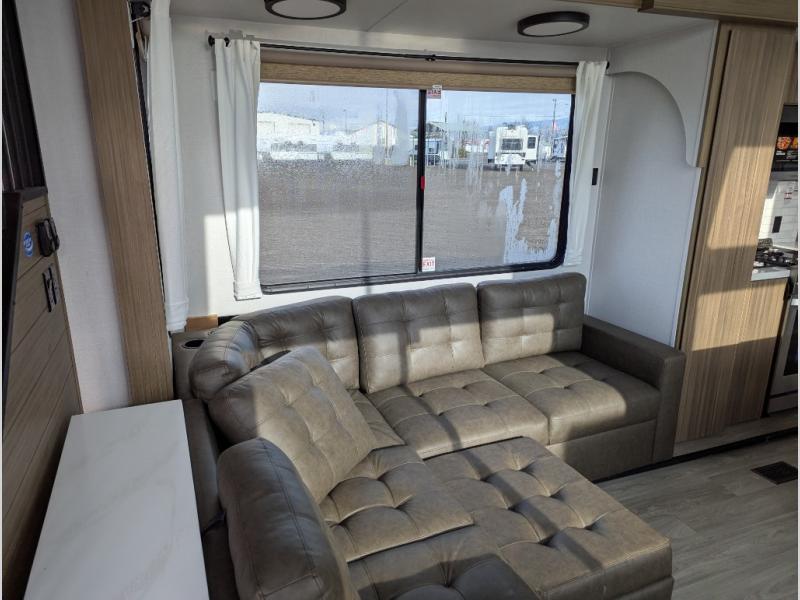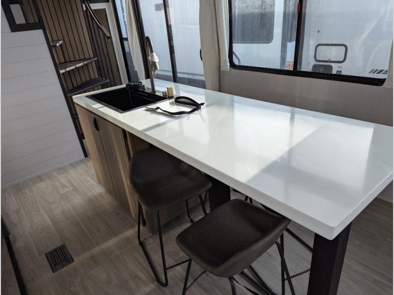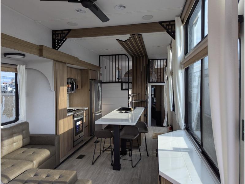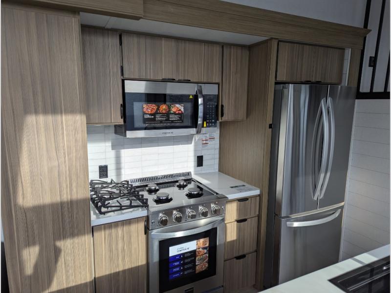 Start camping in luxury with this decked out toy hauler! The front private bedroom has a king bed slide for more interior space, a Smart LED TV, a front large wardrobe, plus washer and dryer prep. Freshen up each morning in the full bathroom with the fiberglass one-piece shower then head to the kitchen to fry up some eggs on the four burner Lusso range and bake some cinnamon rolls in the 24" stainless steel oven. Grab a cold cup of orange juice from the 20 cu. ft. 12 volt refrigerator and enjoy it along with the eggs at the kitchen island which includes three folding bar stools. The 4-seat recliner slide is conveniently across from the entertainment center with a 50" Smart LED TV and fireplace. As you head into the 11' garage area, you will notice a loft with a twin bed, dual opposing sofas with a HappiJac bed set up above, and a half bathroom, plus one of the dual entry doors to the unit!
