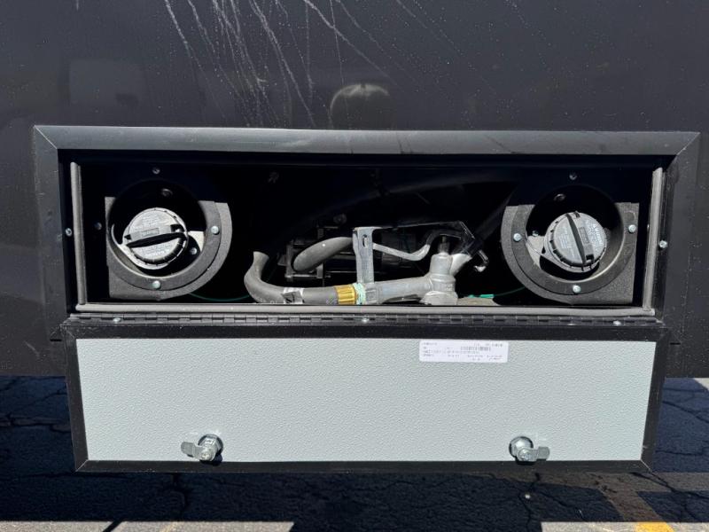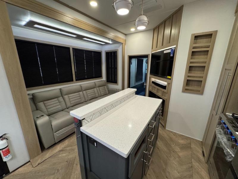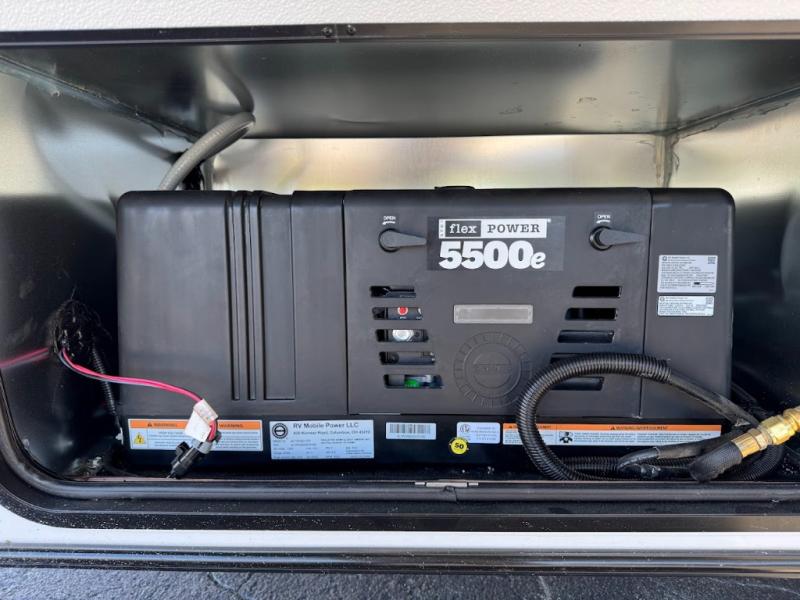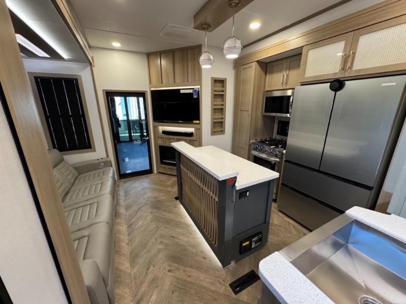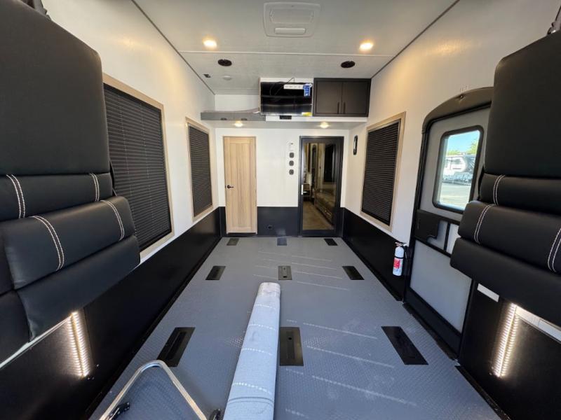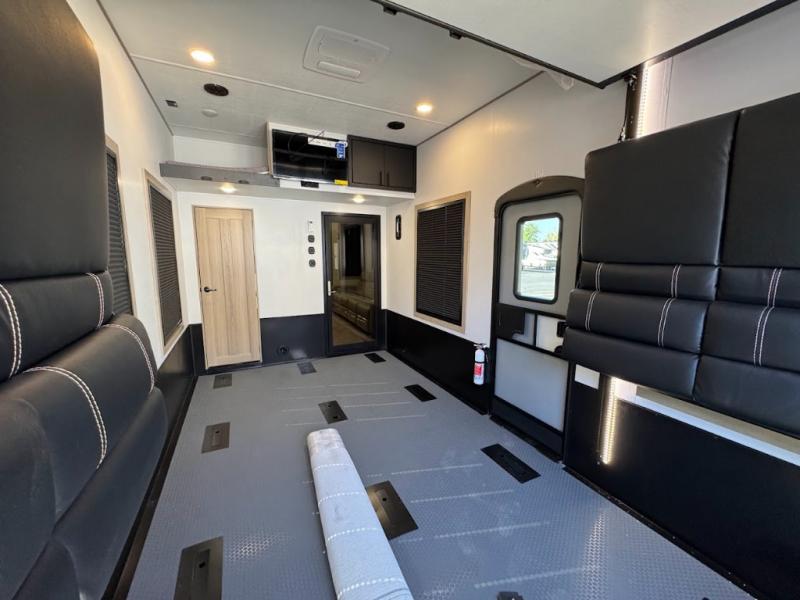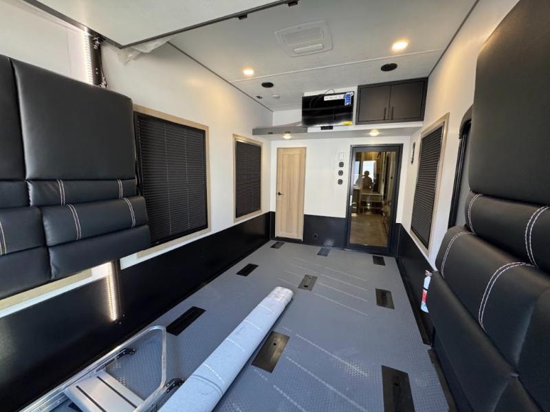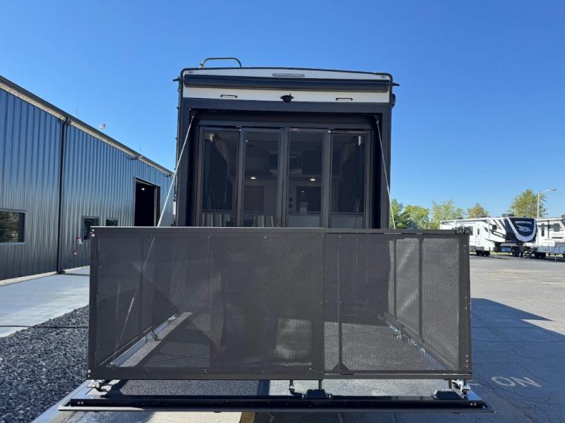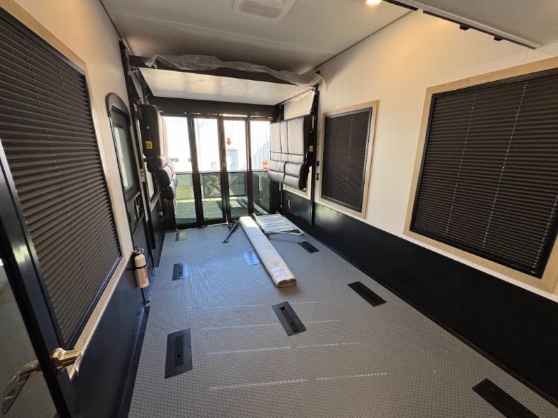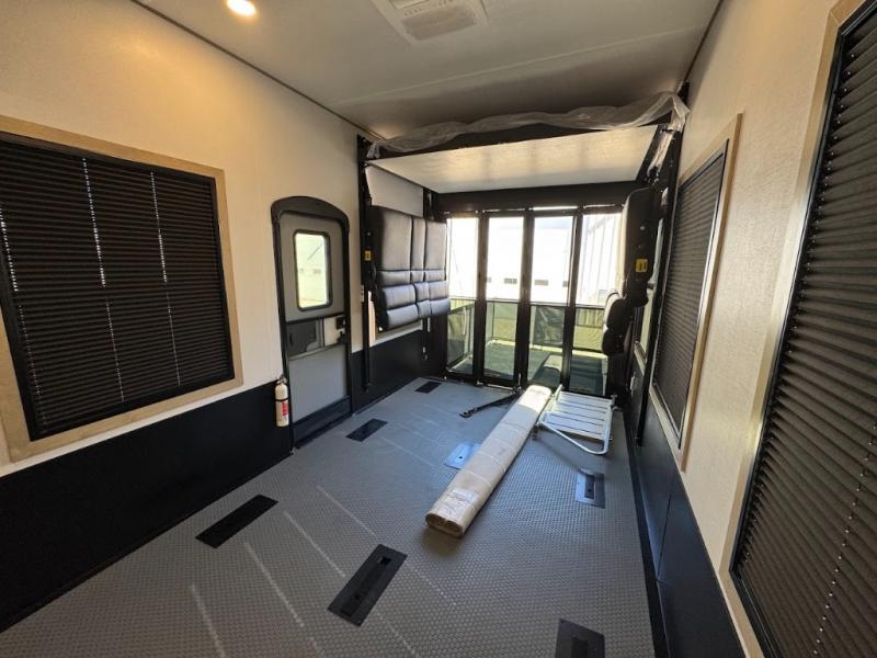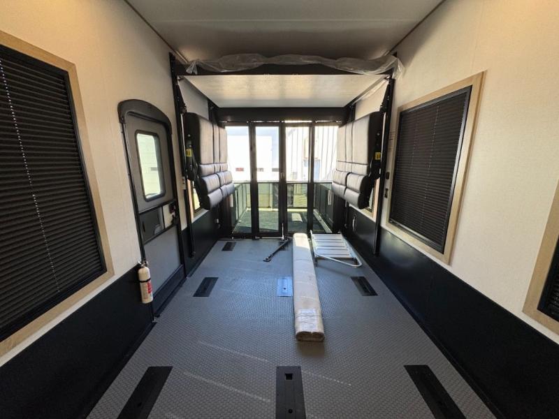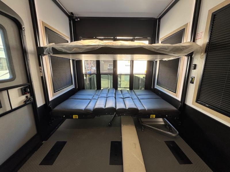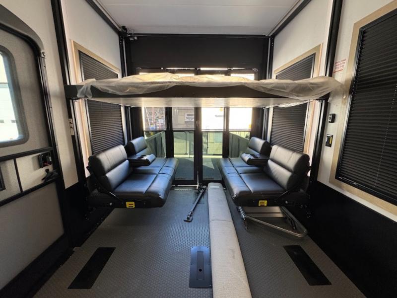 You will have everything you need for a comfortable camping trip and then some with this toy hauler! Load your toys into the 16' garage area with the Lippert Power Play motorized ramp door and secure them with 5,000 lb. frame welded tie-downs. The garage also has an electric bed above dual opposing sofas with a loft with a twin bed and a half bathroom. Create your best meals with the four-burner cooktop and enjoy the company of others sitting at the kitchen island with three bar stools while you prepare it. Relax in true comfort on the 4-seat recliner across from the entertainment center with a fireplace. When you're ready to wind down your nights, take a hot shower in the full bathroom then head directly into the front private bedroom which features a king bed suite with a large front wardrobe for clothing storage, and washer/dryer prep in case you wish to add appliances so you can wash your clothes while you are away!