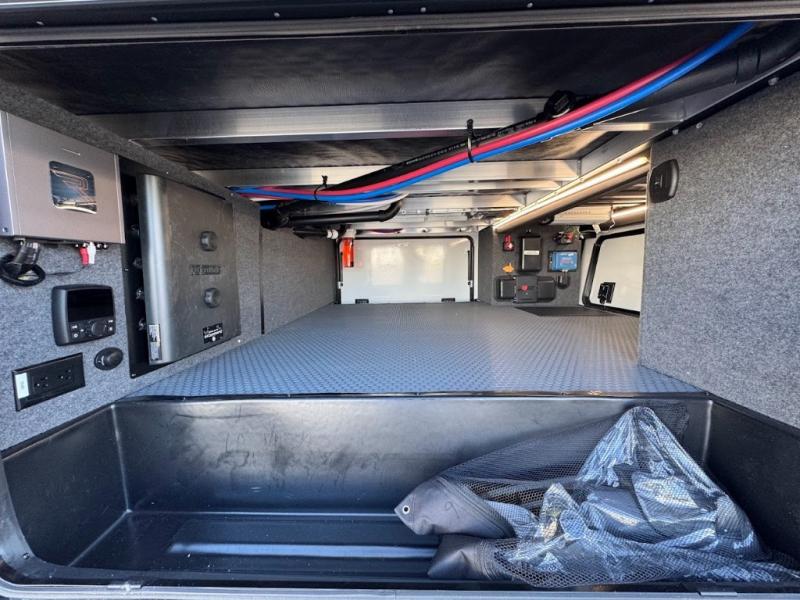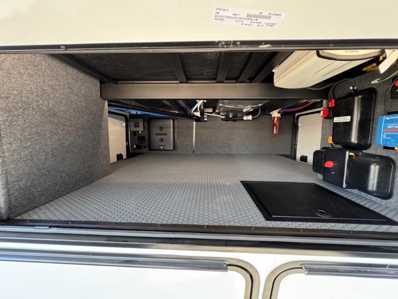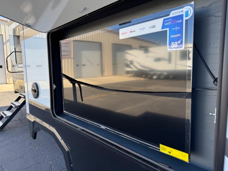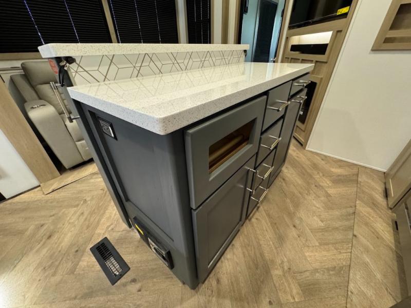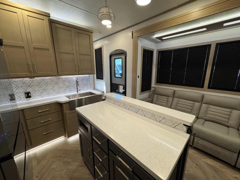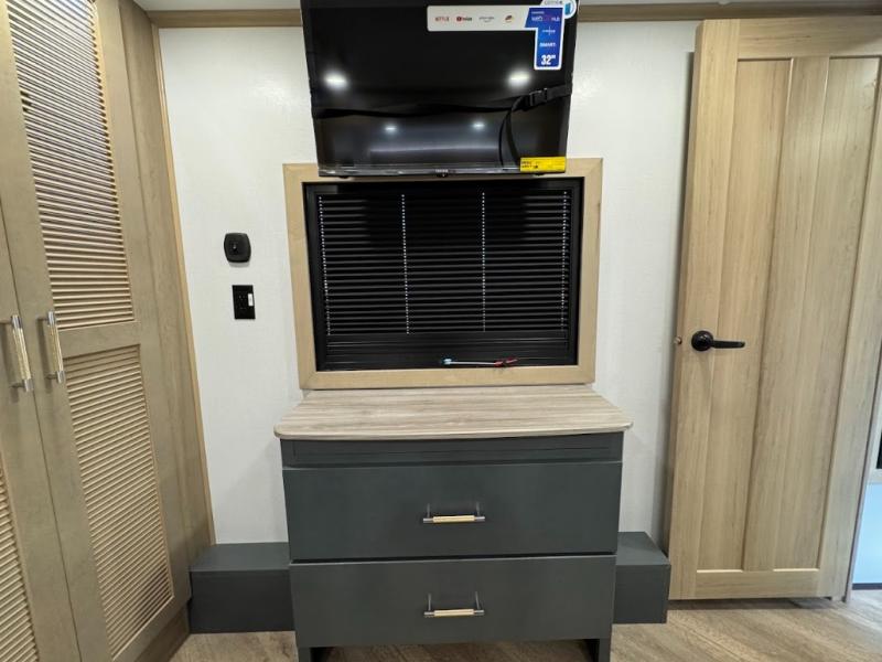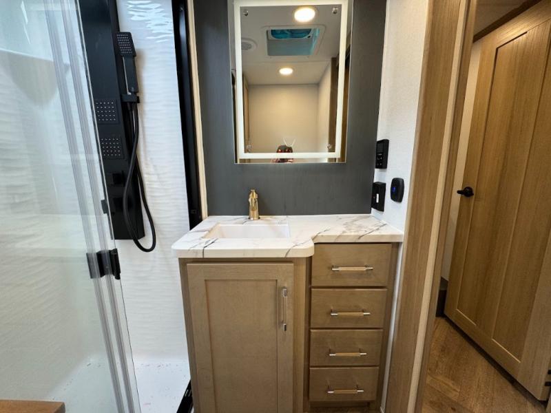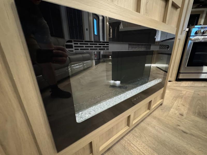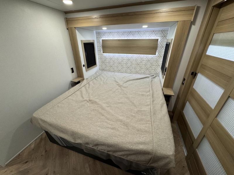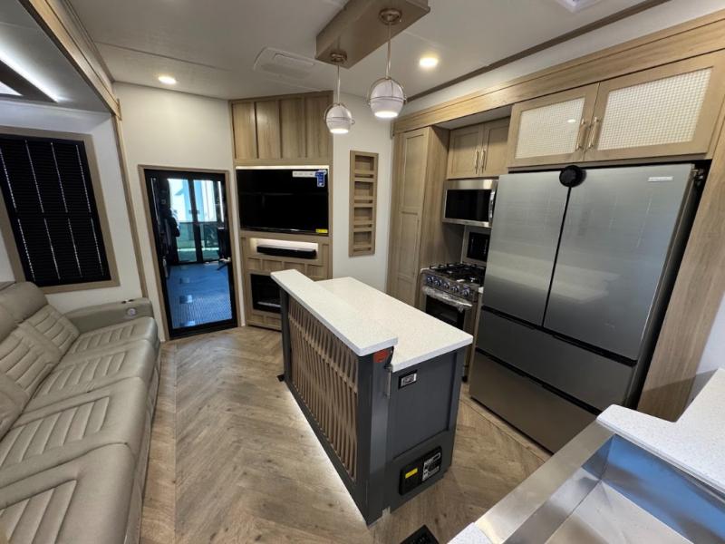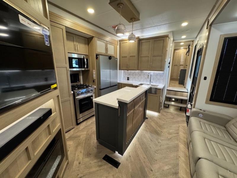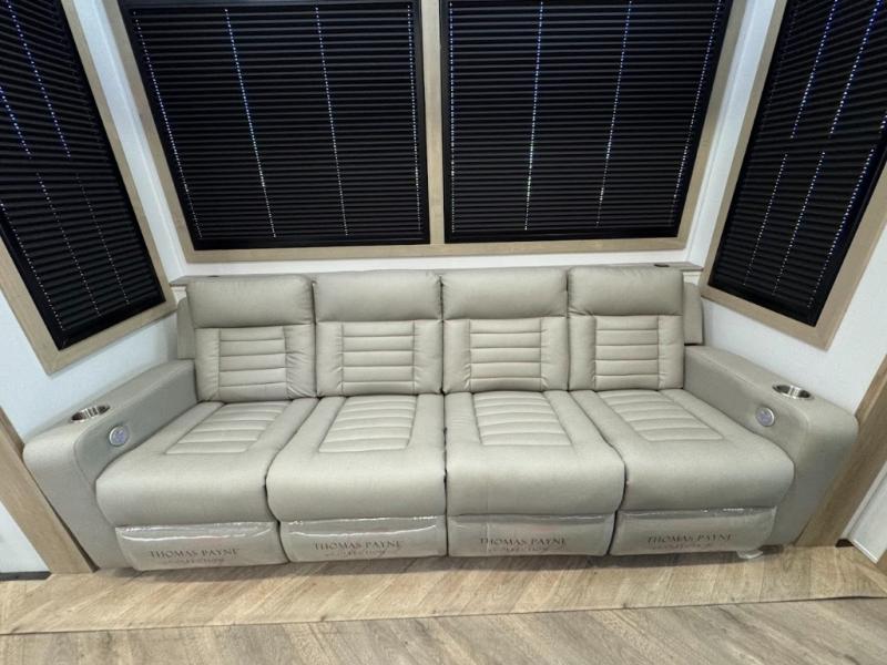 You will have everything you need for a comfortable camping trip and then some with this toy hauler! Load your toys into the 16' garage area with the Lippert Power Play motorized ramp door and secure them with 5,000 lb. frame welded tie-downs. The garage also has an electric bed above dual opposing sofas with a loft with a twin bed and a half bathroom. Create your best meals with the four-burner cooktop and enjoy the company of others sitting at the kitchen island with three bar stools while you prepare it. Relax in true comfort on the 4-seat recliner across from the entertainment center with a fireplace. When you're ready to wind down your nights, take a hot shower in the full bathroom then head directly into the front private bedroom which features a king bed suite with a large front wardrobe for clothing storage, and washer/dryer prep in case you wish to add appliances so you can wash your clothes while you are away!