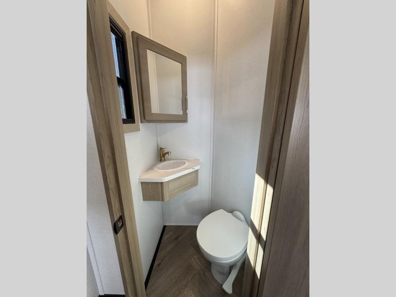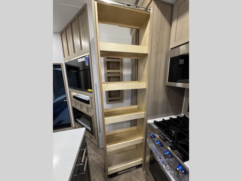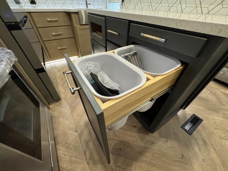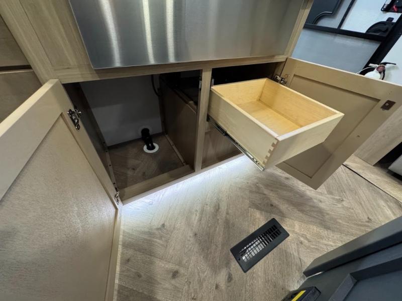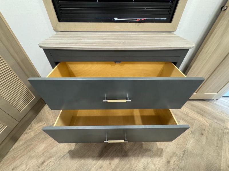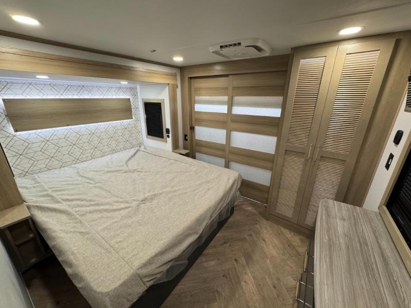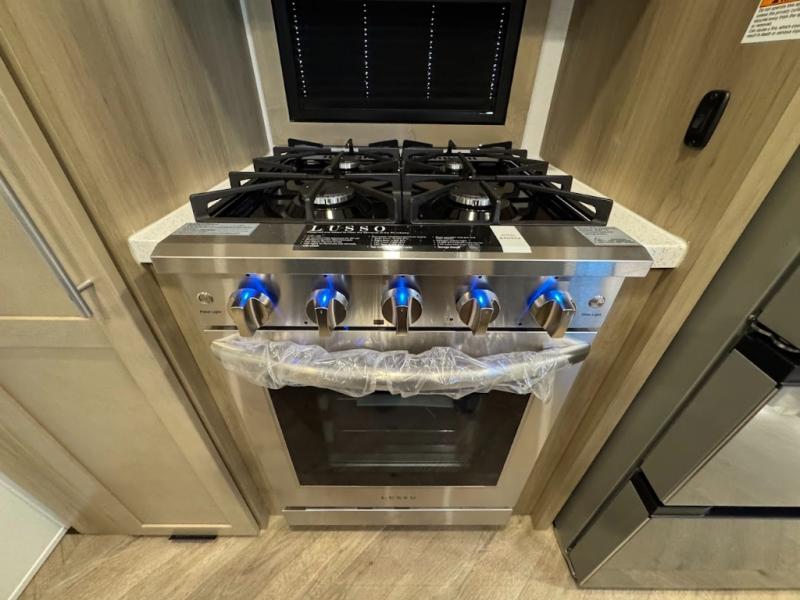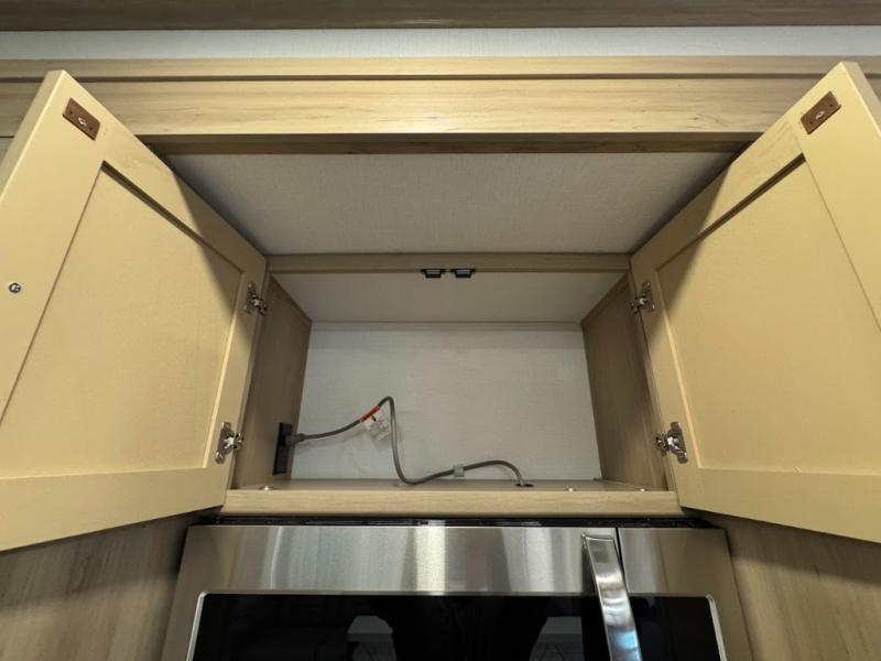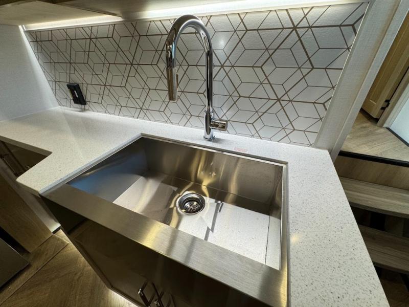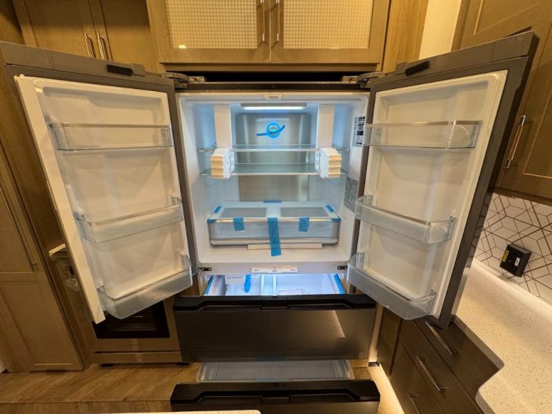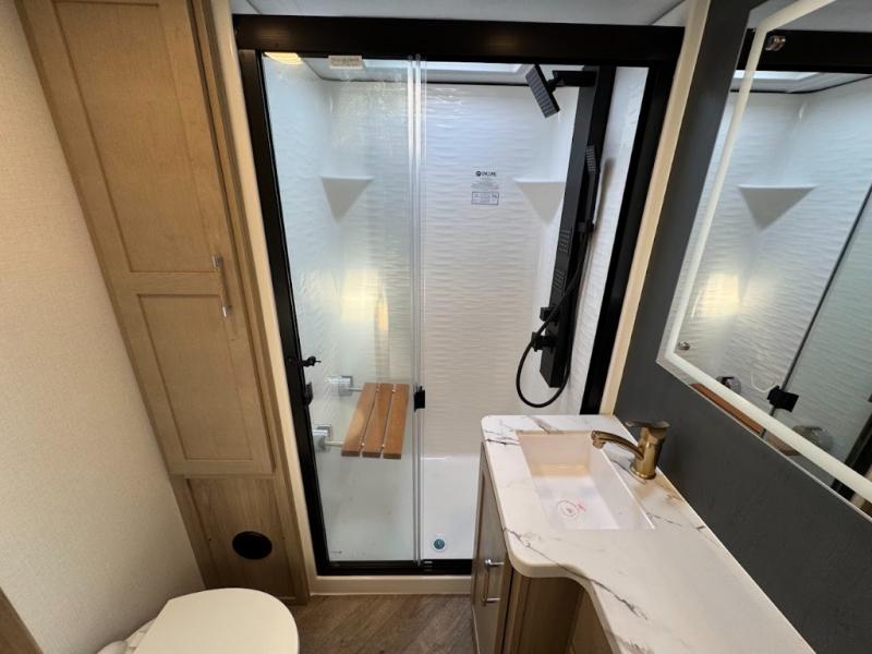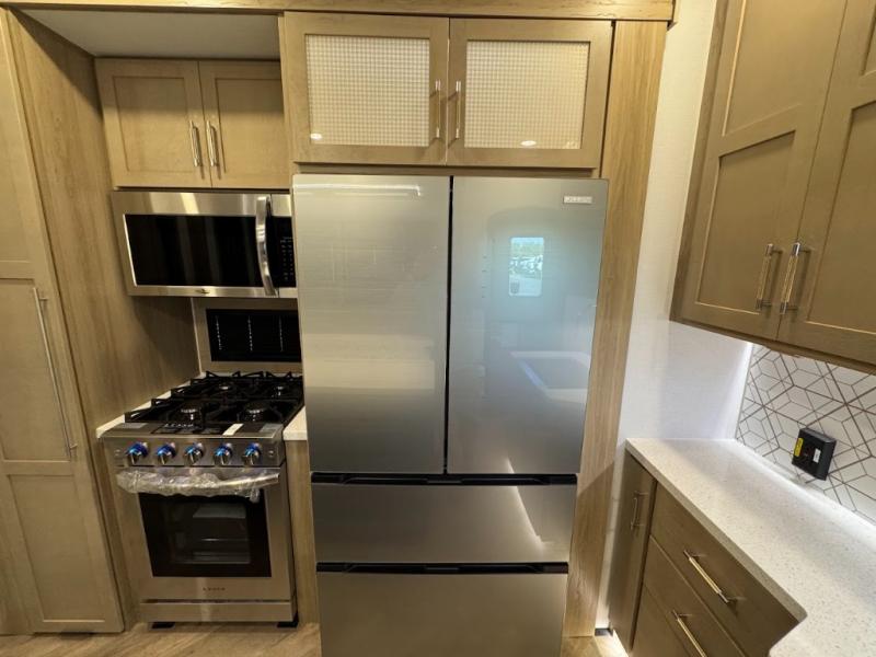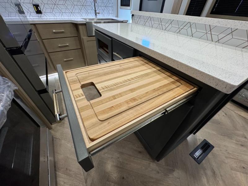 You will have everything you need for a comfortable camping trip and then some with this toy hauler! Load your toys into the 16' garage area with the Lippert Power Play motorized ramp door and secure them with 5,000 lb. frame welded tie-downs. The garage also has an electric bed above dual opposing sofas with a loft with a twin bed and a half bathroom. Create your best meals with the four-burner cooktop and enjoy the company of others sitting at the kitchen island with three bar stools while you prepare it. Relax in true comfort on the 4-seat recliner across from the entertainment center with a fireplace. When you're ready to wind down your nights, take a hot shower in the full bathroom then head directly into the front private bedroom which features a king bed suite with a large front wardrobe for clothing storage, and washer/dryer prep in case you wish to add appliances so you can wash your clothes while you are away!