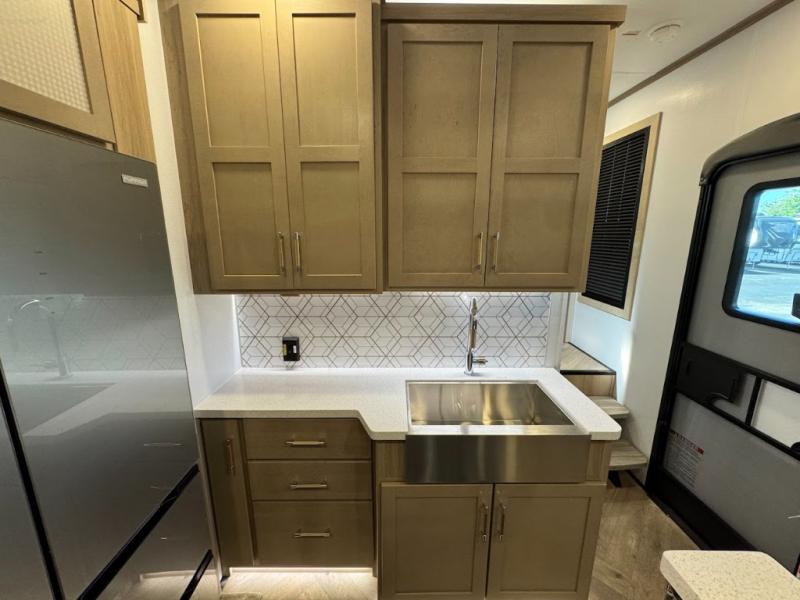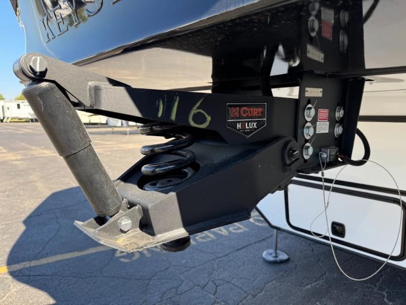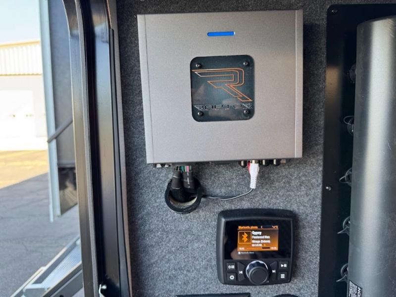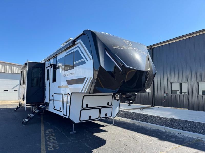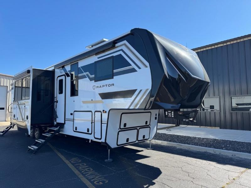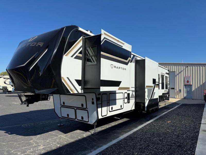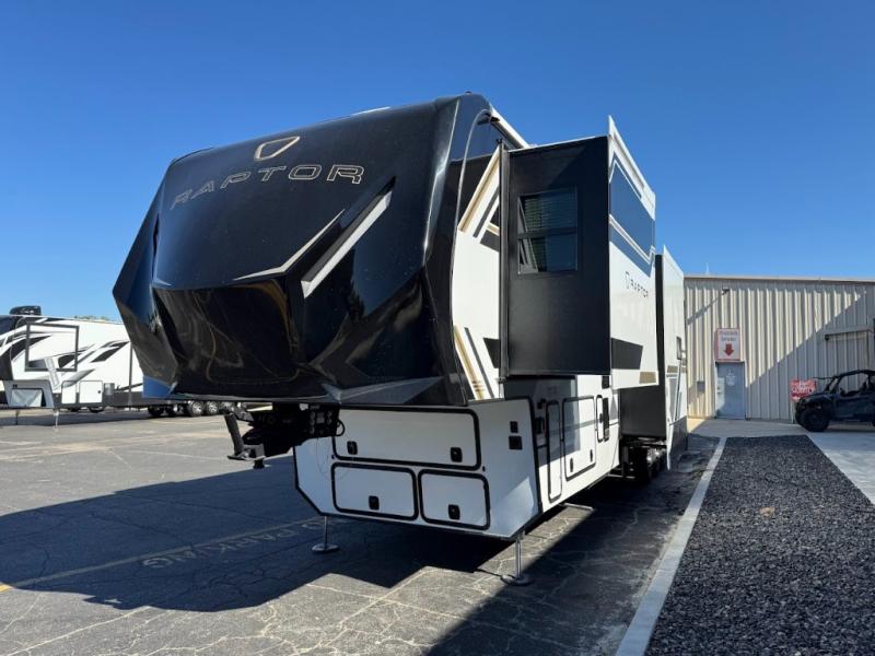 Experience a breath of fresh air with one of these Keystone RV Raptor fifth wheel toy haulers! Their rugged construction consists of a one-piece Alpha Super Flex TPO roof membrane, Dyna Span floor decking, and 5,000 lb. frame-welded tie- downs to keep your toys in place as you travel. Some unexpected conveniences you will appreciate include an Omni-Chill A/C system to keep you cool on those hot summer days, a Furrion backup camera, MaxTurn™ technology with a Helux™ pin box, and a Generation 3 iN-Command smart automation system with Global Connect to make life easier. There is also designer style vinyl flooring throughout, along with new ceiling treatment with LED accent lighting, beach wood and white cabinetry, and many more interior comforts!