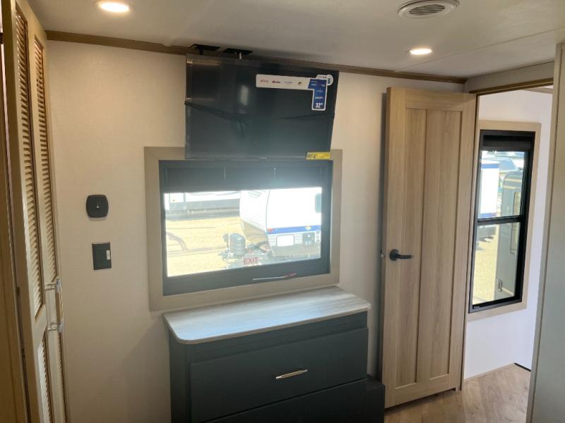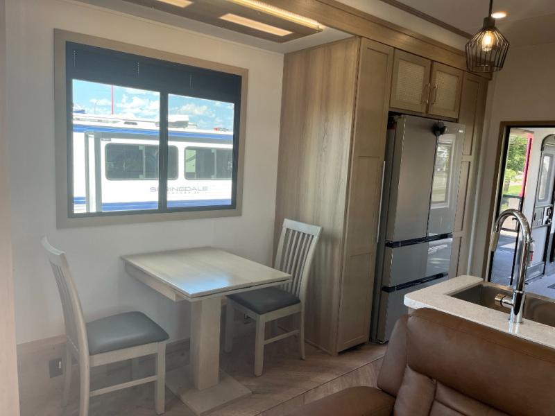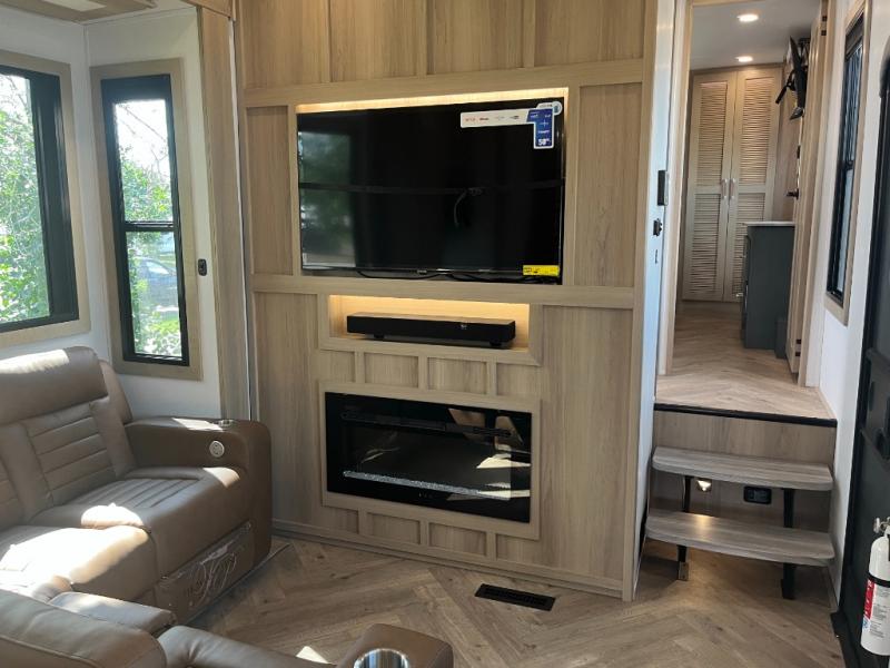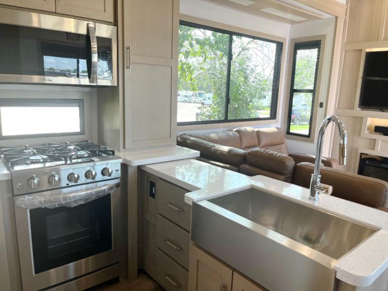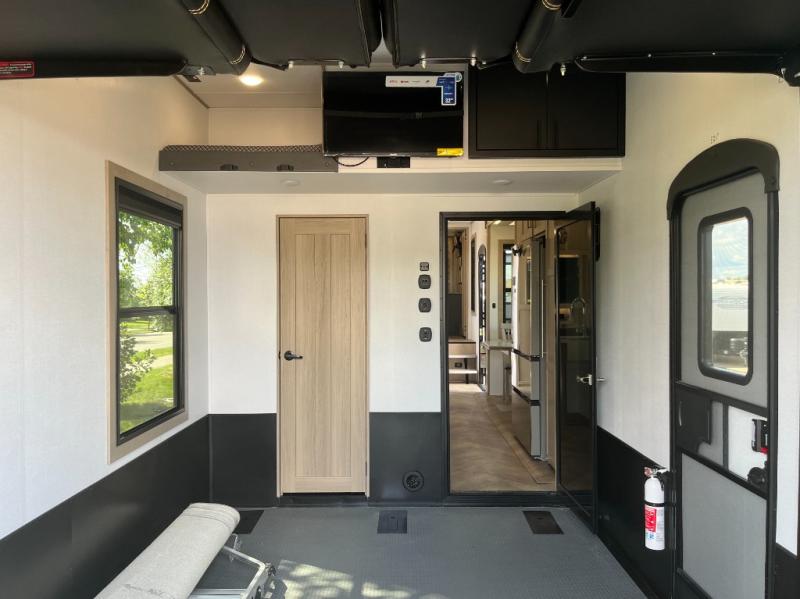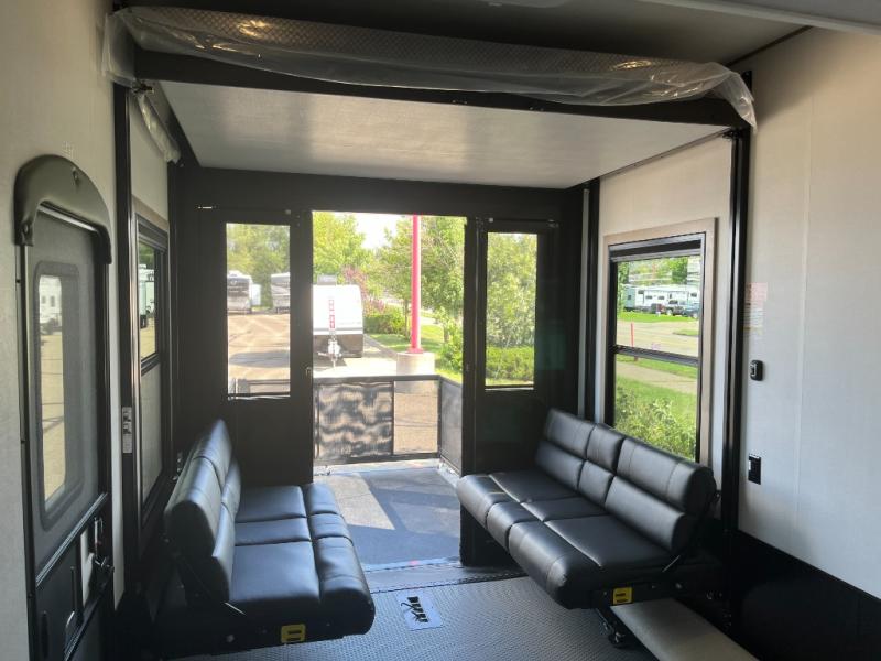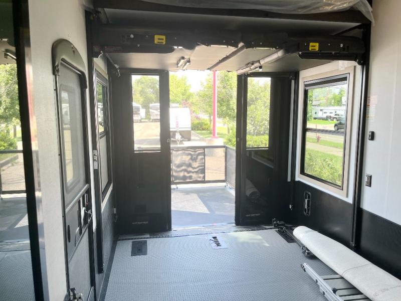 There's room for everyone in this toy hauler! The front private bedroom has a king bed slide for more interior space, a Smart LED TV, a front large wardrobe, plus washer and dryer prep. With two full bathrooms, it will be easy for everyone to get the mud rinsed out of their hair after a fun time on the trails. Start each morning off with a belly full of eggs cooked on the four burner Lusso range and cinnamon rolls baked in the 24" stainless steel oven. Grab a cold cup of orange juice from the 20 cu. ft. 12 volt refrigerator and enjoy it along with the eggs at the dinette table or in the 13' 6" garage on one of the dual opposing sofas with table in between. The L-shaped sofa is conveniently across from the entertainment center with a 50" Smart LED TV and fireplace. As you head into the 13' 6" garage area, you will notice a loft with twin bed, a queen bed above the opposing sofas, Raptor exclusive frame welded tie downs, a full bathroom, and one of the dual entry doors to the unit!
