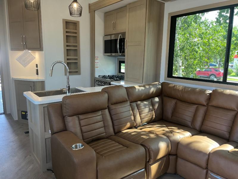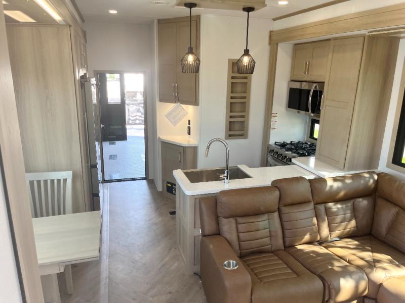 Experience a breath of fresh air with one of these Keystone RV Raptor fifth wheel toy haulers! Their rugged construction consists of a one-piece Alpha Super Flex TPO roof membrane, Dyna Span floor decking, and 5,000 lb. frame-welded tie- downs to keep your toys in place as you travel. Some unexpected conveniences you will appreciate include an Omni-Chill A/C system to keep you cool on those hot summer days, a Furrion backup camera, MaxTurn™ technology with a Helux™ pin box, and a Generation 3 iN-Command smart automation system with Global Connect to make life easier. There is also designer style vinyl flooring throughout, along with hardwood ceiling treatment with LED accent lighting, beach wood and white cabinetry, and many more interior comforts!
