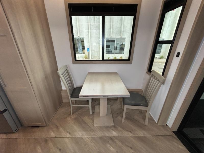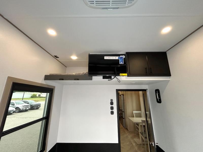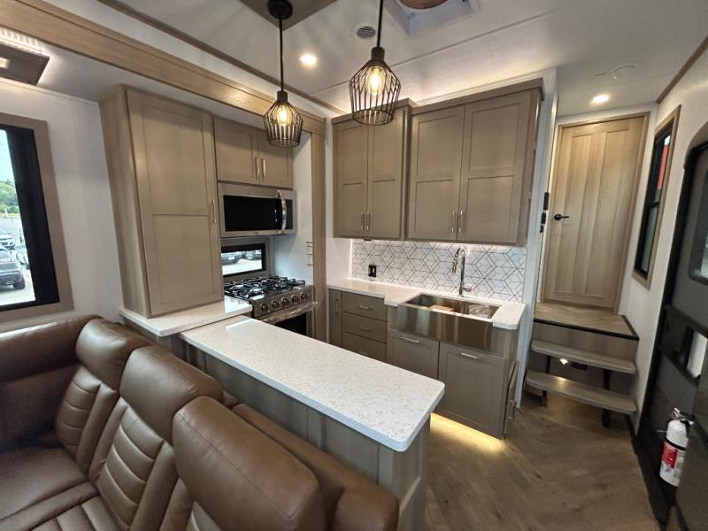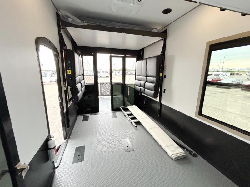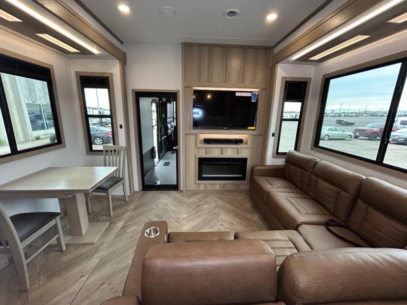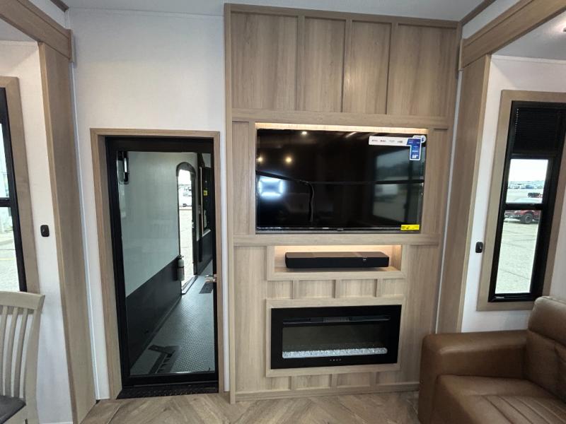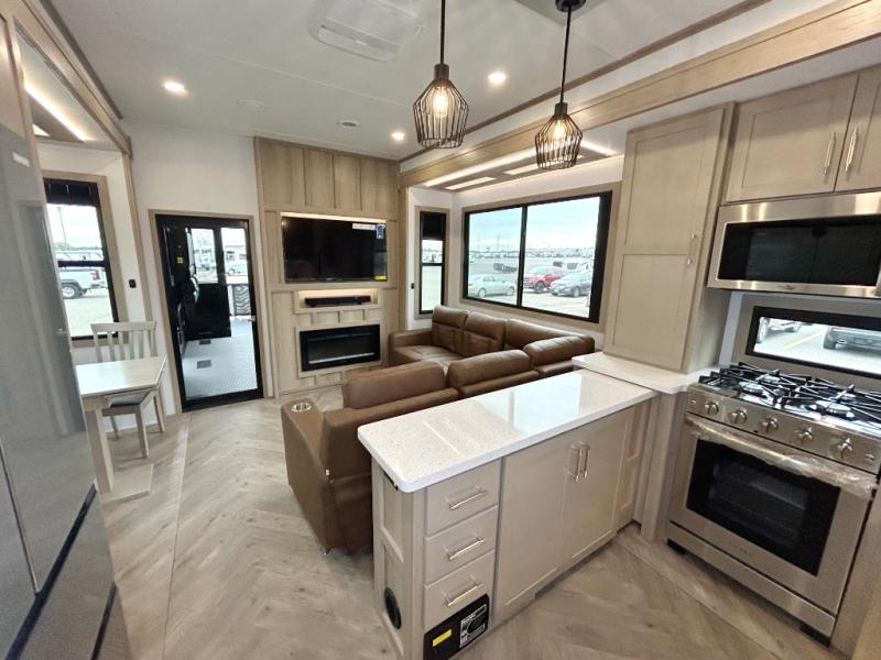 The whole family will love camping in this fifth wheel toy hauler! The front private bedroom has a king bed slide for more interior space, a Smart LED TV, a front large wardrobe, plus washer and dryer prep. Freshen up each morning in the full bathroom with the fiberglass one-piece shower then head to the kitchen to fry up some eggs on the four-burner range and bake some cinnamon rolls in the 24" stainless steel oven. Grab a cold cup of orange juice from the 20-cu. ft. 12-volt refrigerator and enjoy it along with the eggs at the dinette table or in the 15' garage on one of the dual opposing sofas with cupholders. The L-shaped hide-a-bed sofa is conveniently across from the entertainment center with a 50" Smart LED TV and fireplace. As you head into the 15' garage area, you will notice a loft with a twin bed, a queen bed above the opposing sofas, Adjust-A-Track frame welded tie downs, and one of the dual entry doors to the unit!