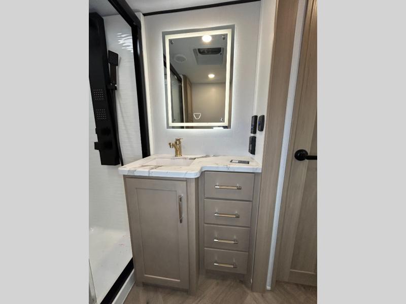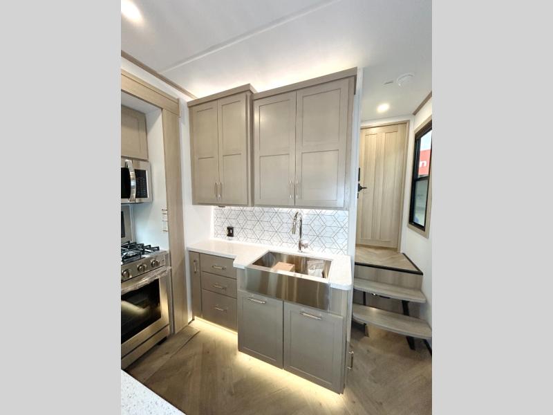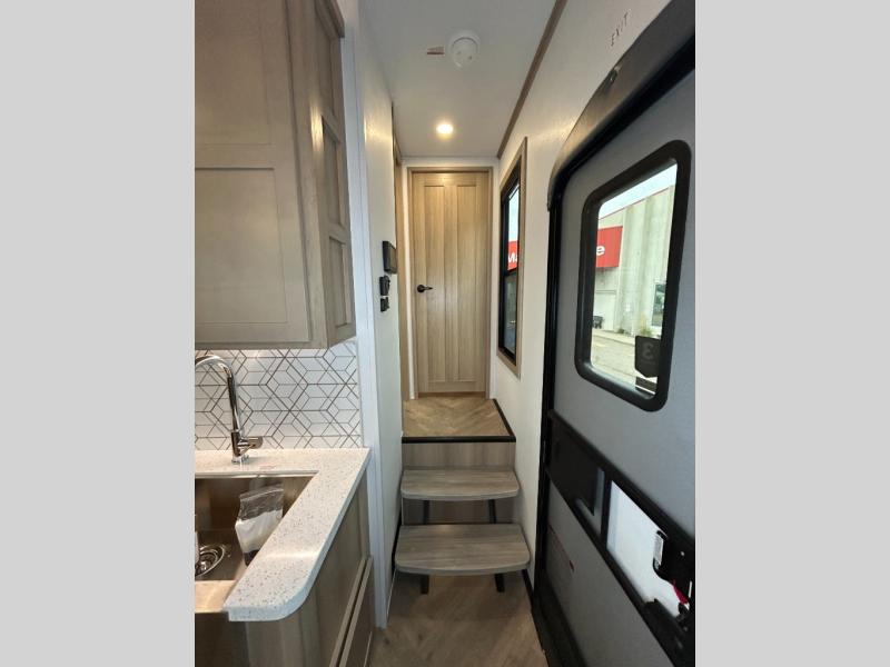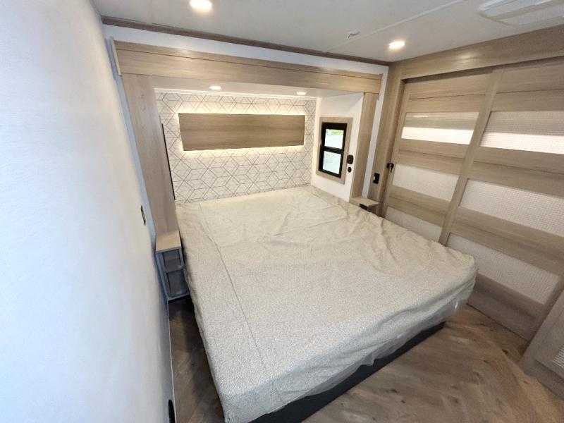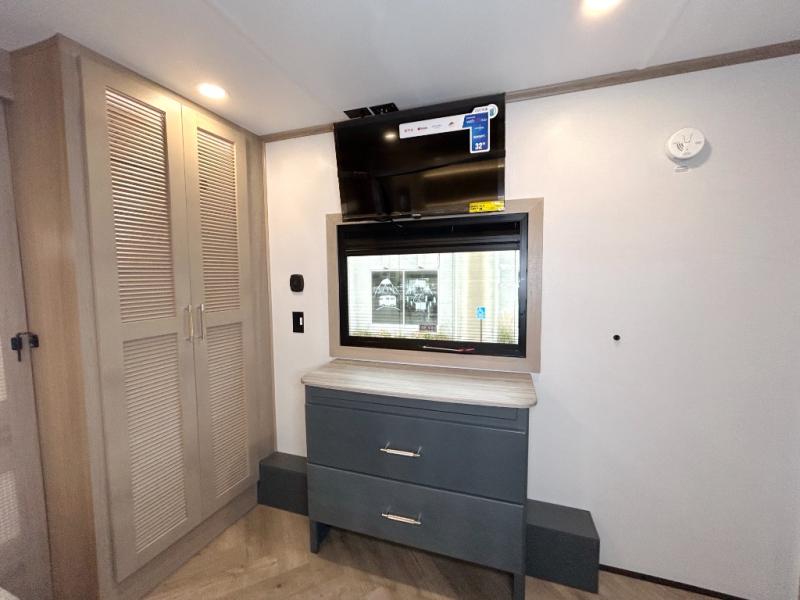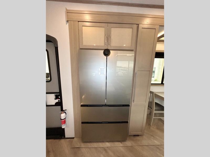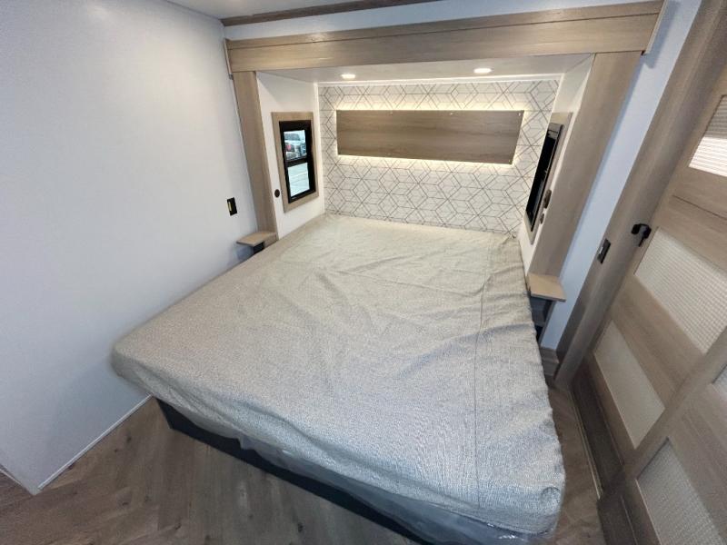 The whole family will love camping in this fifth wheel toy hauler! The front private bedroom has a king bed slide for more interior space, a Smart LED TV, a front large wardrobe, plus washer and dryer prep. Freshen up each morning in the full bathroom with the fiberglass one-piece shower then head to the kitchen to fry up some eggs on the four-burner range and bake some cinnamon rolls in the 24" stainless steel oven. Grab a cold cup of orange juice from the 20-cu. ft. 12-volt refrigerator and enjoy it along with the eggs at the dinette table or in the 15' garage on one of the dual opposing sofas with cupholders. The L-shaped hide-a-bed sofa is conveniently across from the entertainment center with a 50" Smart LED TV and fireplace. As you head into the 15' garage area, you will notice a loft with a twin bed, a queen bed above the opposing sofas, Adjust-A-Track frame welded tie downs, and one of the dual entry doors to the unit!