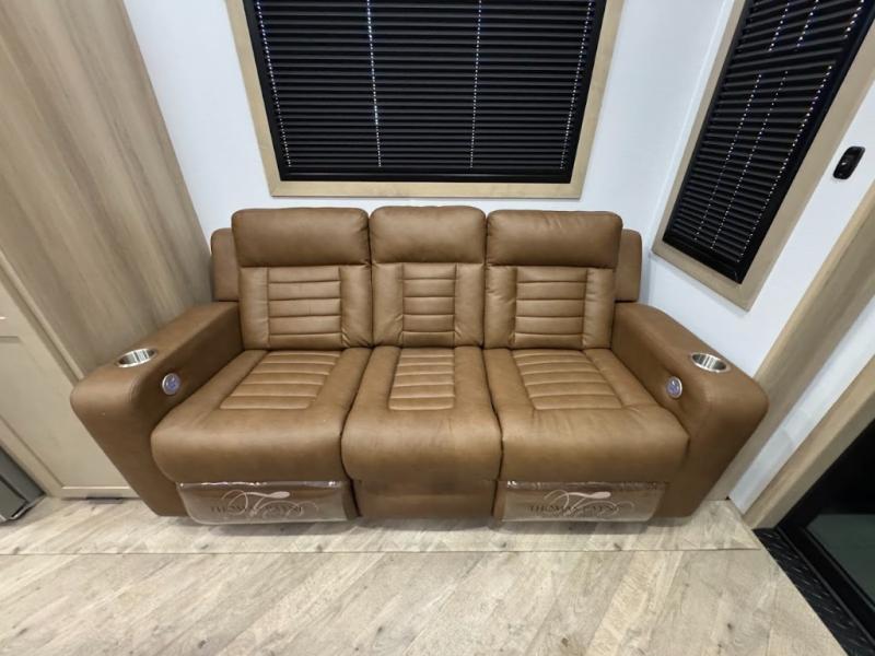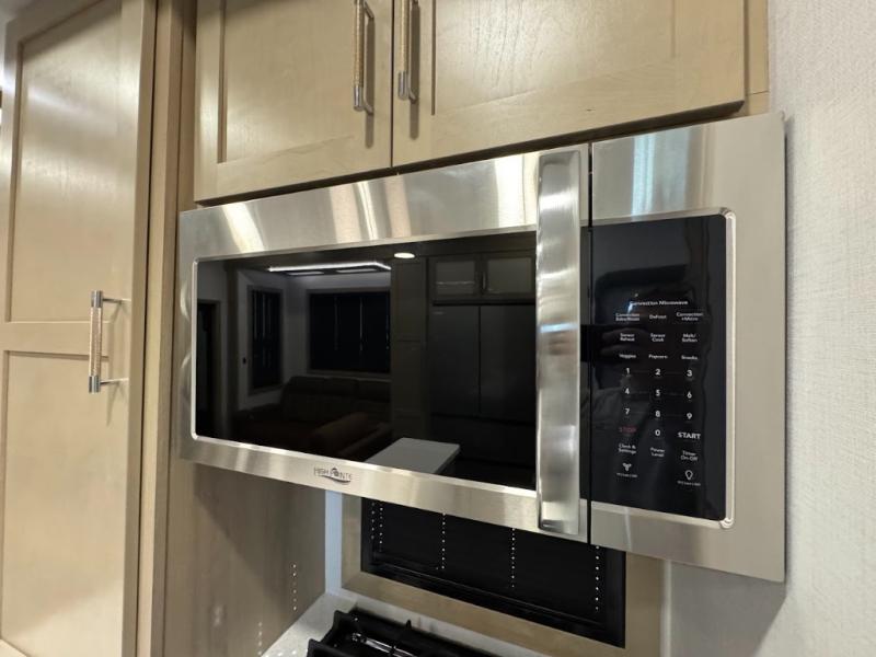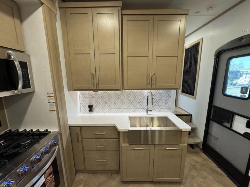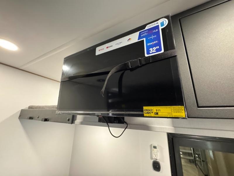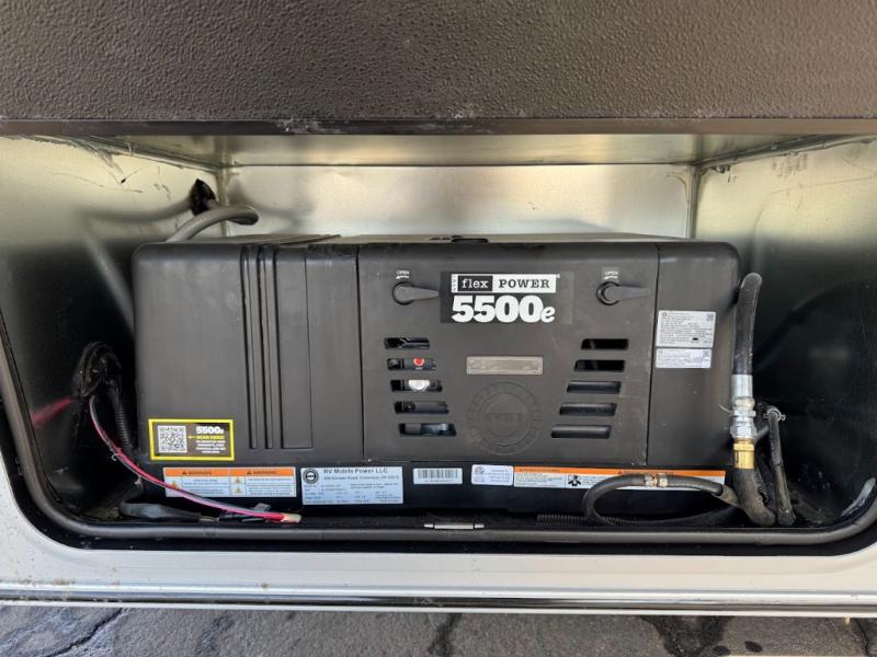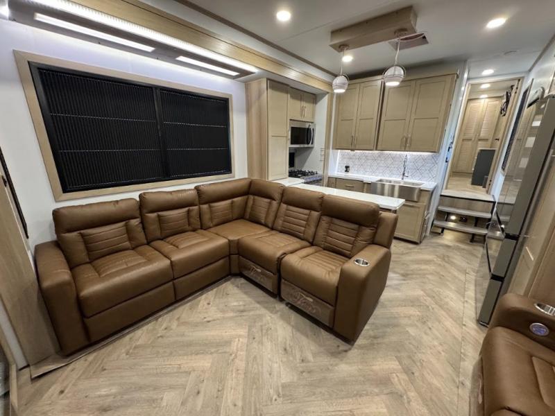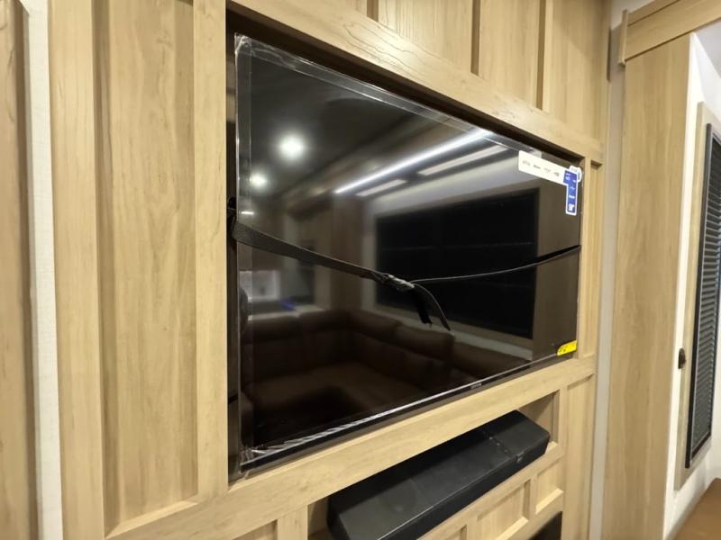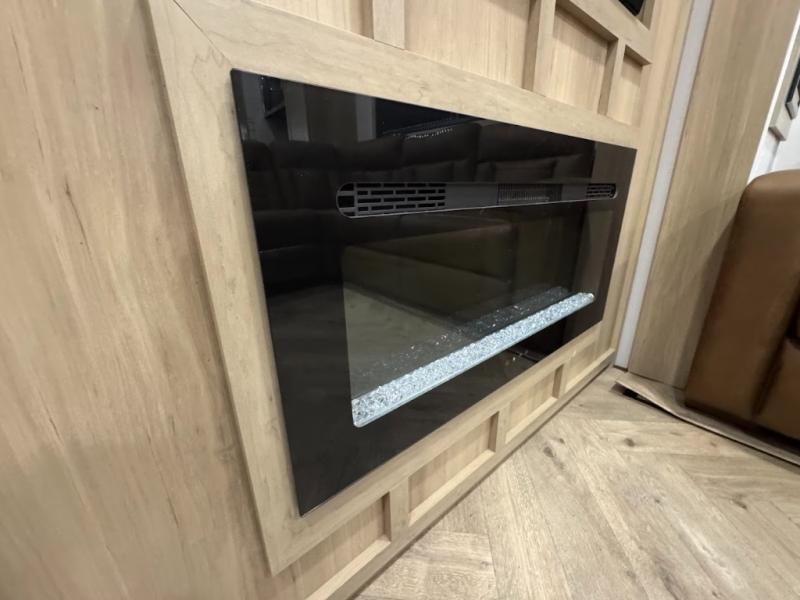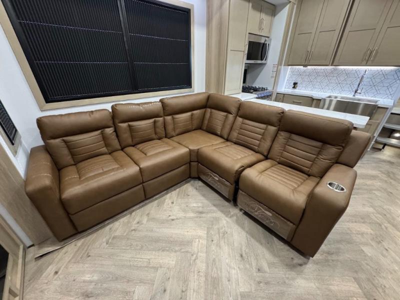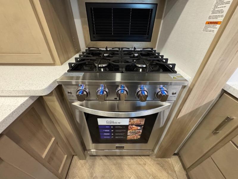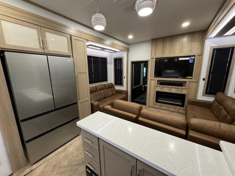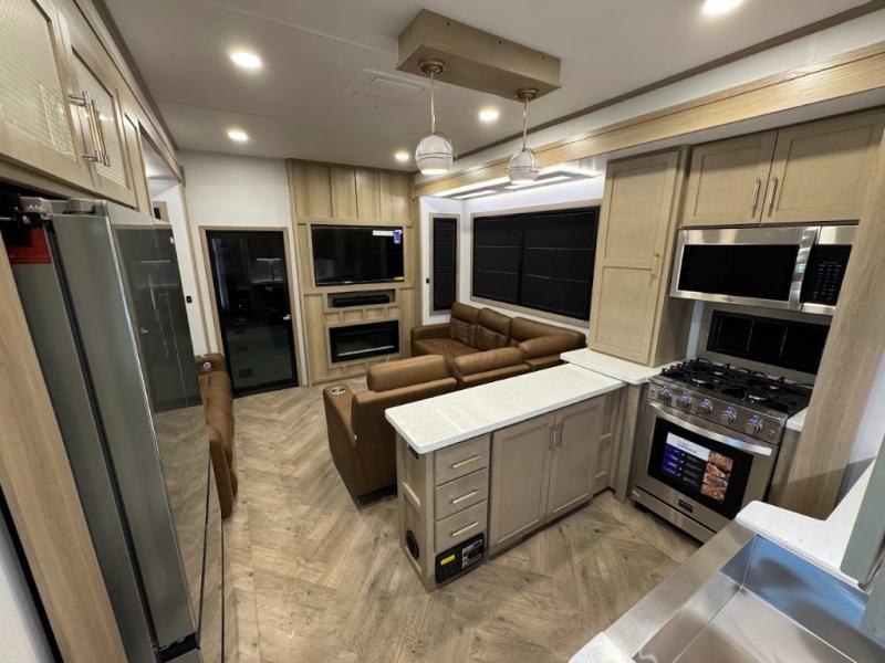 The whole family will love camping in this fifth wheel toy hauler! The front private bedroom has a king bed slide for more interior space, a Smart LED TV, a front large wardrobe, plus washer and dryer prep. Freshen up each morning in the full bathroom with the fiberglass one-piece shower then head to the kitchen to fry up some eggs on the four-burner range and bake some cinnamon rolls in the 24" stainless steel oven. Grab a cold cup of orange juice from the 20-cu. ft. 12-volt refrigerator and enjoy it along with the eggs at the dinette table or in the 15' garage on one of the dual opposing sofas with cupholders. The L-shaped hide-a-bed sofa is conveniently across from the entertainment center with a 50" Smart LED TV and fireplace. As you head into the 15' garage area, you will notice a loft with a twin bed, a queen bed above the opposing sofas, Adjust-A-Track frame welded tie downs, and one of the dual entry doors to the unit!