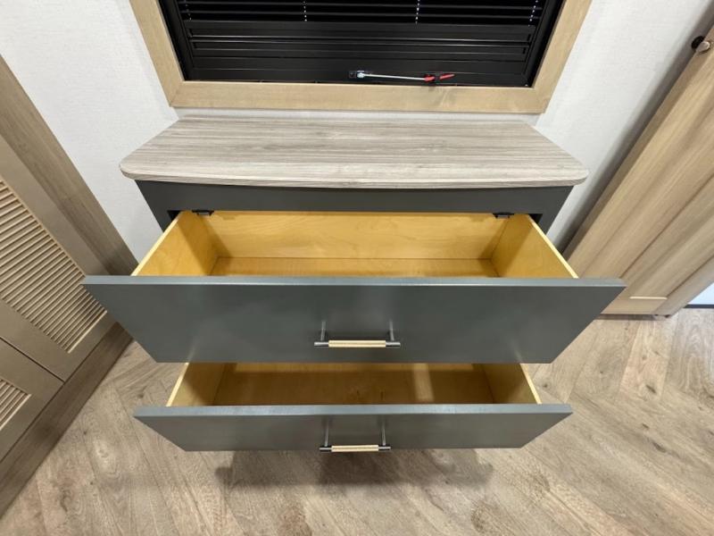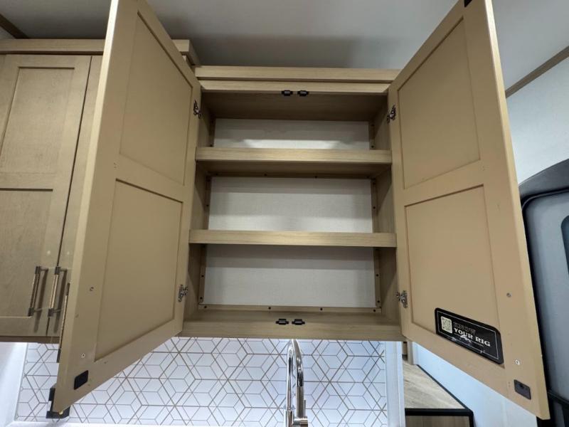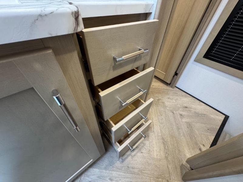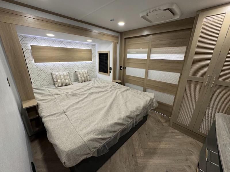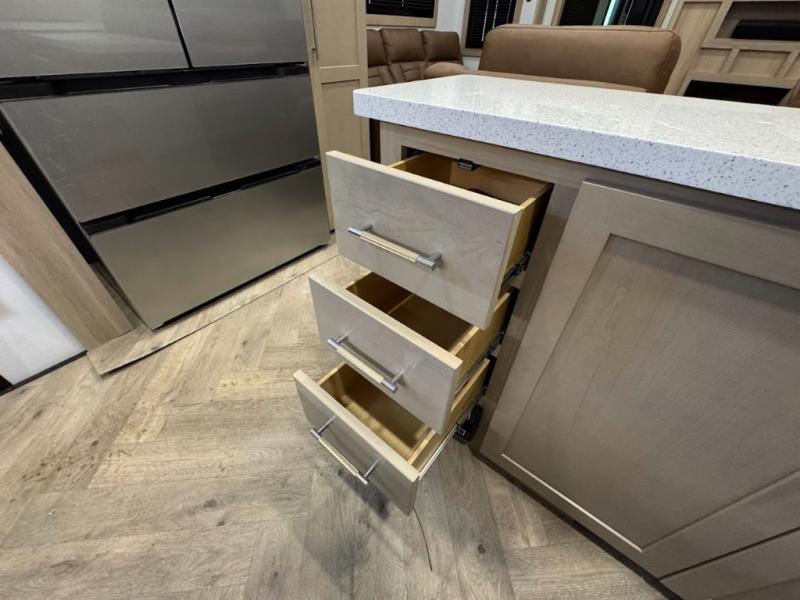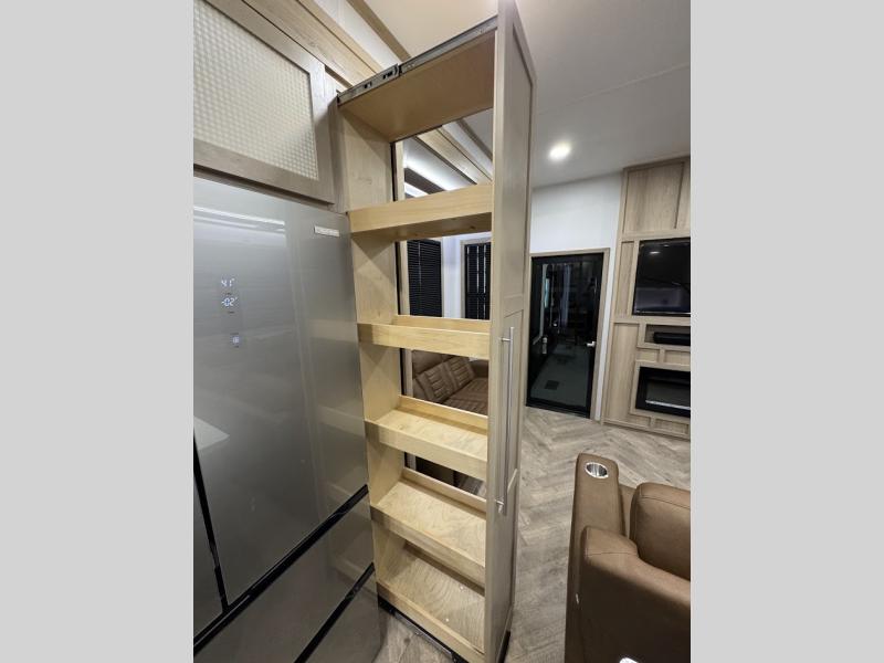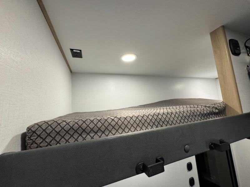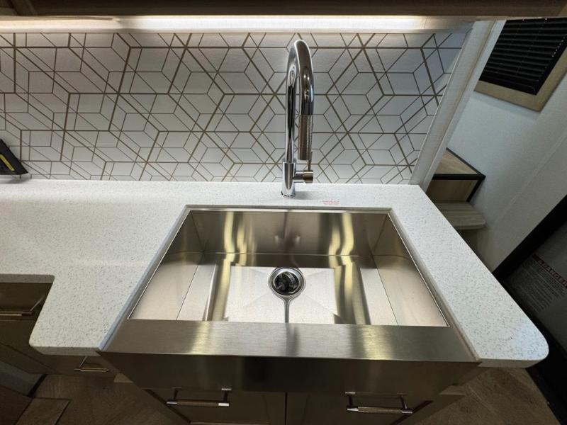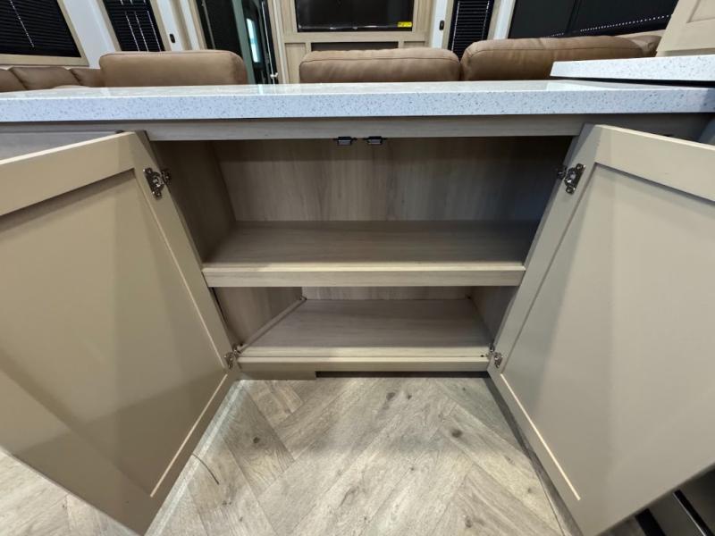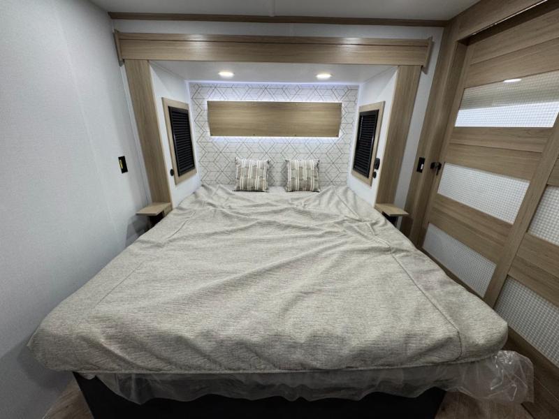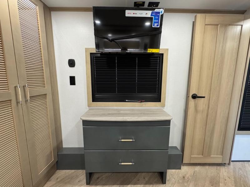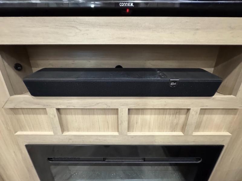 The whole family will love camping in this fifth wheel toy hauler! The front private bedroom has a king bed slide for more interior space, a Smart LED TV, a front large wardrobe, plus washer and dryer prep. Freshen up each morning in the full bathroom with the fiberglass one-piece shower then head to the kitchen to fry up some eggs on the four-burner range and bake some cinnamon rolls in the 24" stainless steel oven. Grab a cold cup of orange juice from the 20-cu. ft. 12-volt refrigerator and enjoy it along with the eggs at the dinette table or in the 15' garage on one of the dual opposing sofas with cupholders. The L-shaped hide-a-bed sofa is conveniently across from the entertainment center with a 50" Smart LED TV and fireplace. As you head into the 15' garage area, you will notice a loft with a twin bed, a queen bed above the opposing sofas, Adjust-A-Track frame welded tie downs, and one of the dual entry doors to the unit!