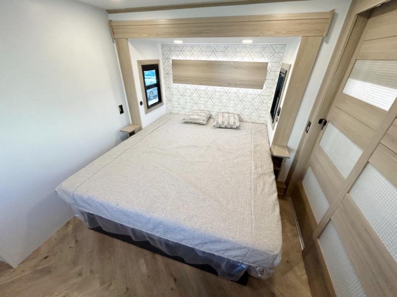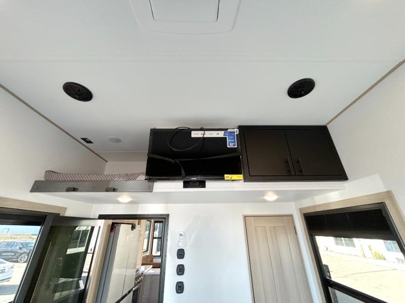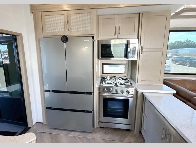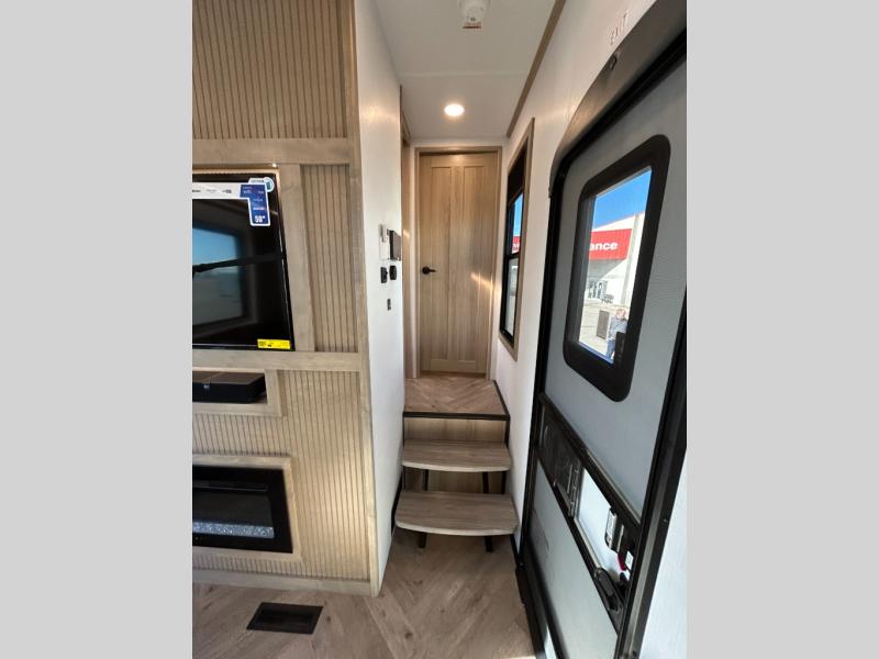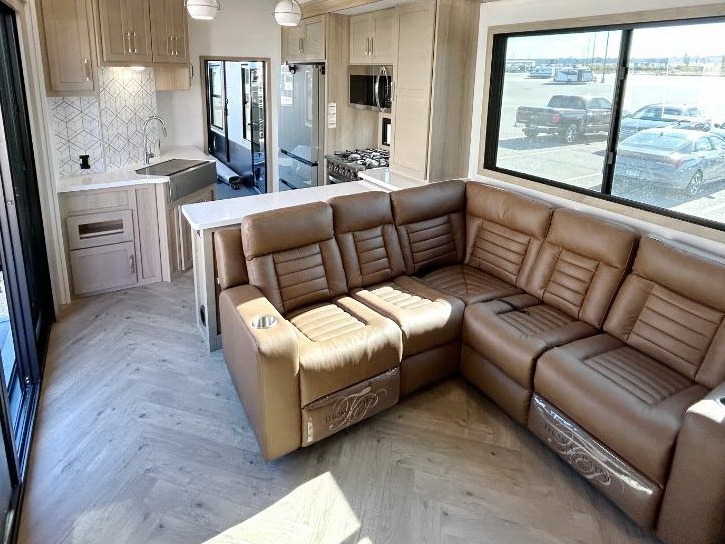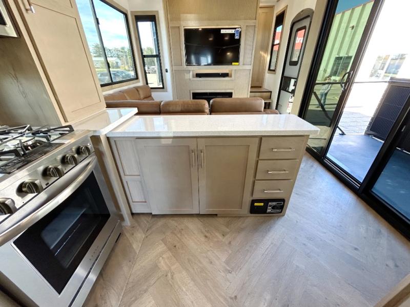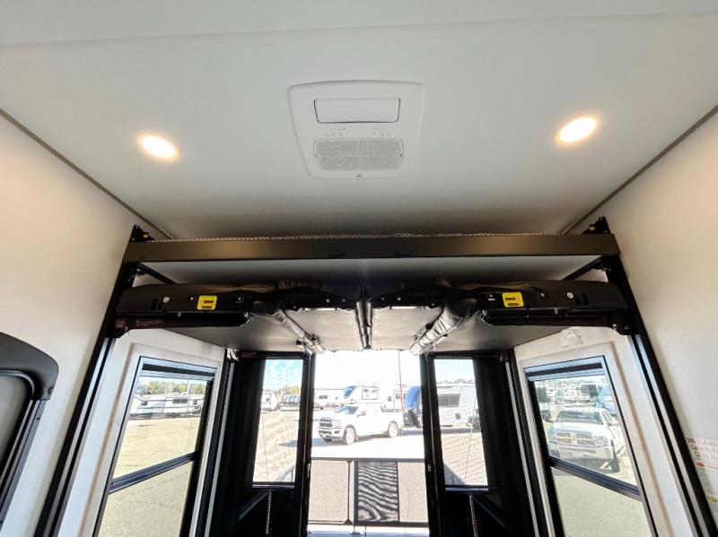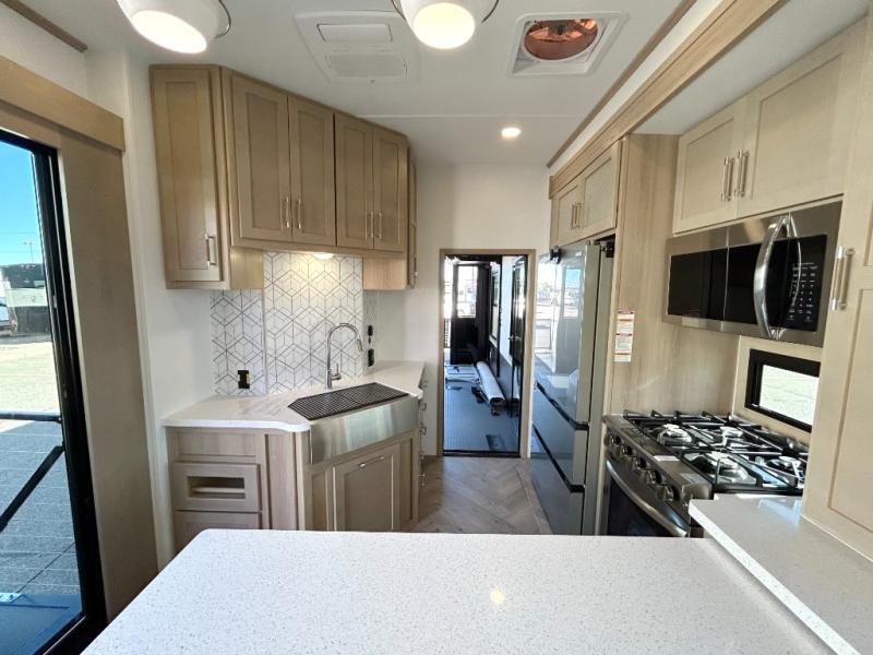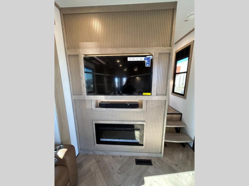 Everyone will love camping in this fifth wheel toy hauler! The front private bedroom has a king bed slide for more interior space, a Smart LED TV, a front large master closet, plus washer and dryer prep. Freshen up each morning in the full bathroom with the fiberglass one-piece shower then head to the kitchen to fry up some eggs on the four-burner range and bake a tasty treat in the 24" stainless steel oven. Grab a cold one from the 20-cu. ft.12-volt refrigerator and even enjoy it outdoors thanks to the three awnings. The L-shaped sofa is conveniently across from the entertainment center with a 50" Smart LED TV and fireplace. As you head into the garage area, you will notice a loft with a twin bed, a queen bed above the opposing sofas, and one of the dual entry doors to the unit!