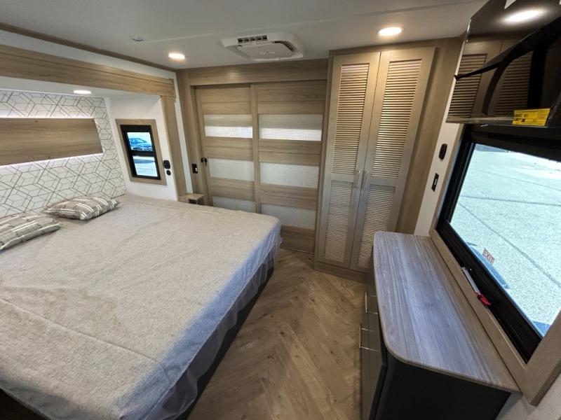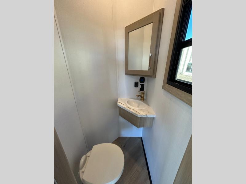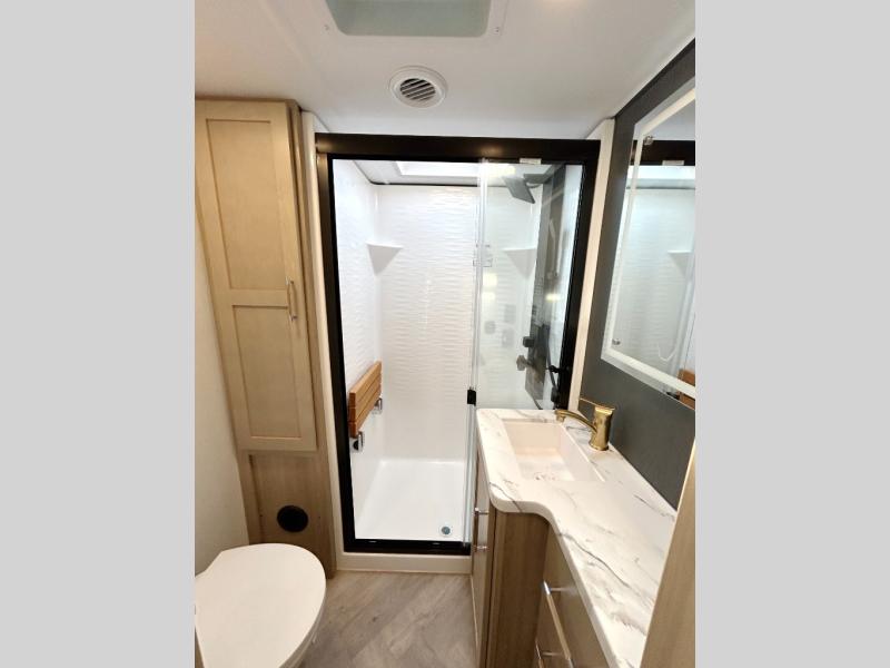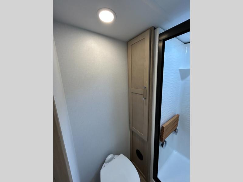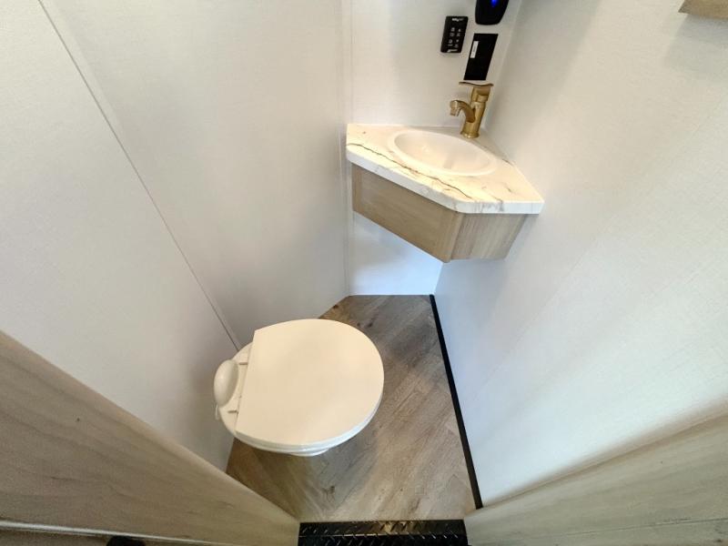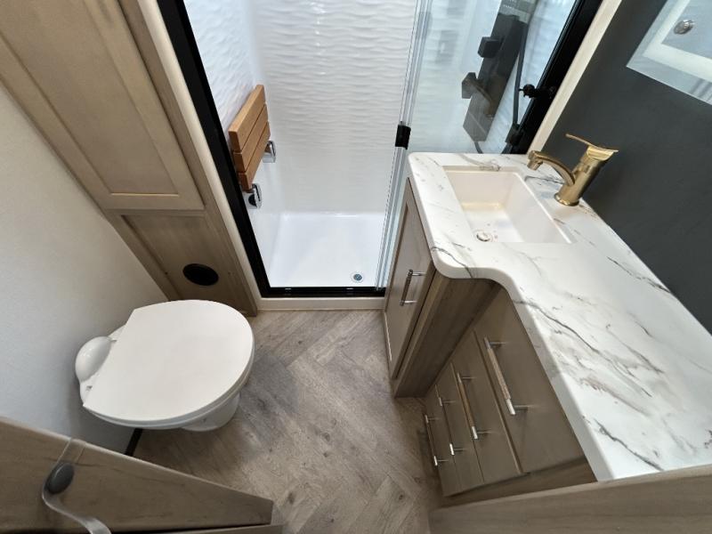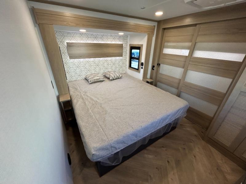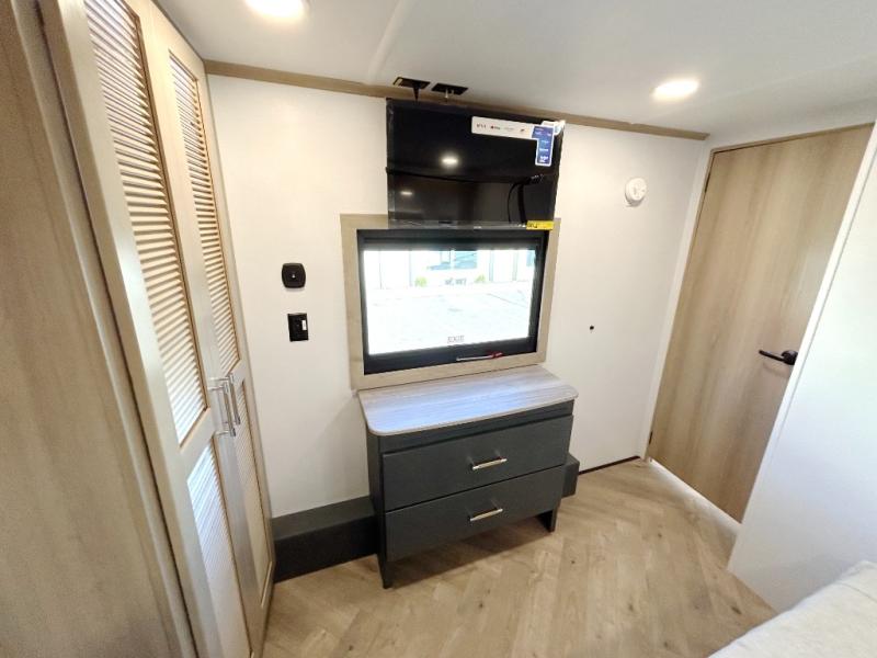 Everyone will love camping in this fifth wheel toy hauler! The front private bedroom has a king bed slide for more interior space, a Smart LED TV, a front large master closet, plus washer and dryer prep. Freshen up each morning in the full bathroom with the fiberglass one-piece shower then head to the kitchen to fry up some eggs on the four-burner range and bake a tasty treat in the 24" stainless steel oven. Grab a cold one from the 20-cu. ft.12-volt refrigerator and even enjoy it outdoors thanks to the three awnings. The L-shaped sofa is conveniently across from the entertainment center with a 50" Smart LED TV and fireplace. As you head into the garage area, you will notice a loft with a twin bed, a queen bed above the opposing sofas, and one of the dual entry doors to the unit!