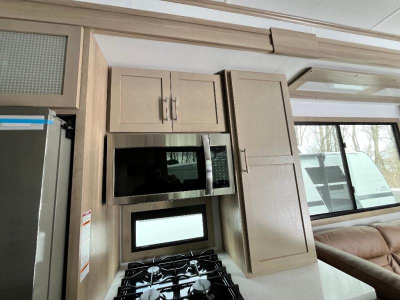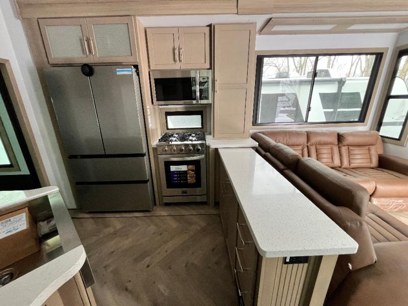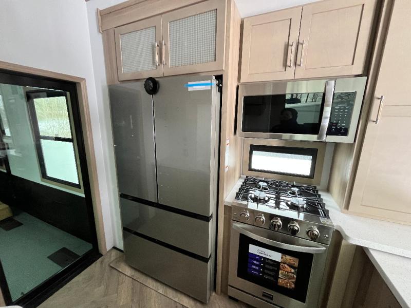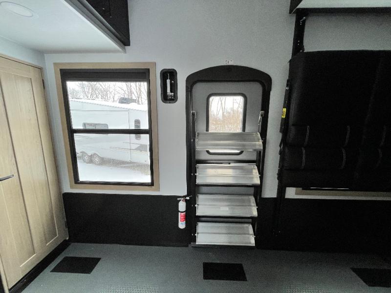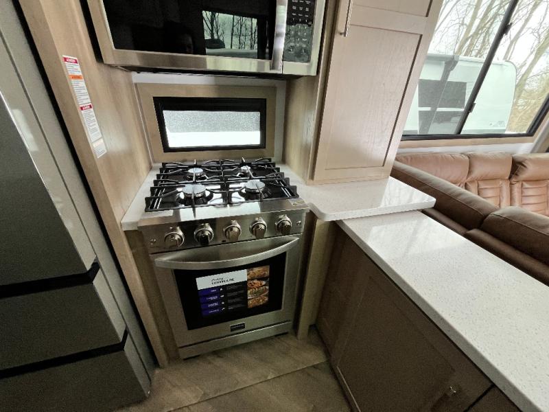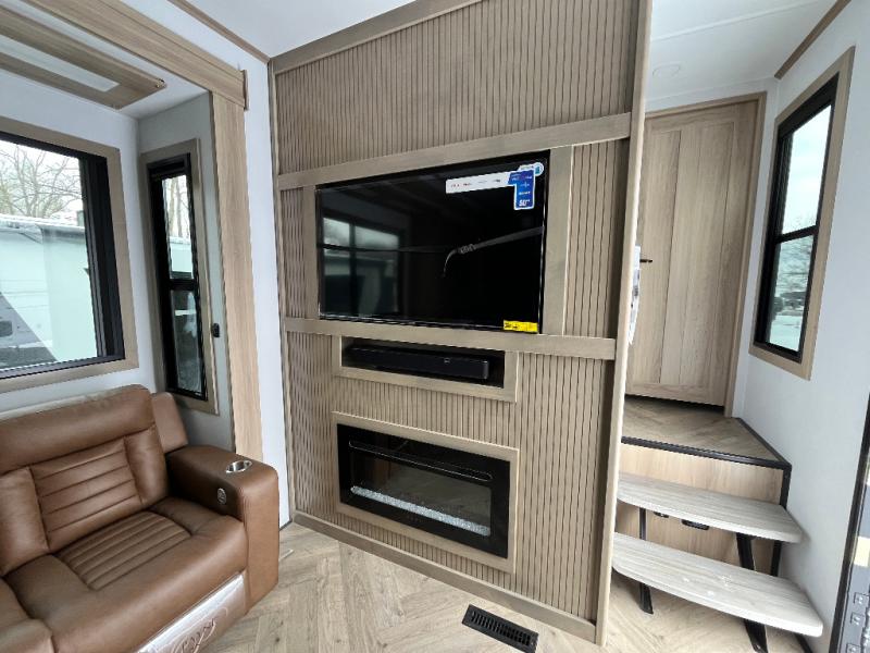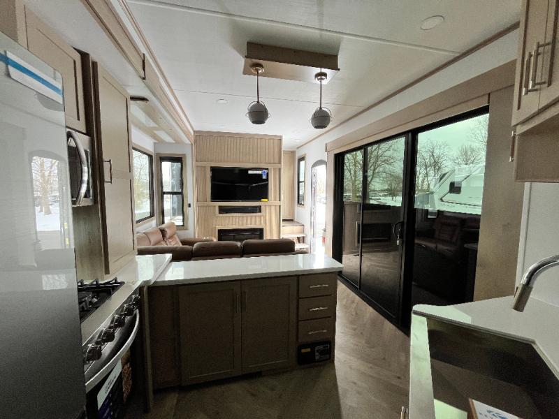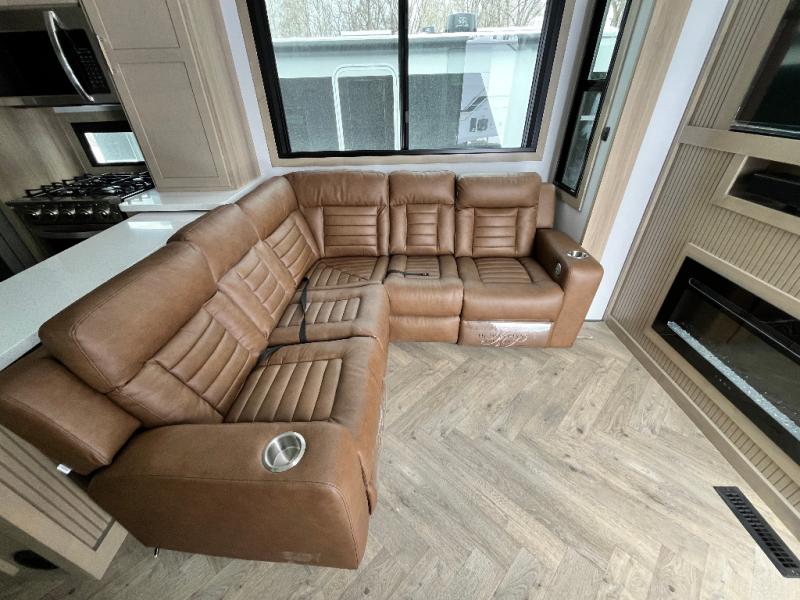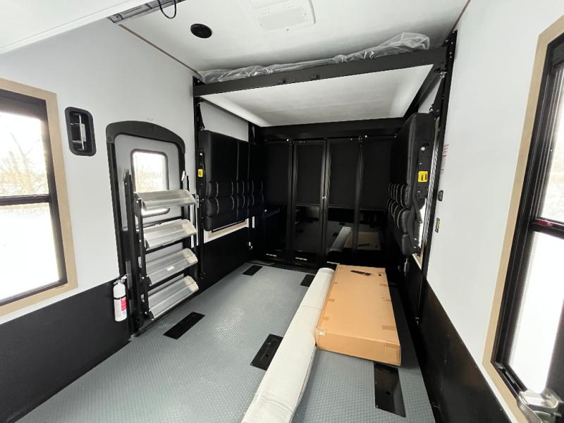 Everyone will love camping in this fifth wheel toy hauler! The front private bedroom has a king bed slide for more interior space, a Smart LED TV, a front large master closet, plus washer and dryer prep. Freshen up each morning in the full bathroom with the fiberglass one-piece shower then head to the kitchen to fry up some eggs on the four-burner range and bake a tasty treat in the 24" stainless steel oven. Grab a cold one from the 20-cu. ft.12-volt refrigerator and even enjoy it outdoors thanks to the three awnings. The L-shaped sofa is conveniently across from the entertainment center with a 50" Smart LED TV and fireplace. As you head into the garage area, you will notice a loft with a twin bed, a queen bed above the opposing sofas, and one of the dual entry doors to the unit!