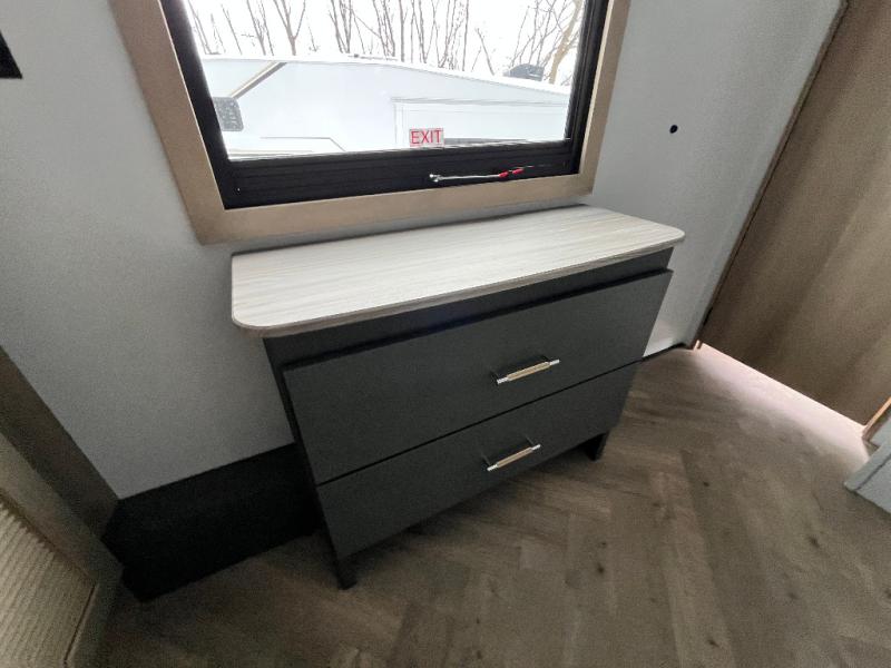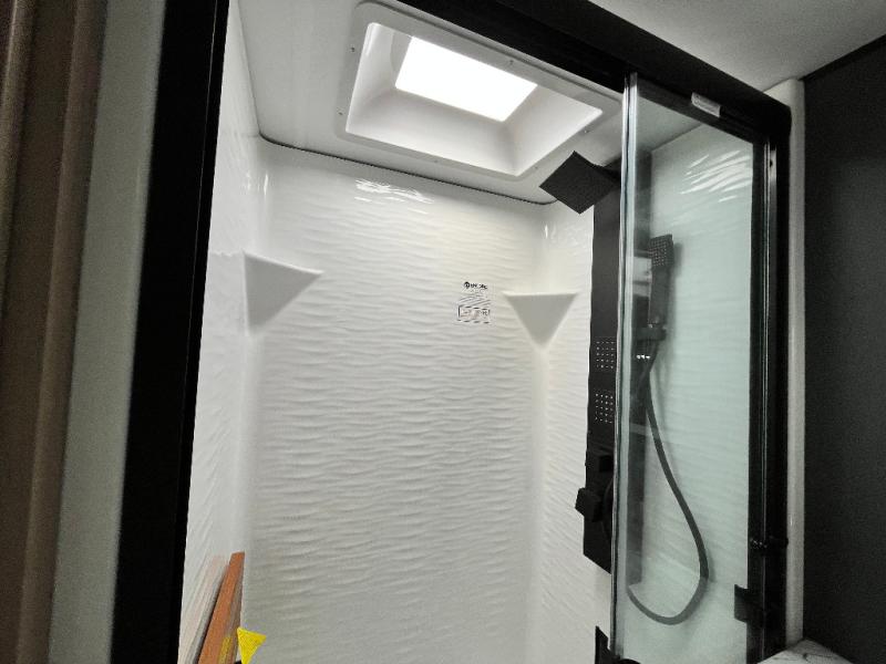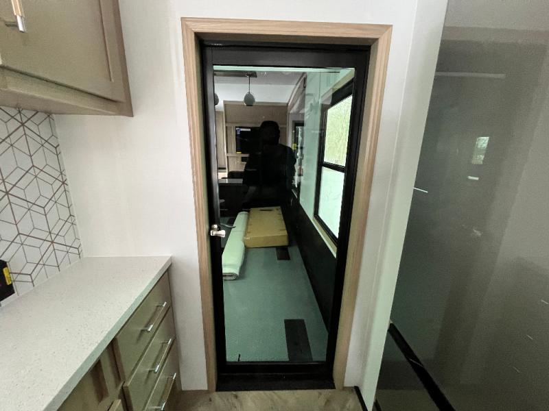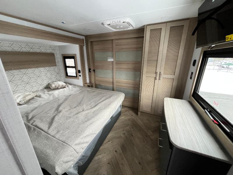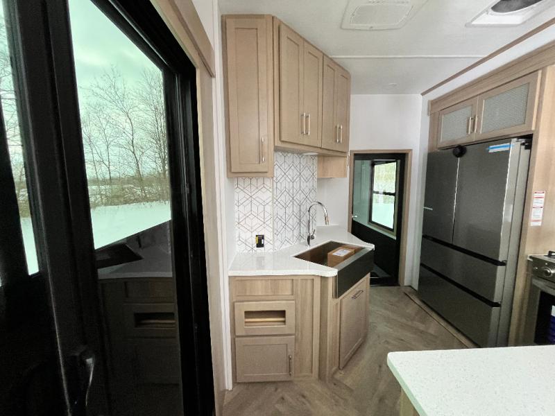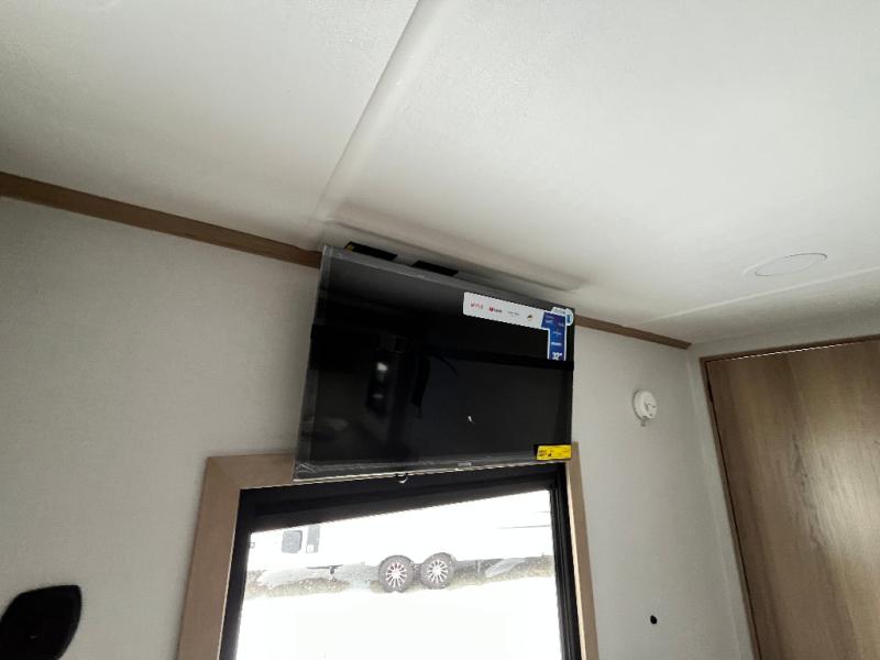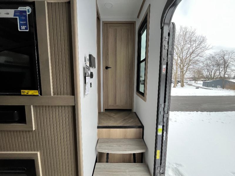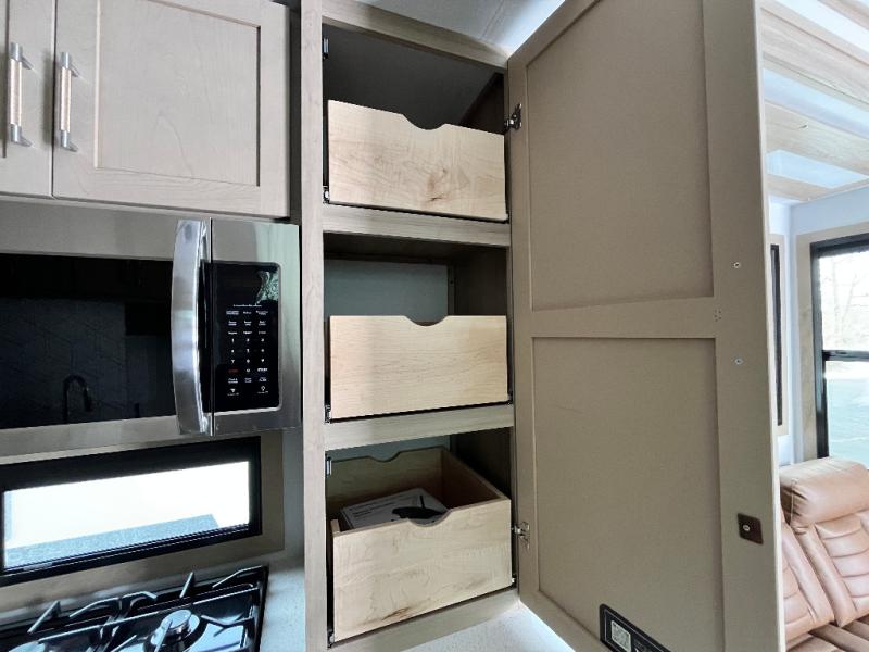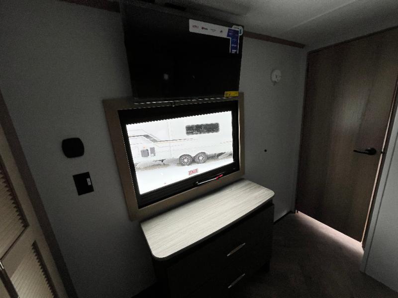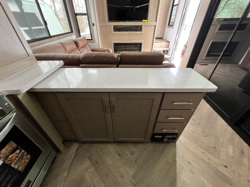 Everyone will love camping in this fifth wheel toy hauler! The front private bedroom has a king bed slide for more interior space, a Smart LED TV, a front large master closet, plus washer and dryer prep. Freshen up each morning in the full bathroom with the fiberglass one-piece shower then head to the kitchen to fry up some eggs on the four-burner range and bake a tasty treat in the 24" stainless steel oven. Grab a cold one from the 20-cu. ft.12-volt refrigerator and even enjoy it outdoors thanks to the three awnings. The L-shaped sofa is conveniently across from the entertainment center with a 50" Smart LED TV and fireplace. As you head into the garage area, you will notice a loft with a twin bed, a queen bed above the opposing sofas, and one of the dual entry doors to the unit!