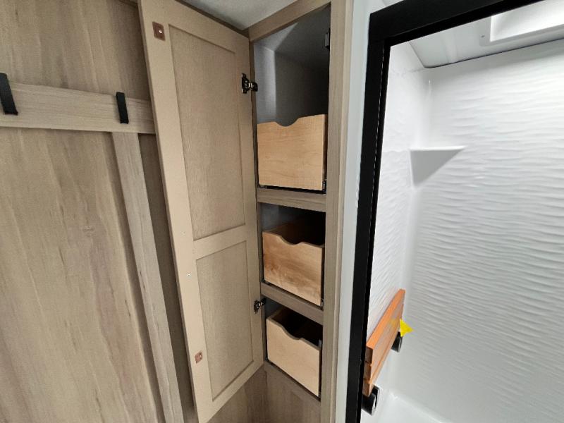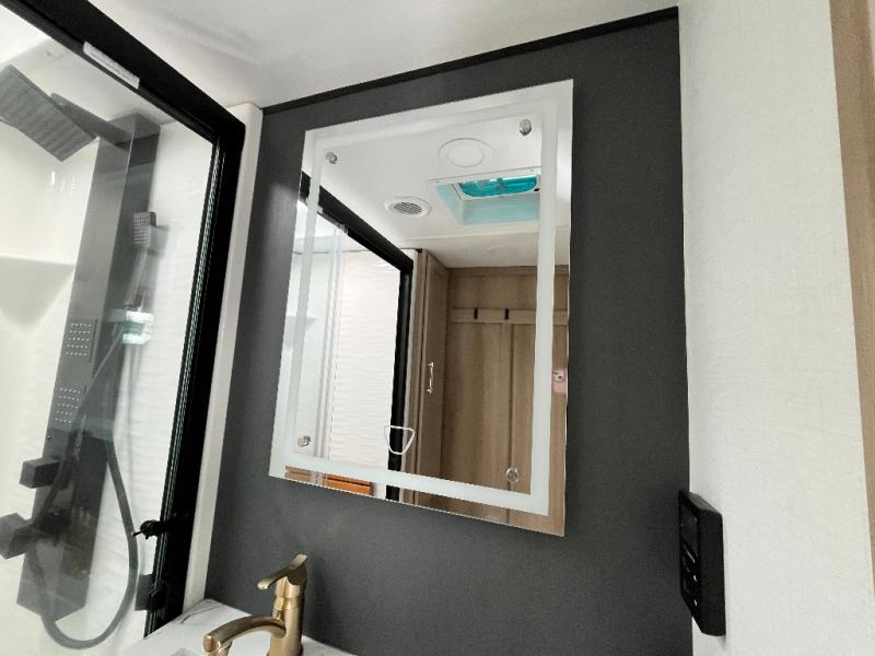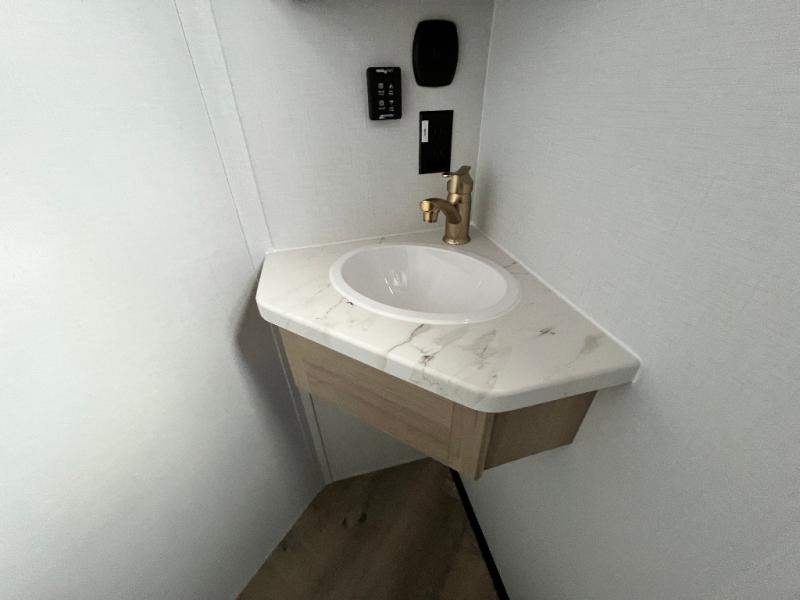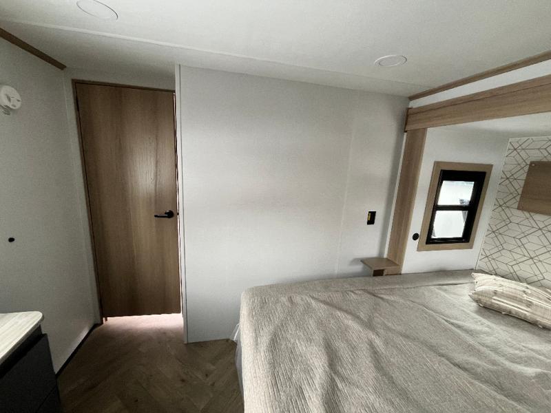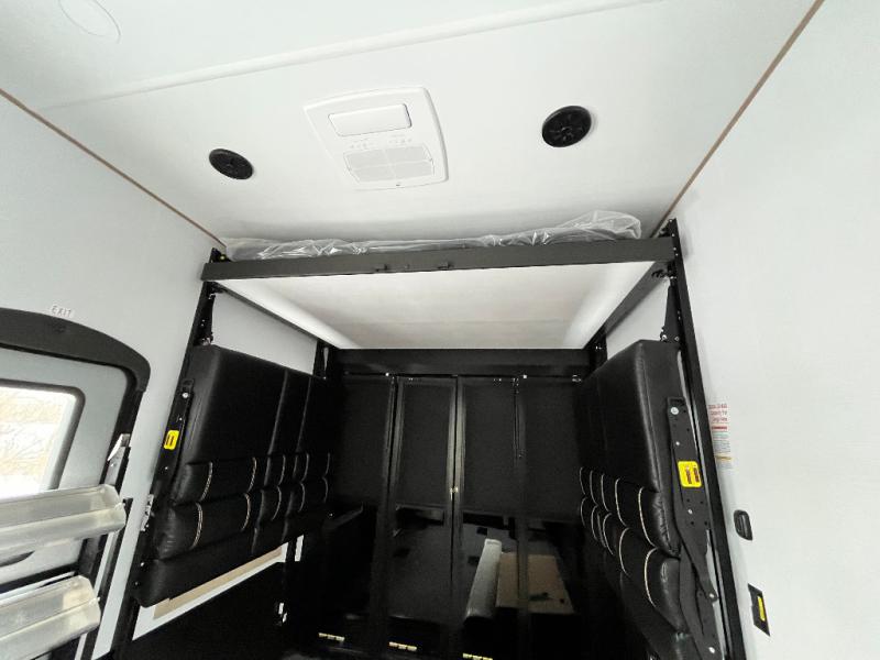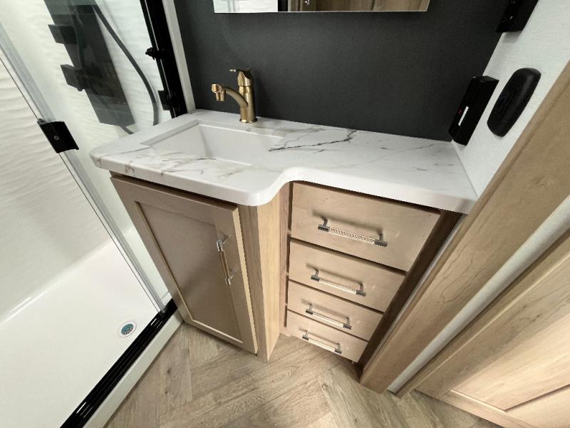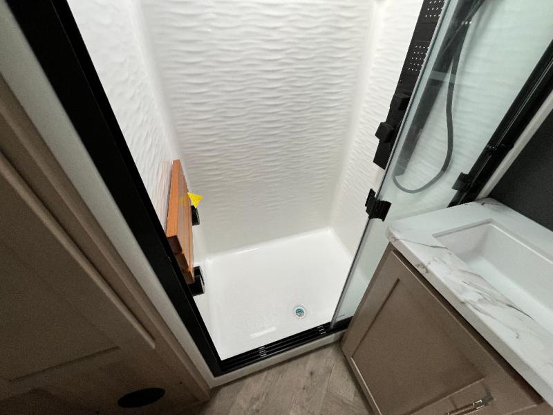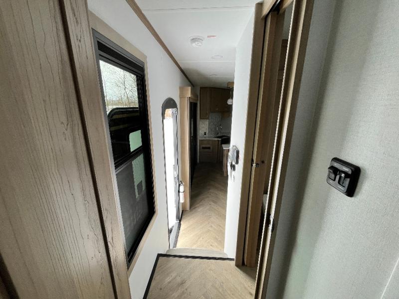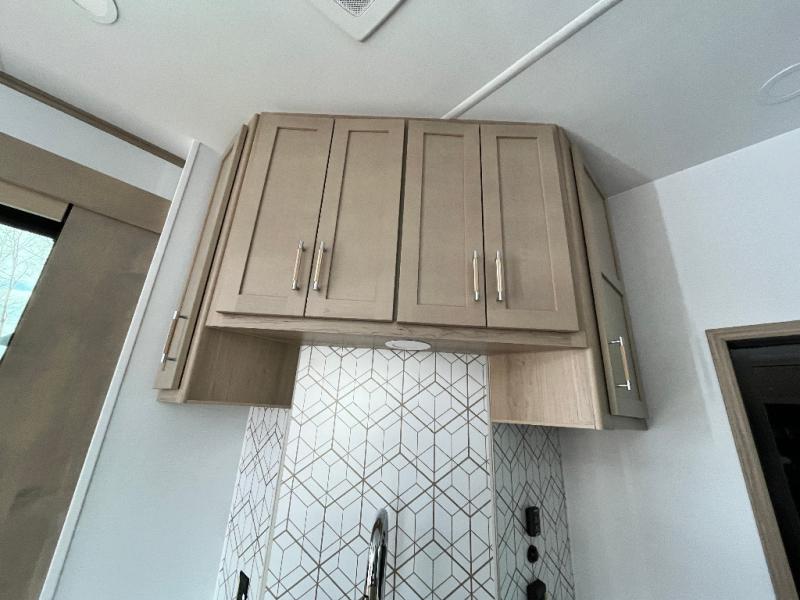 Everyone will love camping in this fifth wheel toy hauler! The front private bedroom has a king bed slide for more interior space, a Smart LED TV, a front large master closet, plus washer and dryer prep. Freshen up each morning in the full bathroom with the fiberglass one-piece shower then head to the kitchen to fry up some eggs on the four-burner range and bake a tasty treat in the 24" stainless steel oven. Grab a cold one from the 20-cu. ft.12-volt refrigerator and even enjoy it outdoors thanks to the three awnings. The L-shaped sofa is conveniently across from the entertainment center with a 50" Smart LED TV and fireplace. As you head into the garage area, you will notice a loft with a twin bed, a queen bed above the opposing sofas, and one of the dual entry doors to the unit!