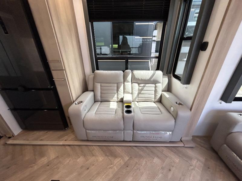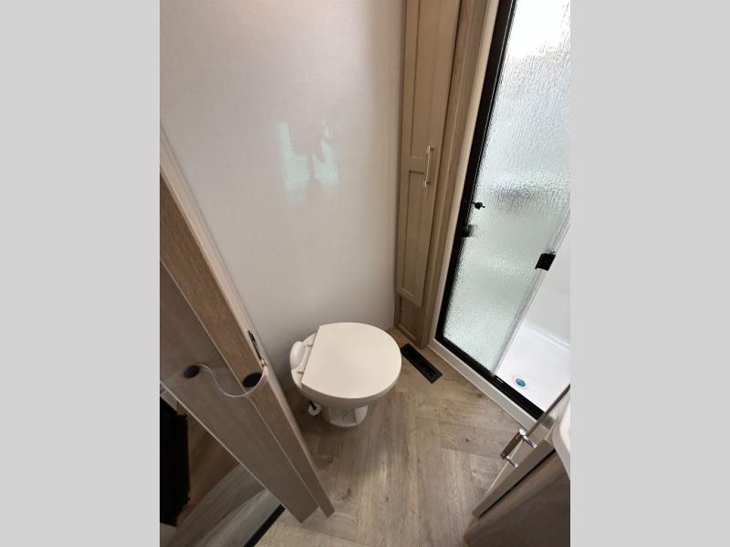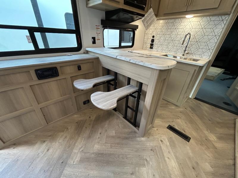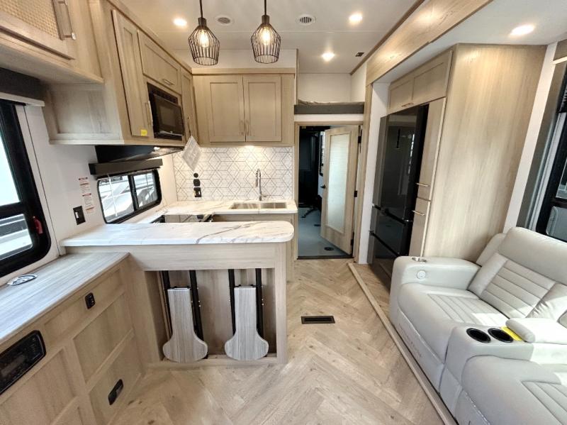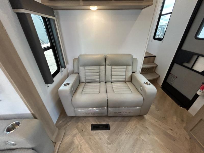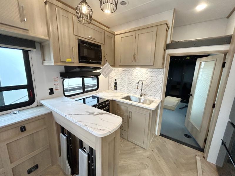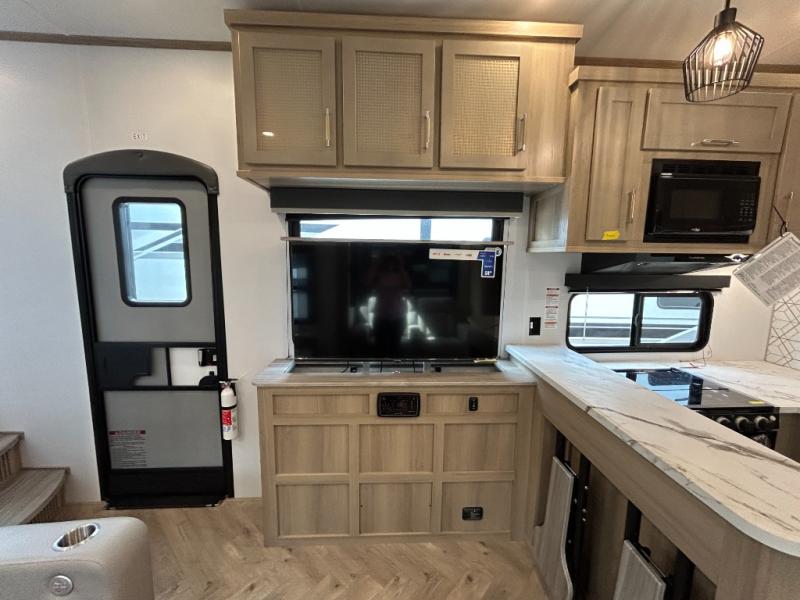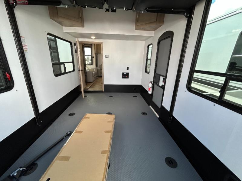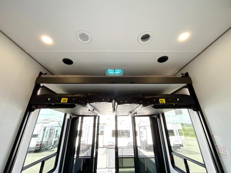 Trips to the lake with friends and family just got better with this toy hauler in tow! Once you've unloaded your toys from the 13' separate garage, head out to kick up some mud! The full bath with a 40" x 28" shower will be waiting for you when you return, and you can turn the garage into living space with its dual opposing sofas. There is also an electric bed here plus a loft with a twin bed for guests to sleep on. The combined kitchen and living area is also a place where everyone can gather thanks to the two double-seat sofas and raised bar with flip-up seats. And you'll find the front private bedroom to be ultra cozy with its king bed, slide out wardrobe with drawers, plus two additional wardrobes on either side of the bed. There is even nightstands with wireless phone chargers; how convenient!