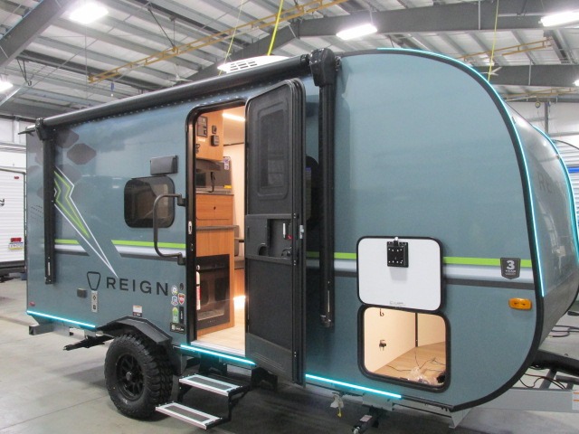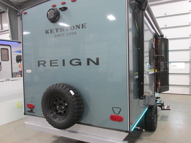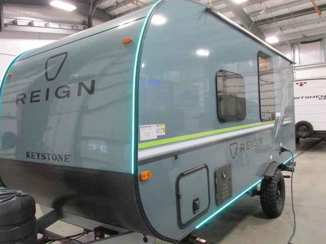 The Reign travel trailers by Keystone are premium single-axle units that are sure to make an impression at the campground. Each one is built with an exclusive automotive-finished aluminum exterior, a walkable roof, and a 100% composite floor for added durability. There are also tinted safety glass windows, quick drop stabilizer jacks, and an exterior shower with hot and cold water. The European inspired interior design is unique and cozy, and the 78" interior height will give you plenty of space to move about. You will also enjoy the ultra bright LED light strip and solid surface countertops in the kitchen, along with blackout night shades, and many more interior comforts.