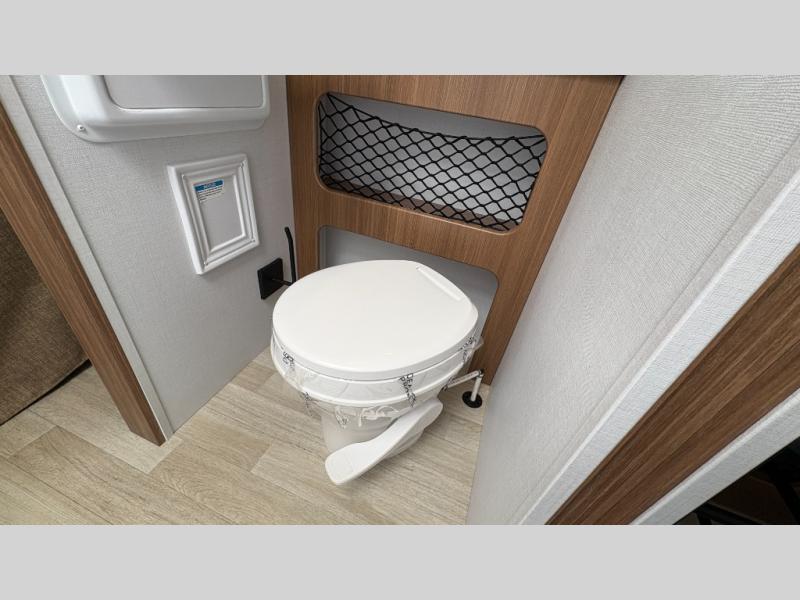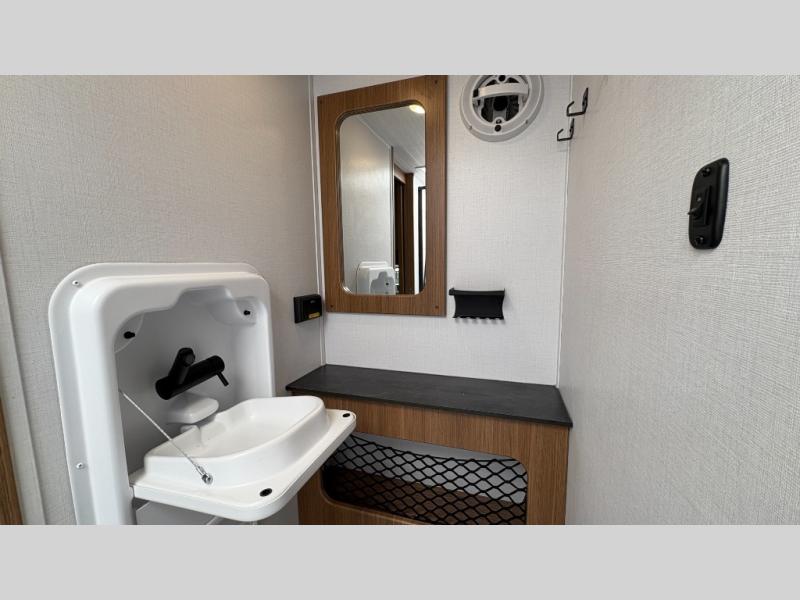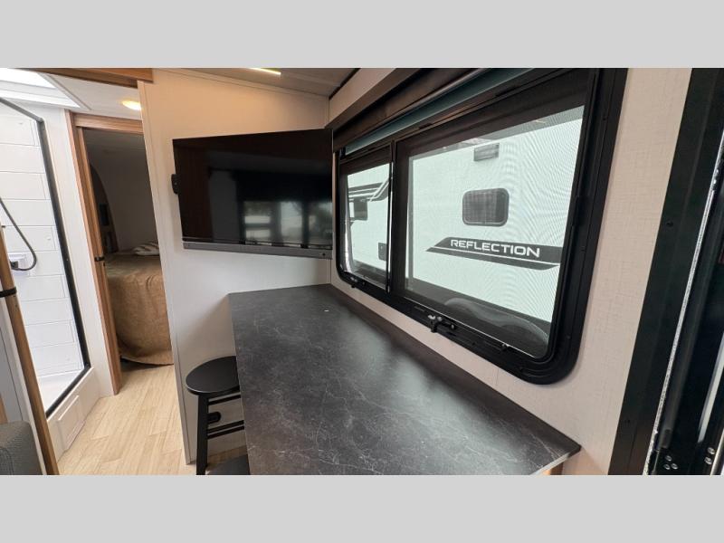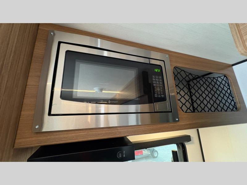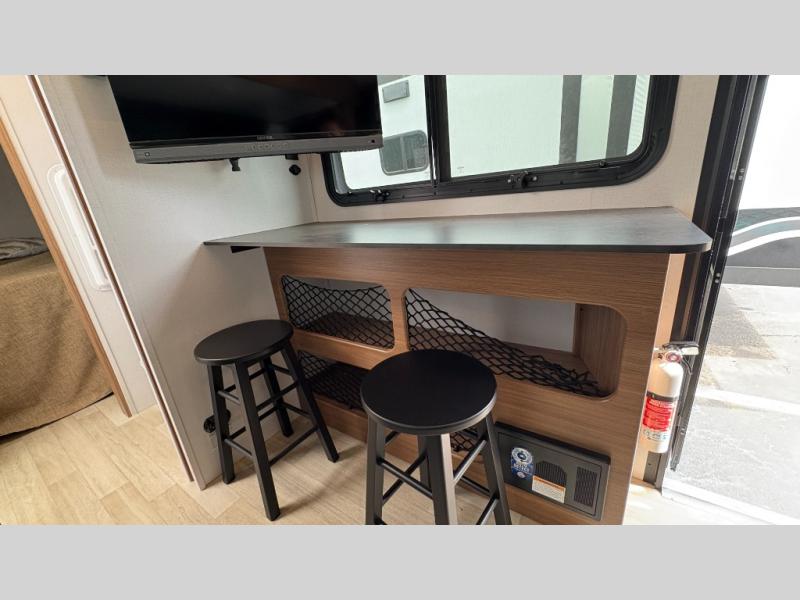 You will love this travel trailer's stunning rear kitchen design! The theater dinette provides a comfortable spot for meals and relaxation, while the bar countertop with stools offers a space for socializing and enjoying drinks. Also, overhead cabinets provide ample storage for your kitchen essentials. In the center of this travel trailer, the walkthrough bathroom features a convenient flip-down sink and linen closet, making it easy to get ready and stay organized. Moreover, the front bedroom is a serene retreat, featuring a spacious 60” x 74” bed with cubbies beside the bed for storing your favorite books, glasses, or other personal items. Plus, a 13' awning provides shade and protection from the elements, creating a comfortable outdoor living space.