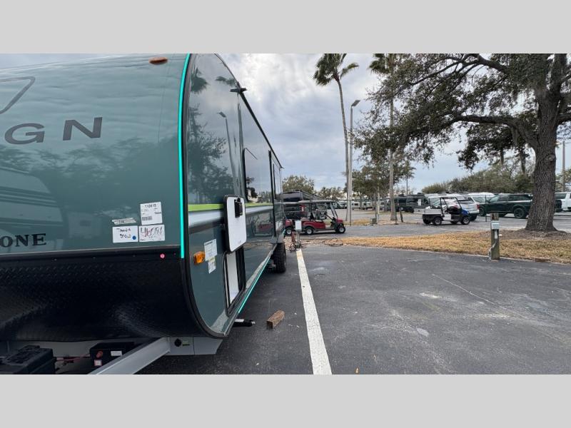 The Reign travel trailers by Keystone are premium single-axle units that are sure to make an impression at the campground. Each one is built with an exclusive automotive-finished aluminum exterior, a walkable roof, and a 100% composite floor for added durability. There are also tinted safety glass windows, quick drop stabilizer jacks, and an exterior shower with hot and cold water. The European inspired interior design is unique and cozy, and the 78" interior height will give you plenty of space to move about. You will also enjoy the ultra bright LED light strip and solid surface countertops in the kitchen, along with blackout night shades, and many more interior comforts.